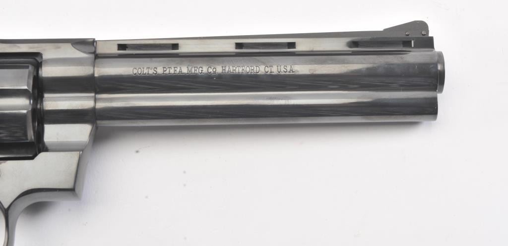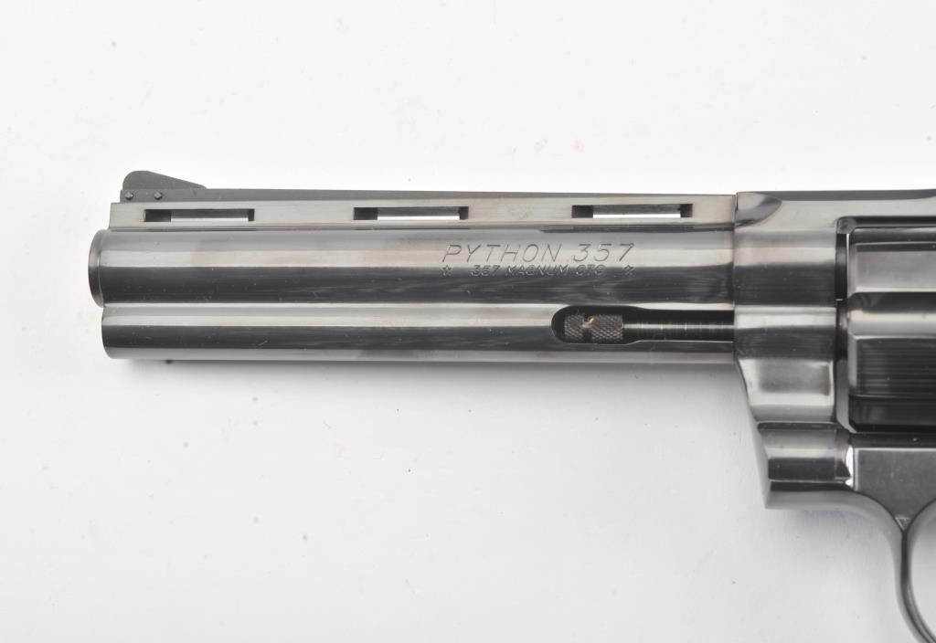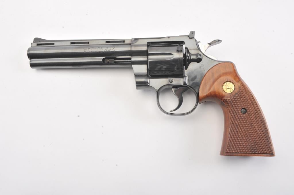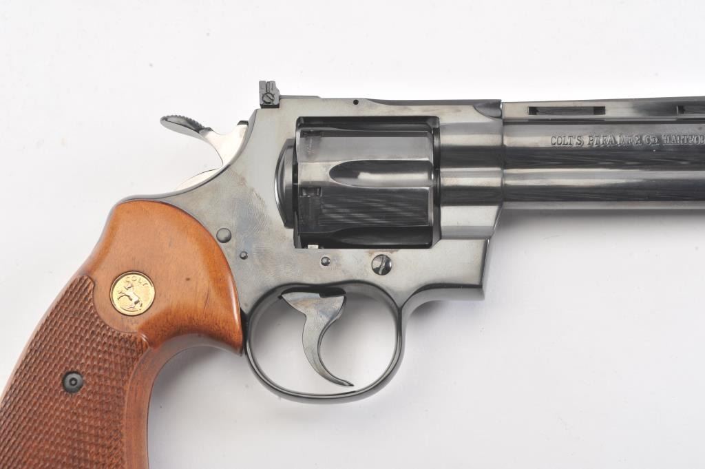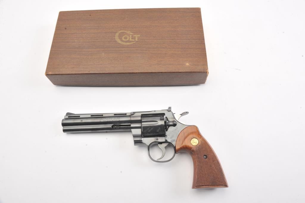 Excellent early Colt Python, #87630, .357 Mag., 6" vent rib barrel, blued finish, adjustable sights with checkered logo grips. This Python is in exceptional condition, retaining 98%+ original finish, minty bore,excellent action, excellent grips with crisp checkering. Manufactured in 1968, with Colt cardboard two piece wood grain, in very good plus condition. (C&R/PPT) Est. $2750-5500