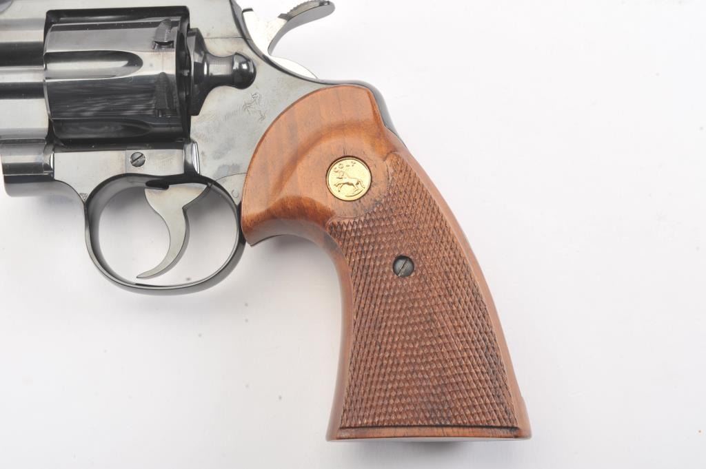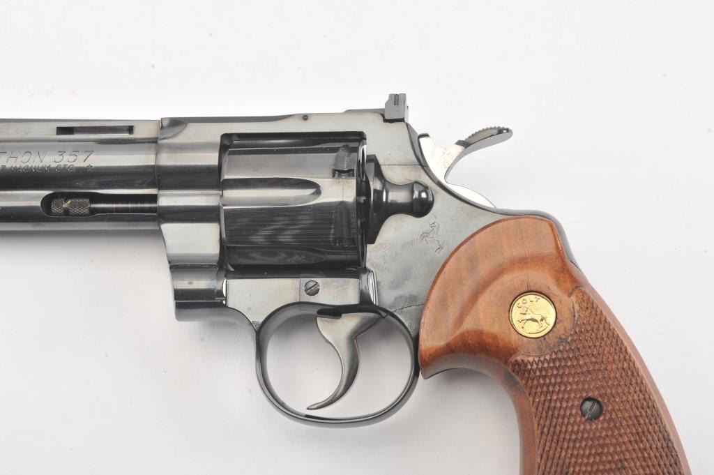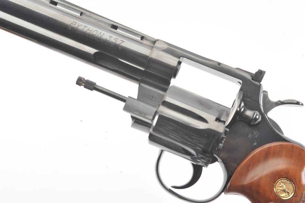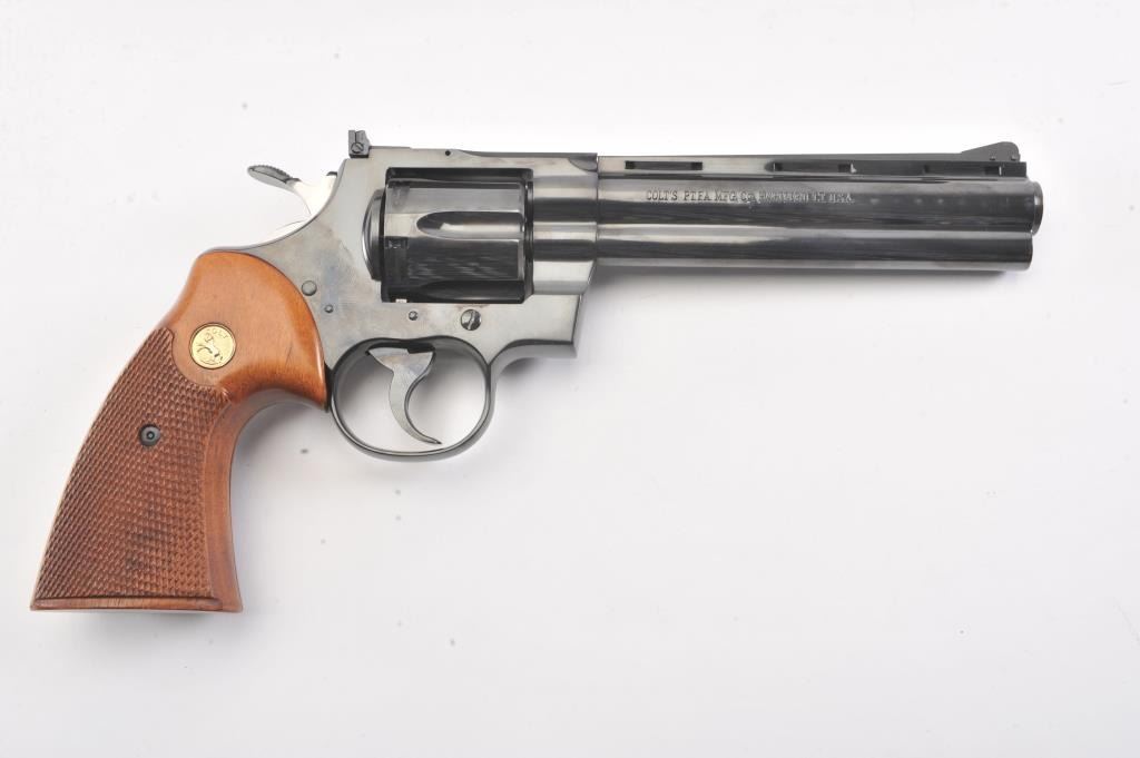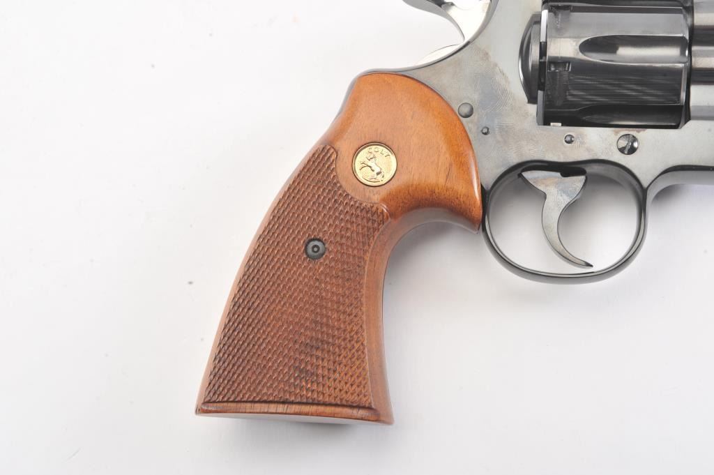 Excellent early Colt Python, #87630, .357 Mag., 6" vent rib barrel, blued finish, adjustable sights with checkered logo grips. This Python is in exceptional condition, retaining 98%+ original finish, minty bore,excellent action, excellent grips with crisp checkering. Manufactured in 1968, with Colt cardboard two piece wood grain, in very good plus condition. (C&R/PPT) Est. $2750-5500