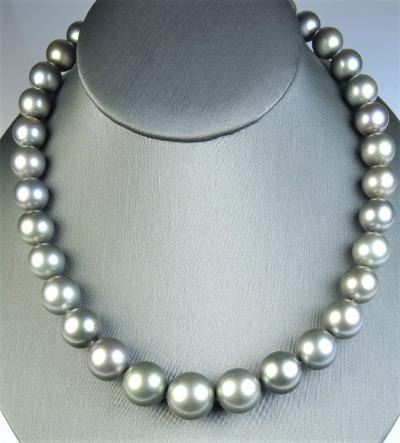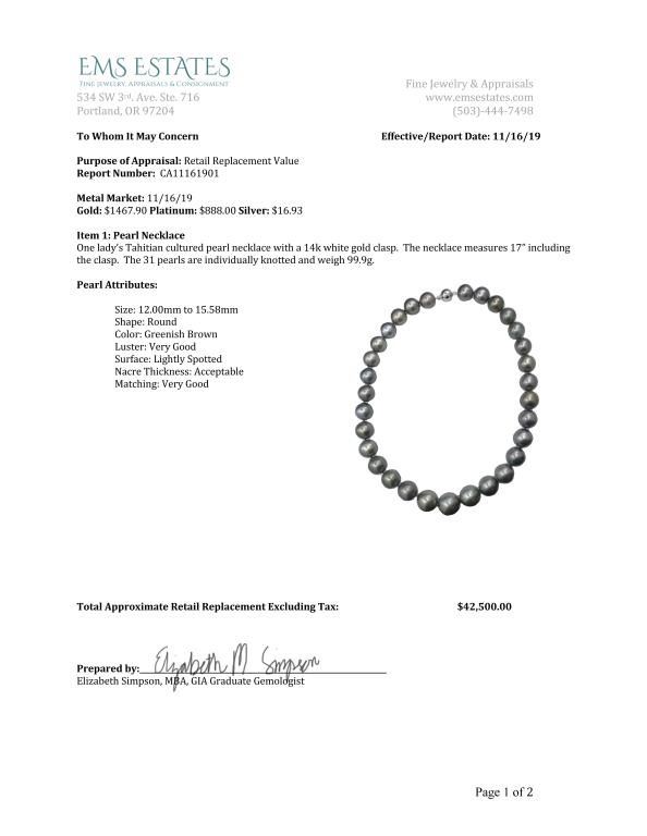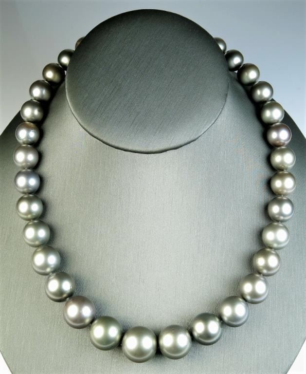 Luxurious Strand of Large South Sea Pearls averaging 12.00 MM x 16.00 MM in diameter with rich luster and blue/green overtones accented with 14 karat white gold clasp. Full Appraisal – Valued at $42,000.00Estimates $8,000-$12,000