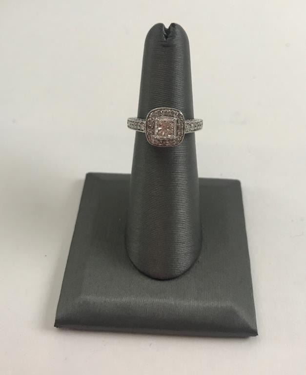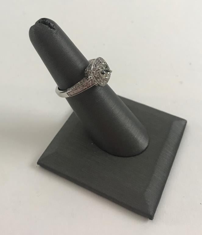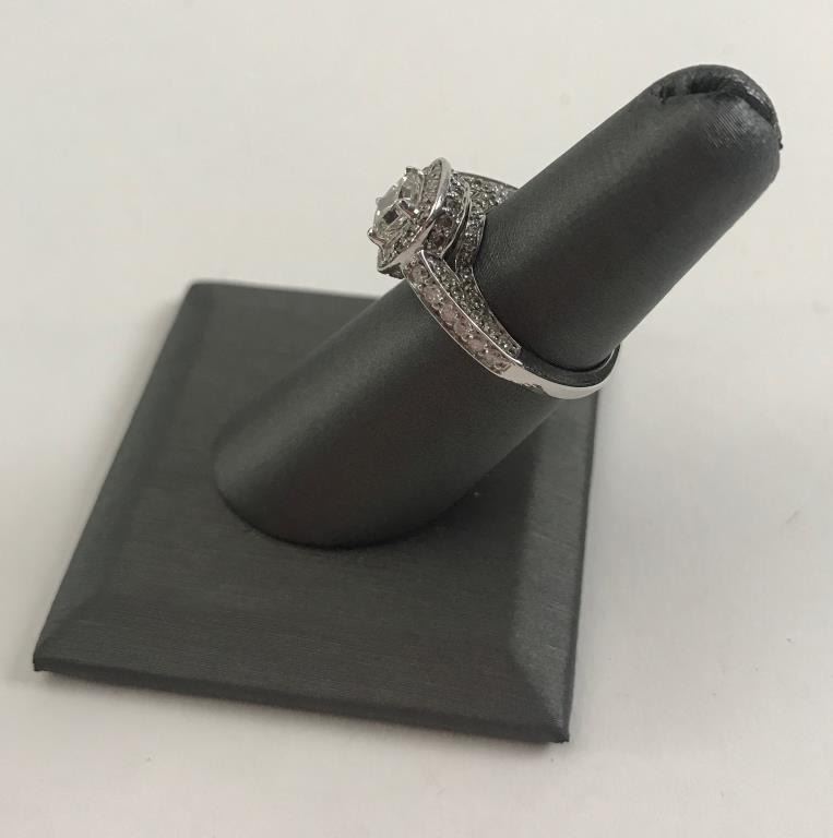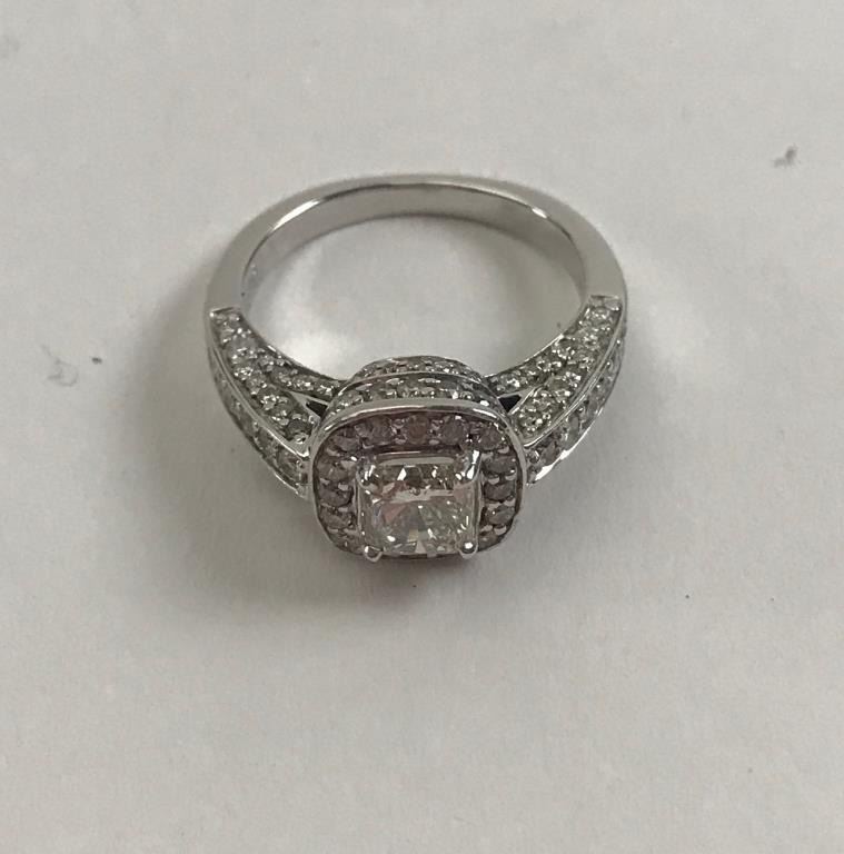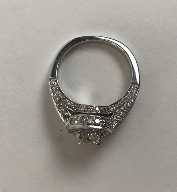 One 18 k white gold ring set with a 1.02ct radiant cut diamond surrounded by 58 diamonds weighing 1.25ct Est:$2500-5000