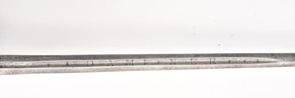 Composite cup hilt rapier in 17th century style. The blade is period and well-marked "Damia * Me". The pierced cup is a good Victorian example and well-made as is the cross guard and pommel. Correct style wirewrapped grip. Measures 42" overall with a 34" blade shortened 3"-4". Very attractive and appears to be genuine and homogeneous sword. Est.: $1500-$3000