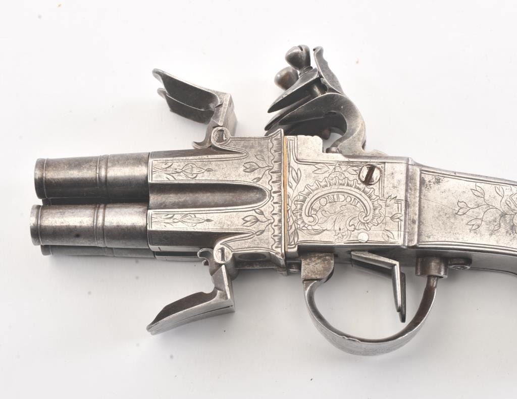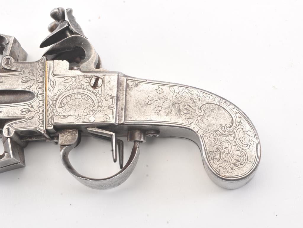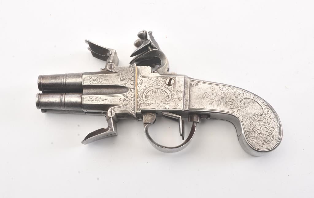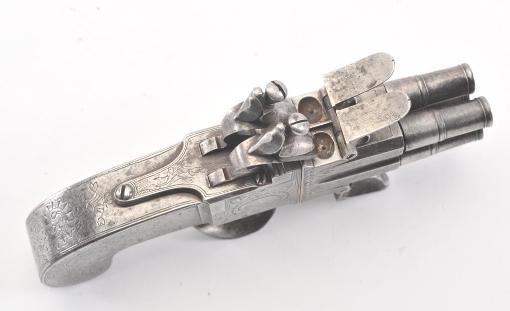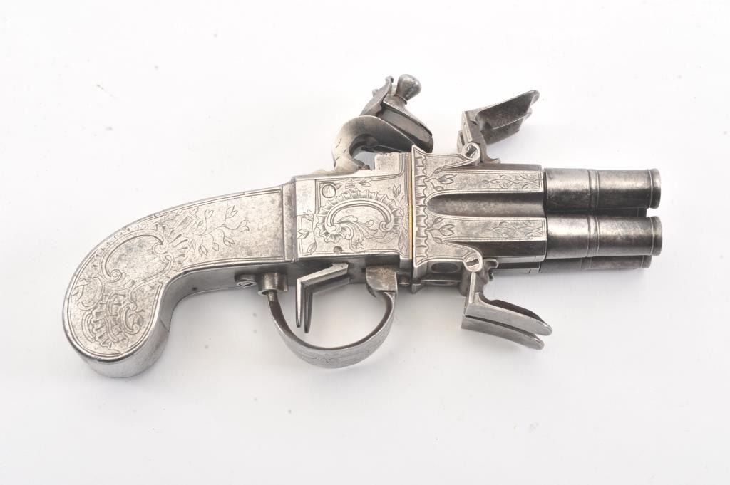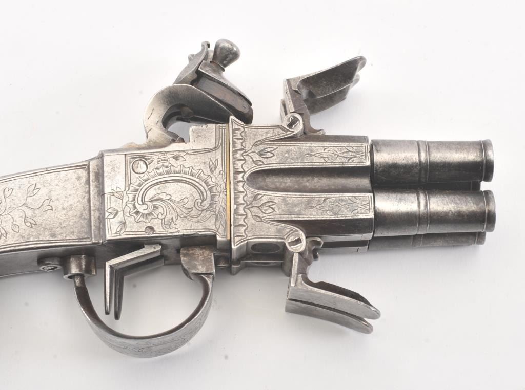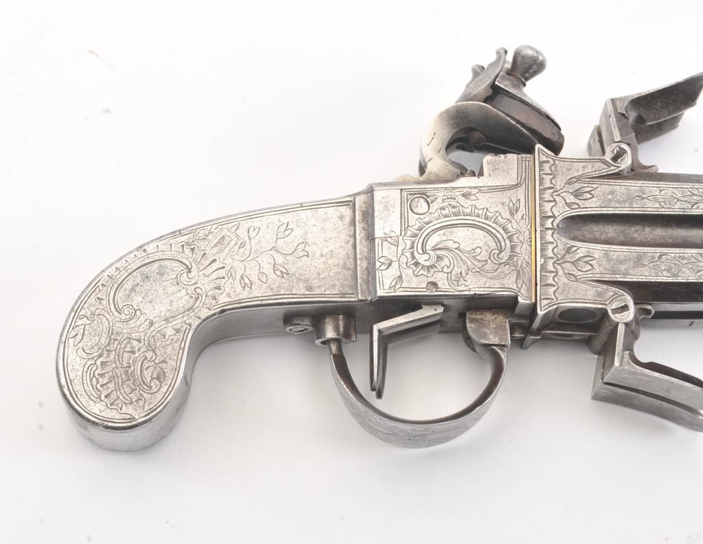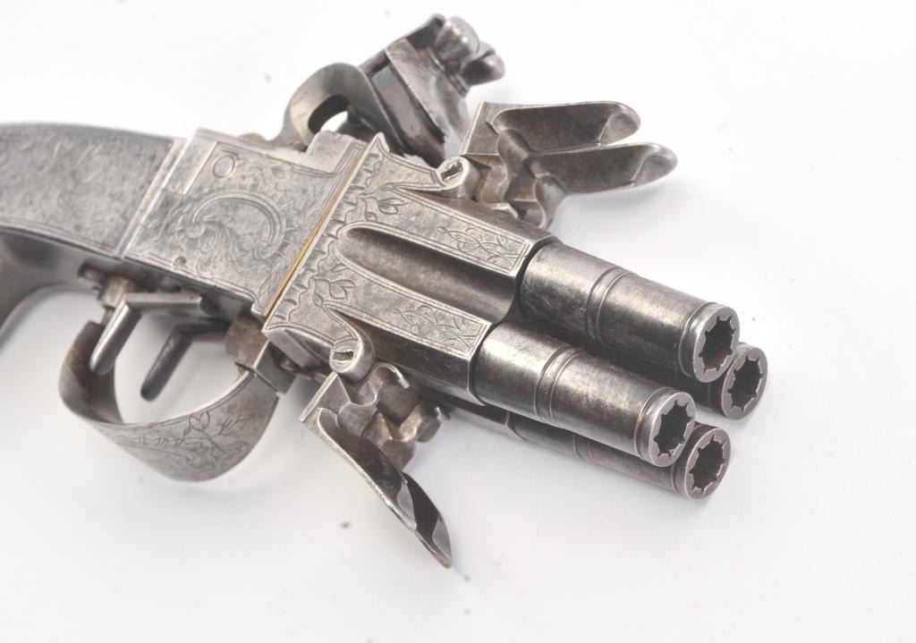 Unusual 4 barrel flintlock pistol with metal stocks circa late 18th century of continental manufacture but showing no name or proofs probably Liege or French. Nicely engraved on the barrels, frame and grip. The barrel group is released by the trigger guard and turns to utilize 3-4th shots. Measures 7" overall with a 1 1/4" screw off canon style barrel of approximately .28 caliber false rifled. The condition is very good plus and the actionswork well. Slight discolorations and minor metal aging. A seldom seen early multi-shot oddity. (Antique) Est.: $3,000-$6,000