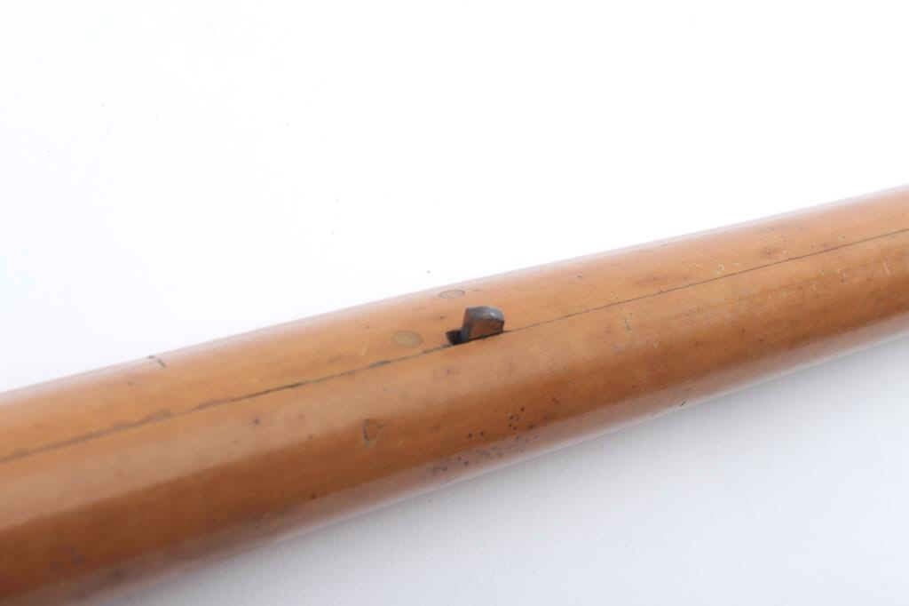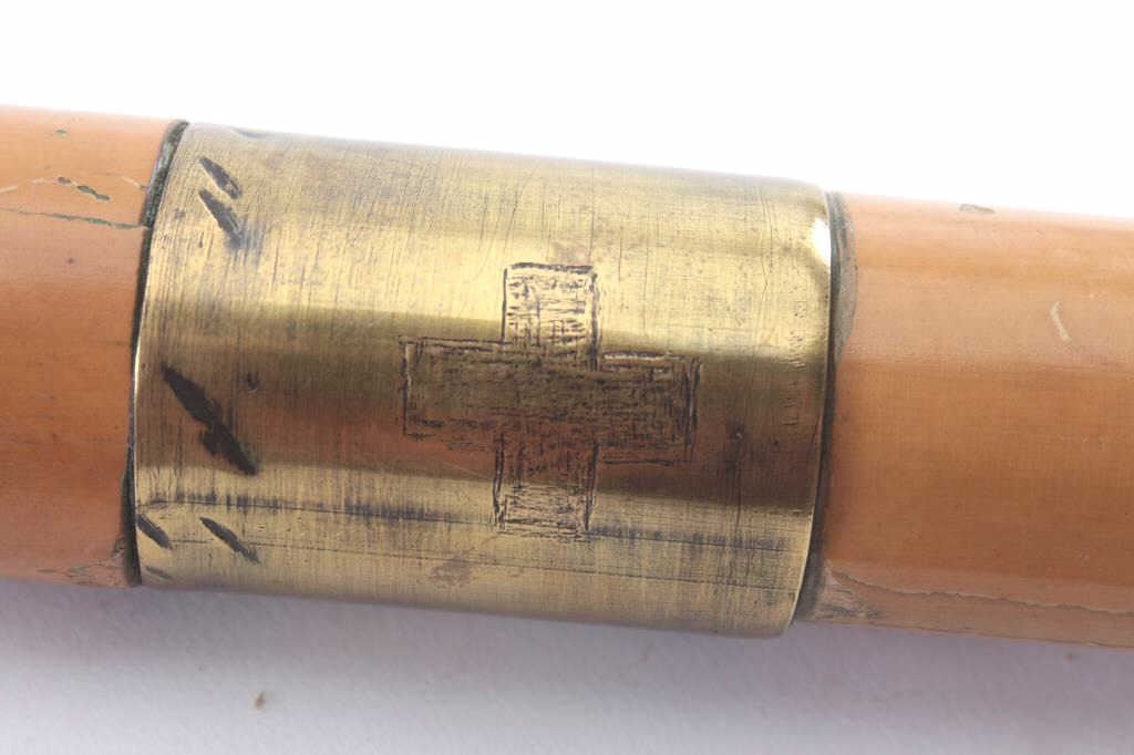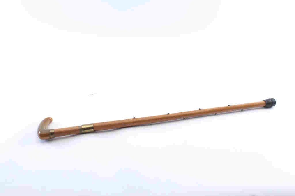Rare French 19th Century oddity cane with 8 small blades that expose themselves when cane is turned. These small blades are used to discourage attackers and thieves. Light colored wood with horn grip. Measures 36 1/2" overall. LeClerc or LeClaire according to French collector who has had one 30 years ago. Est.: $2000-$4000