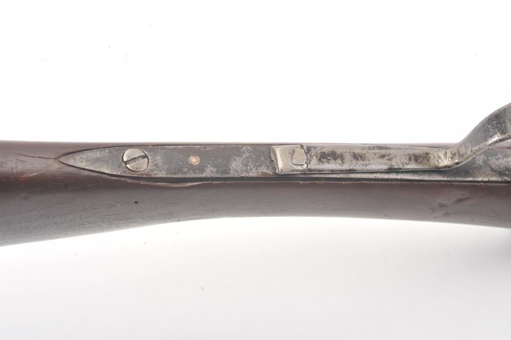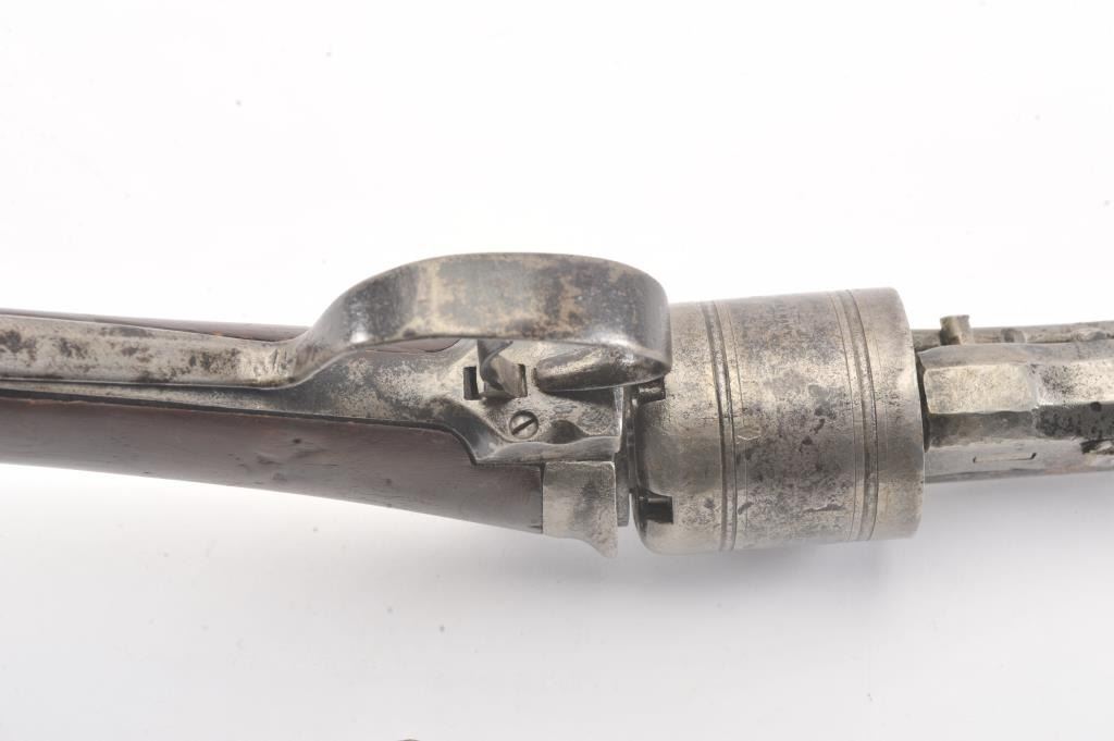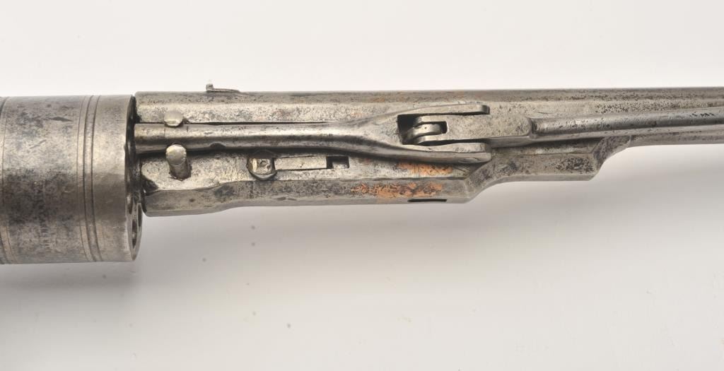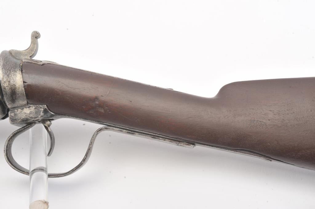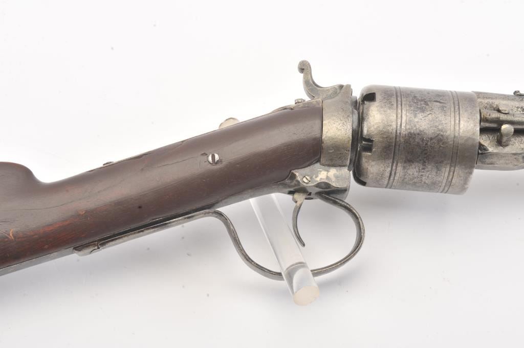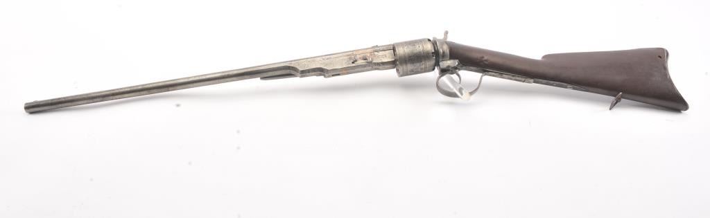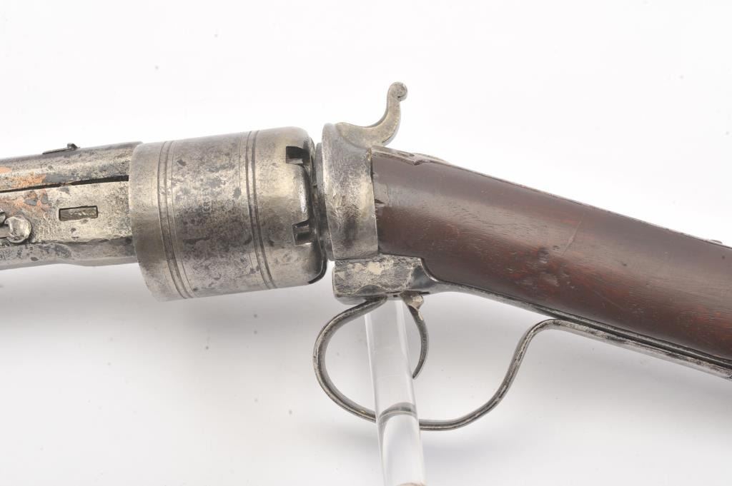 Colt Model 1839 Paterson Carbine S/N 323 in .52 caliber showing "W.A.T." marking on the stock indicating U.S. Government purchase with attached loading lever and round back cylinder. This Paterson was recently discovered in Northern California and had been in the collection of R.E. Hefner of Susanville, CA who started collecting before WWI and who obtained many arms including a Jim Bridger gun from from H.C. Flourney of Bidwells Bar California where his father Robert S. Flourney arrived in 1849 after traveling west. A tag with this Paterson and verbal history allegeds travel from Texas during the gold rush. This carbine remains in fair to poor condition showing many old repairs and cleaning. The Colt markings on the side of the barrel and on the cylinder are partially visible. The trigger guard is an old frontier repair. Old copper flux has been used to fill and repair metal. The stock shows retaining and old repair to the bad breaks but the "W.A.T." cartouche is lightly visible under the stain. The action is broken and frozen and only 1 serial number is visible inside the hard worn interior. An old square handmade swivel has been added to the butt stock and is of the period. Also the trigger length is increased and may have been extended to use with this oversize guard and a gloved hand. This Paterson is down the ladder on condition but very interesting as to being carried west and found in one of California oldest collection. For the collector who values frontier character over condition. (Antique) Est.: $5,000-$10,000