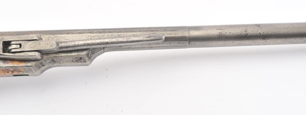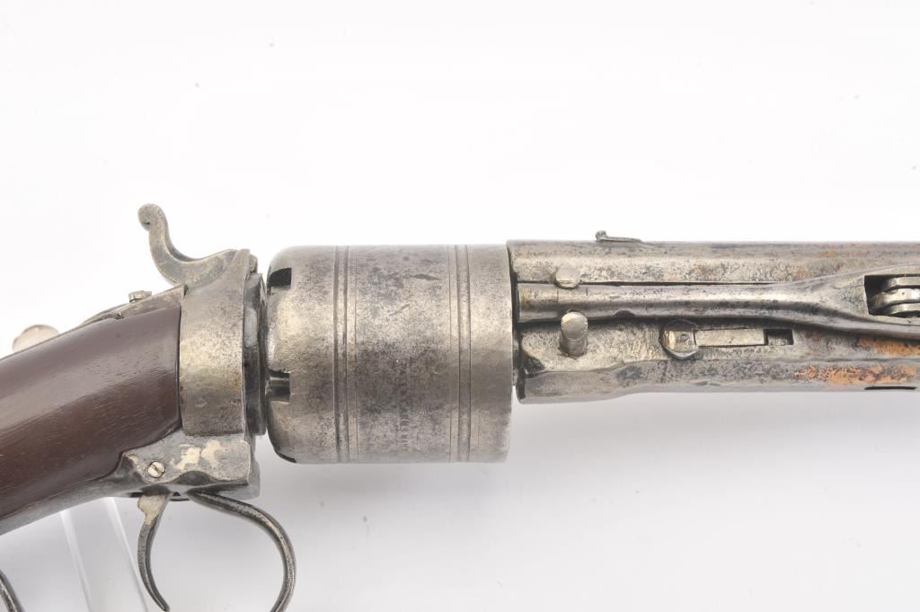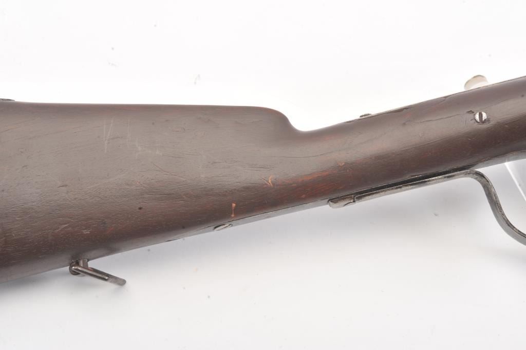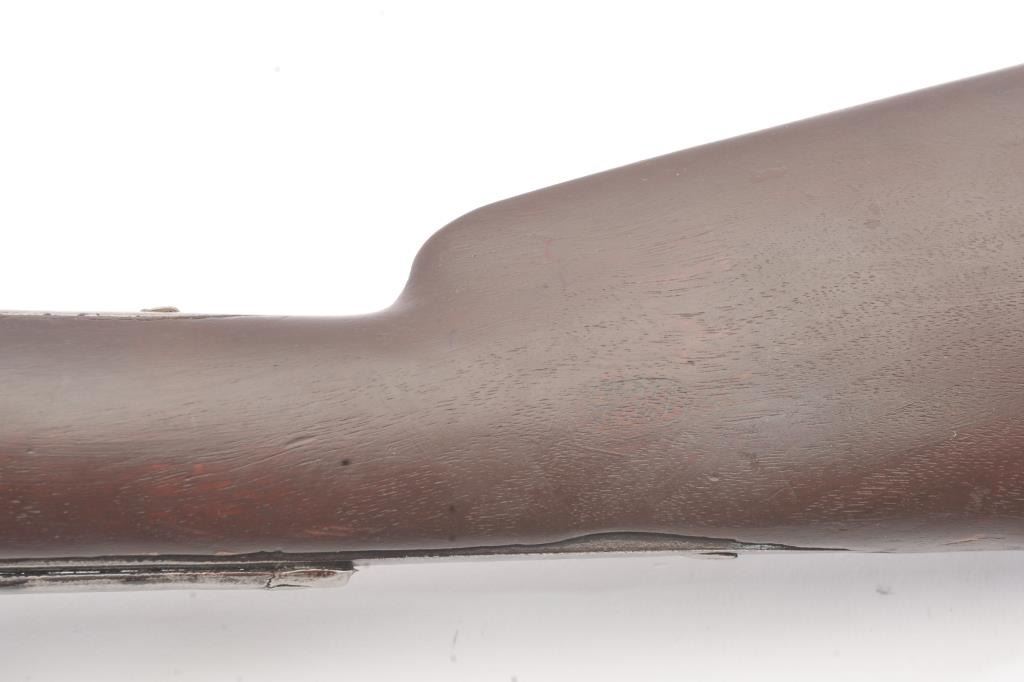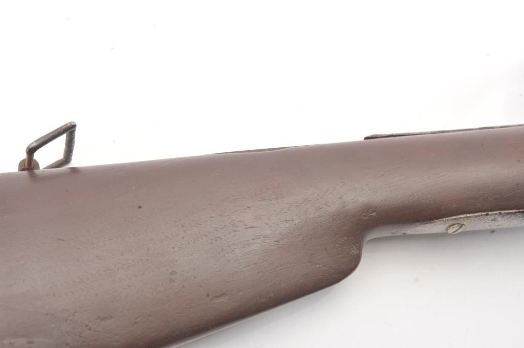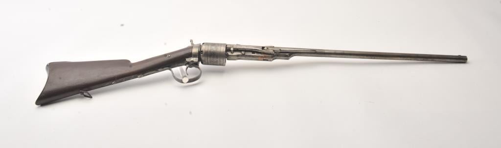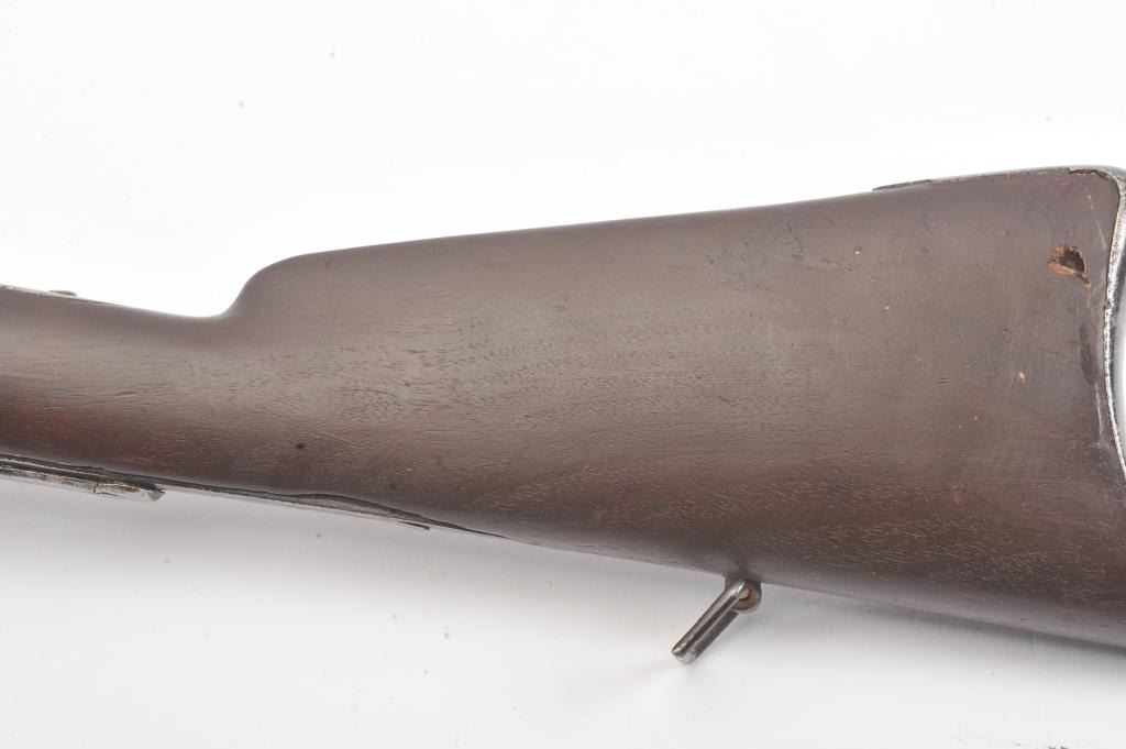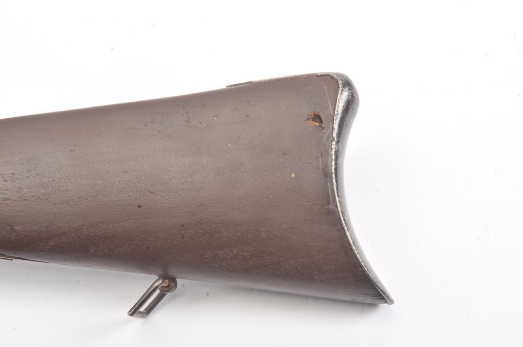 Colt Model 1839 Paterson Carbine S/N 323 in .52 caliber showing "W.A.T." marking on the stock indicating U.S. Government purchase with attached loading lever and round back cylinder. This Paterson was recently discovered in Northern California and had been in the collection of R.E. Hefner of Susanville, CA who started collecting before WWI and who obtained many arms including a Jim Bridger gun from from H.C. Flourney of Bidwells Bar California where his father Robert S. Flourney arrived in 1849 after traveling west. A tag with this Paterson and verbal history allegeds travel from Texas during the gold rush. This carbine remains in fair to poor condition showing many old repairs and cleaning. The Colt markings on the side of the barrel and on the cylinder are partially visible. The trigger guard is an old frontier repair. Old copper flux has been used to fill and repair metal. The stock shows retaining and old repair to the bad breaks but the "W.A.T." cartouche is lightly visible under the stain. The action is broken and frozen and only 1 serial number is visible inside the hard worn interior. An old square handmade swivel has been added to the butt stock and is of the period. Also the trigger length is increased and may have been extended to use with this oversize guard and a gloved hand. This Paterson is down the ladder on condition but very interesting as to being carried west and found in one of California oldest collection. For the collector who values frontier character over condition. (Antique) Est.: $5,000-$10,000