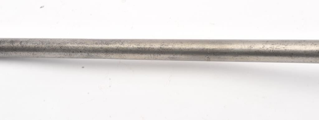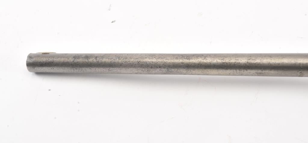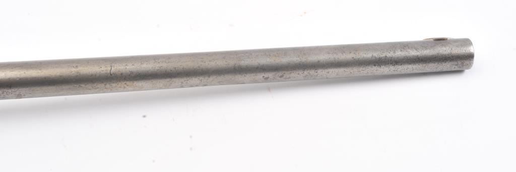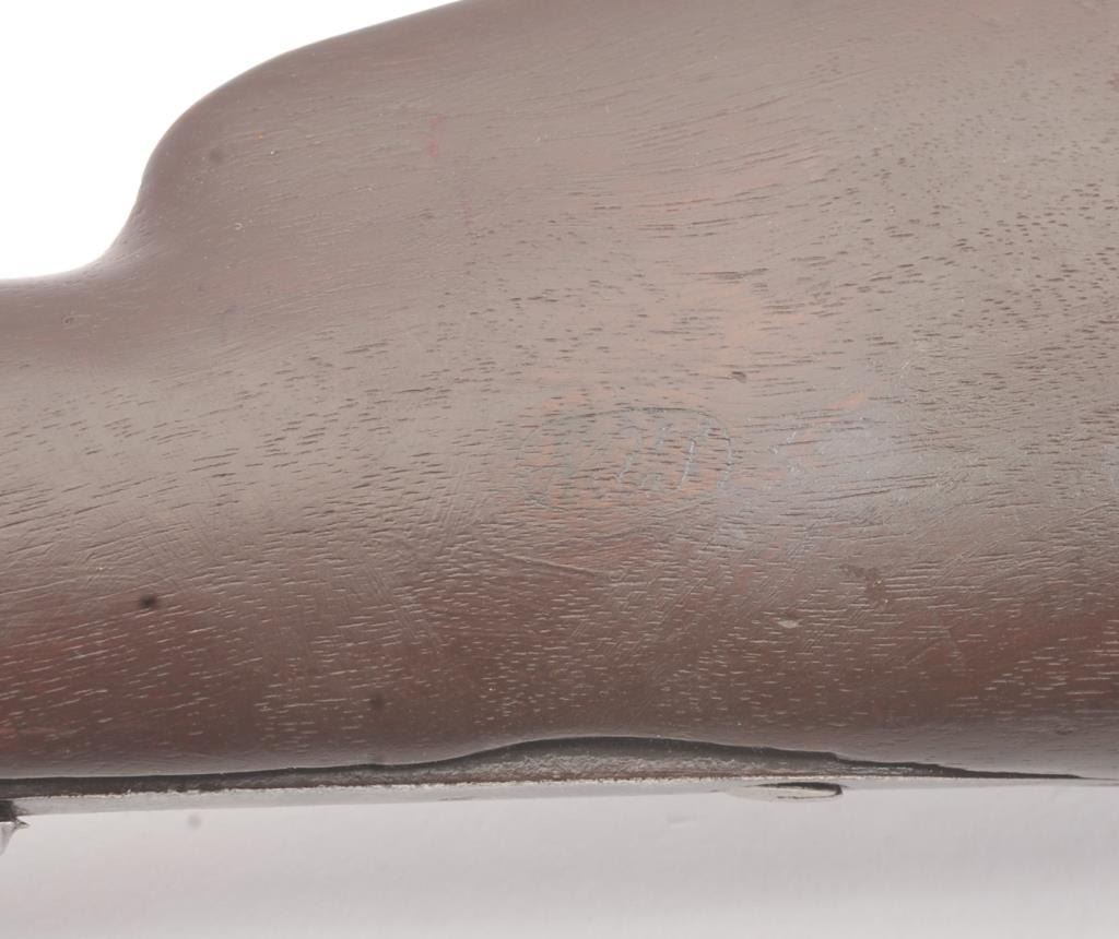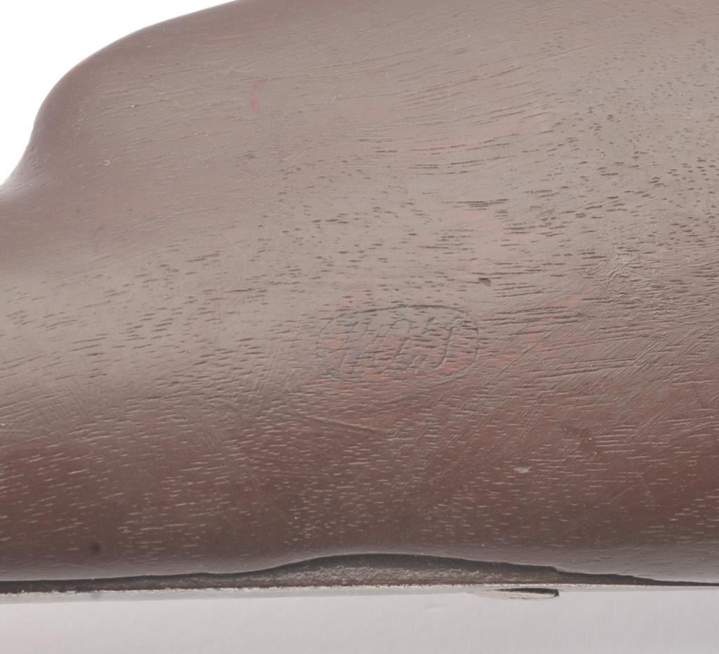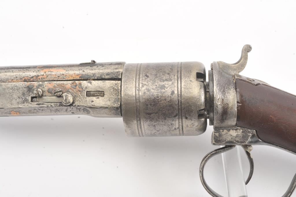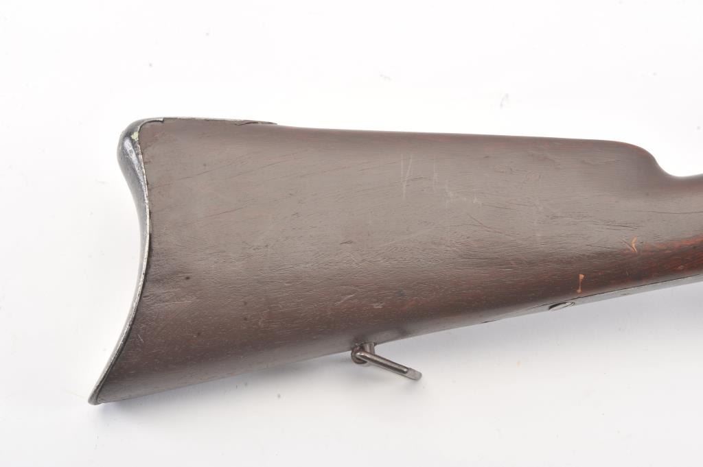 Colt Model 1839 Paterson Carbine S/N 323 in .52 caliber showing "W.A.T." marking on the stock indicating U.S. Government purchase with attached loading lever and round back cylinder. This Paterson was recently discovered in Northern California and had been in the collection of R.E. Hefner of Susanville, CA who started collecting before WWI and who obtained many arms including a Jim Bridger gun from from H.C. Flourney of Bidwells Bar California where his father Robert S. Flourney arrived in 1849 after traveling west. A tag with this Paterson and verbal history allegeds travel from Texas during the gold rush. This carbine remains in fair to poor condition showing many old repairs and cleaning. The Colt markings on the side of the barrel and on the cylinder are partially visible. The trigger guard is an old frontier repair. Old copper flux has been used to fill and repair metal. The stock shows retaining and old repair to the bad breaks but the "W.A.T." cartouche is lightly visible under the stain. The action is broken and frozen and only 1 serial number is visible inside the hard worn interior. An old square handmade swivel has been added to the butt stock and is of the period. Also the trigger length is increased and may have been extended to use with this oversize guard and a gloved hand. This Paterson is down the ladder on condition but very interesting as to being carried west and found in one of California oldest collection. For the collector who values frontier character over condition. (Antique) Est.: $5,000-$10,000