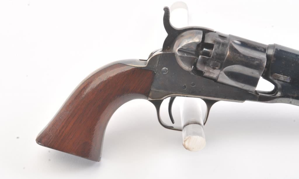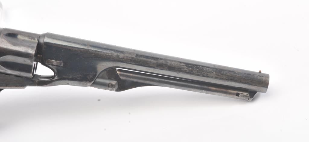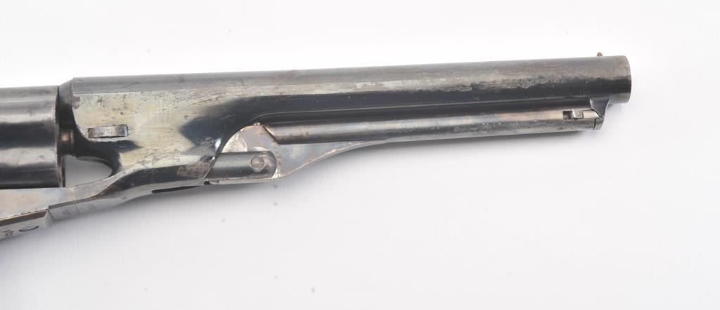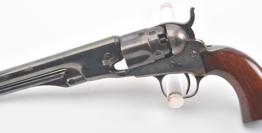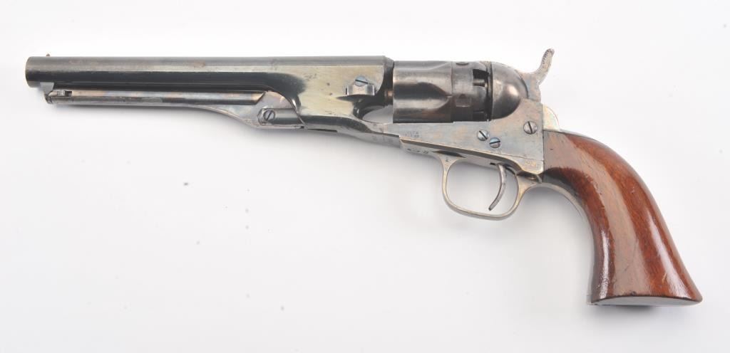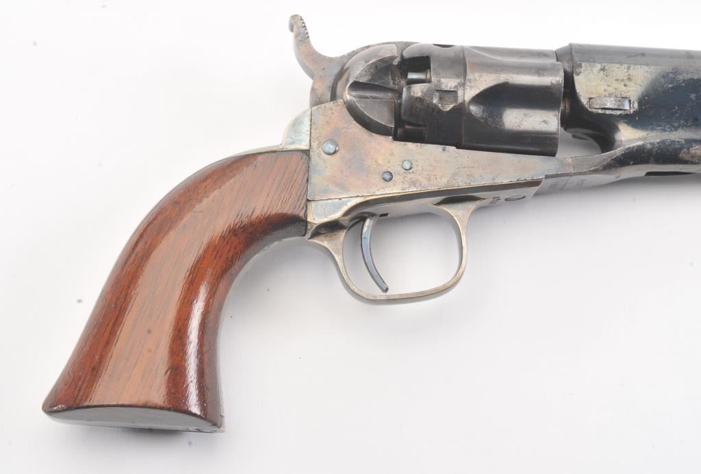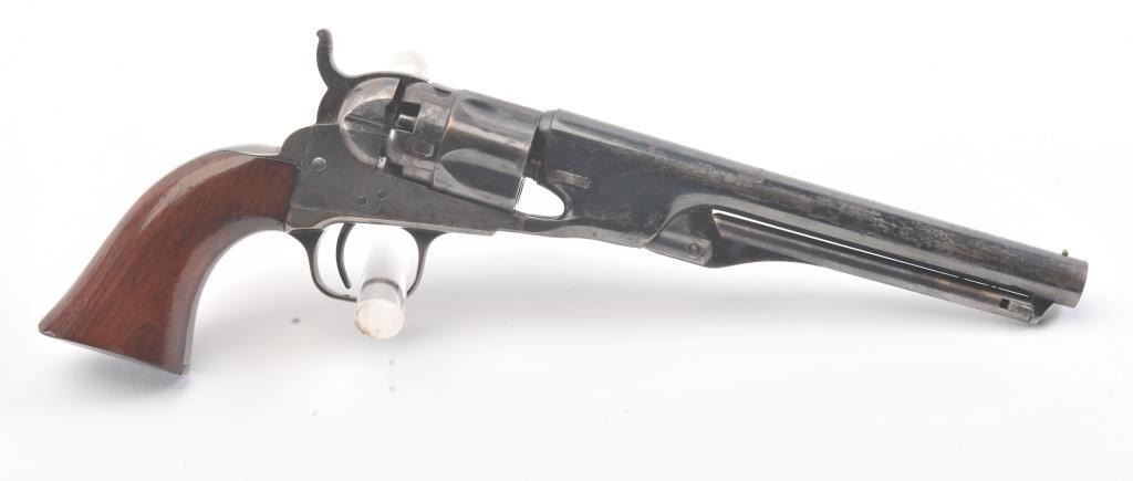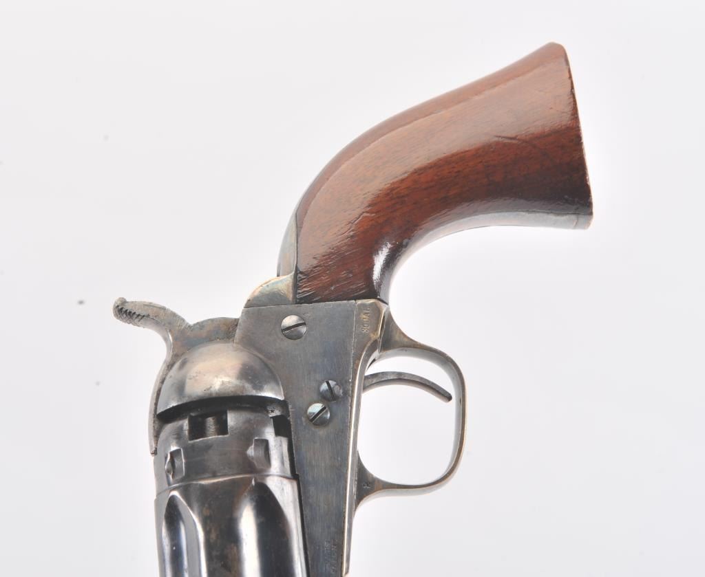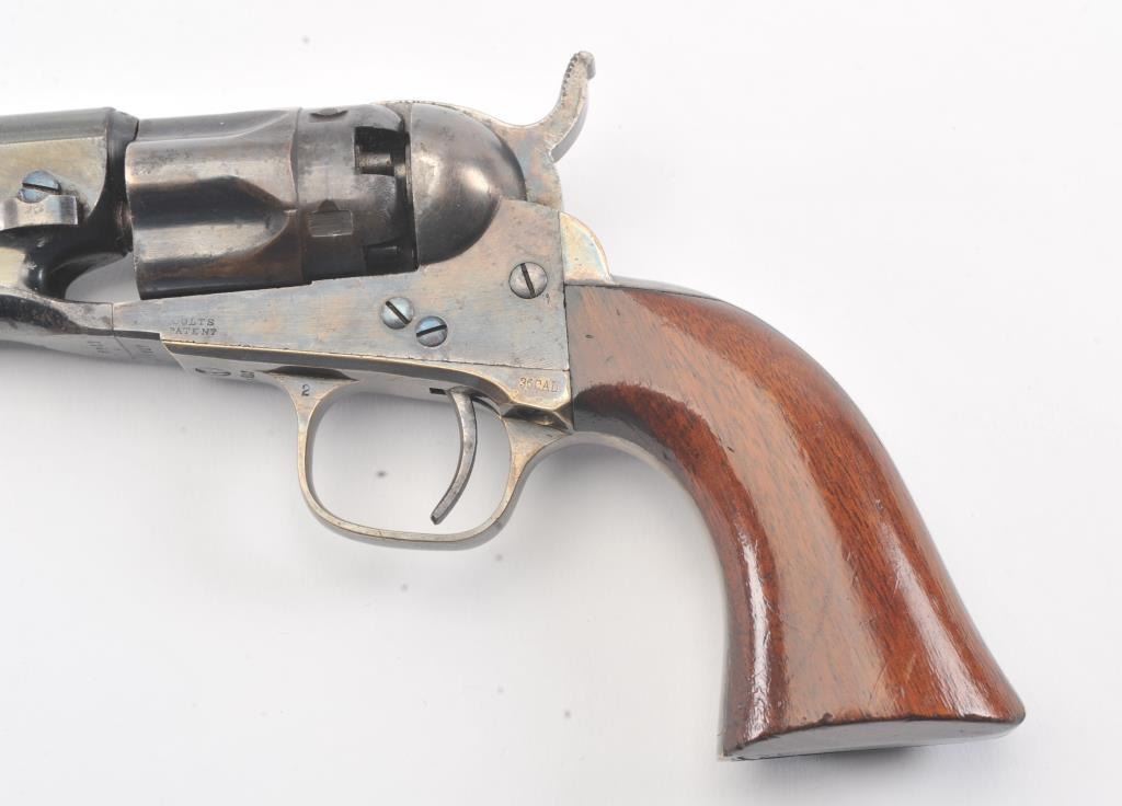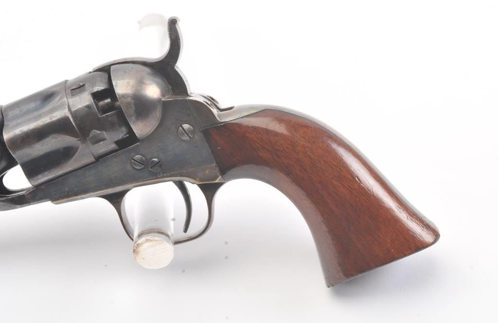 Colt 1862 Police Revolver with desirable 6 1/2" barrel remaining in fine original condition, S/N 6713. The barrel retains 80%-90% original bright and inky blue with minor flaking and toning. Also minorscratches and mars. The cylinder shows 60%-80% original blue with minor erosion and toning. The frame, hammer, and loading lever show 80%-90% case colors with some vivid and colorful rainbow hues. The straps show nearly all of their uncleaned silver plate. The grips show 90%-95% varnish and are fine to excellent with minor scratches and handling. All matching visible serial numbers. An 8.5-9 on a 1-10 scale. From the well-recognizedGary Wiemann estate collection. (Antique) Est.; $3,000-$6,000