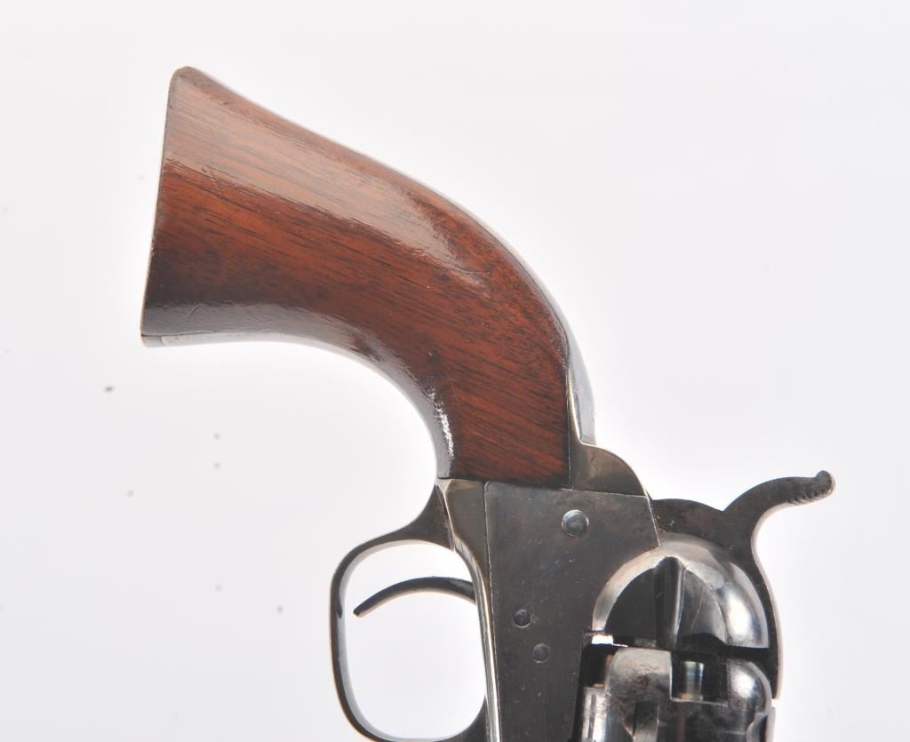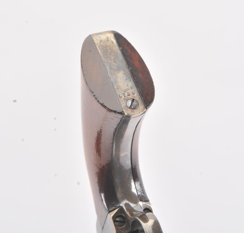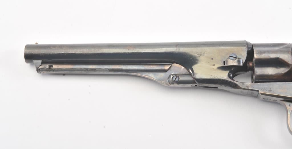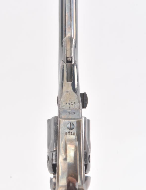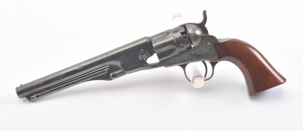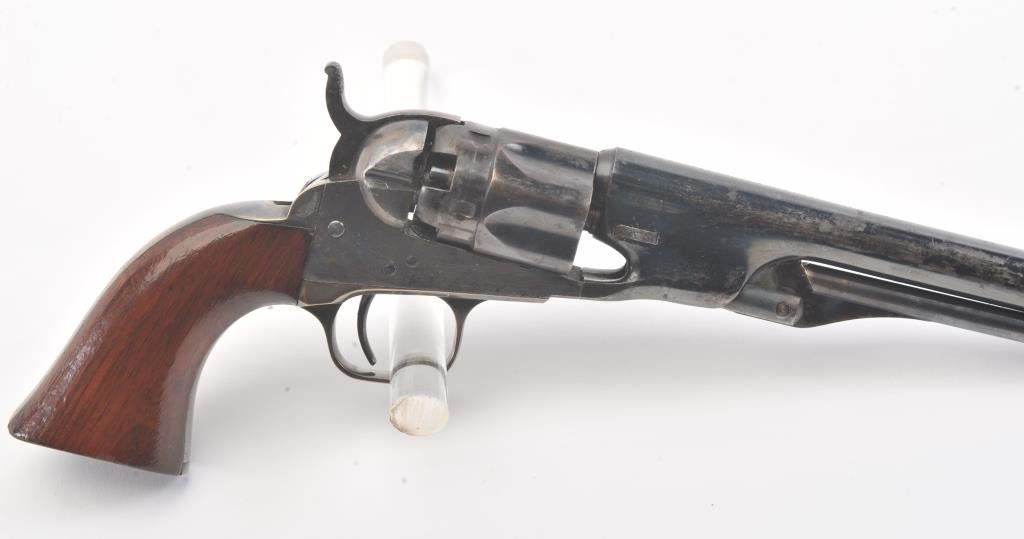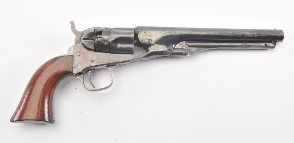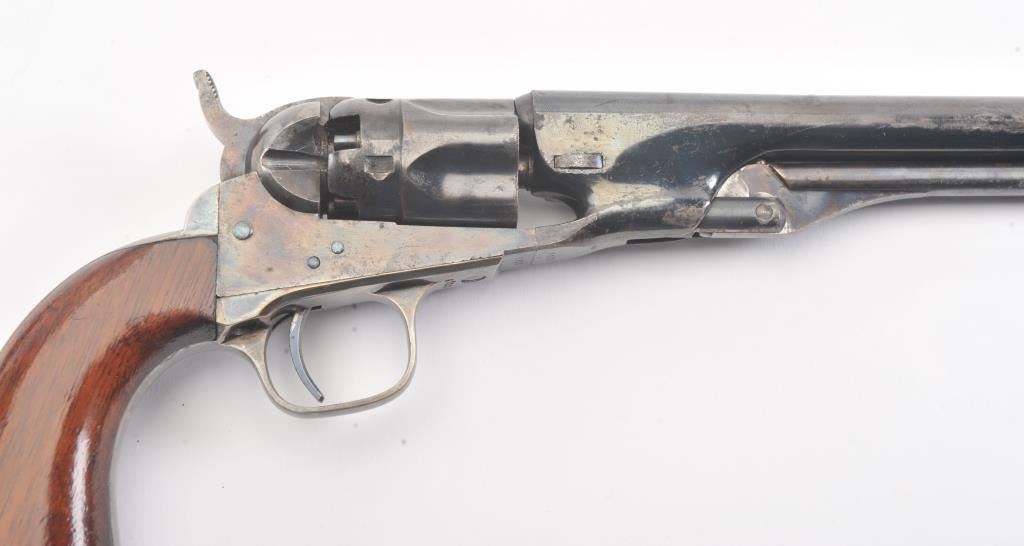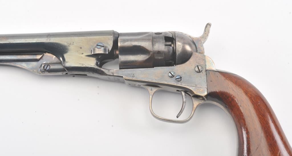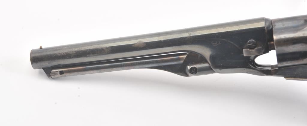 Colt 1862 Police Revolver with desirable 6 1/2" barrel remaining in fine original condition, S/N 6713. The barrel retains 80%-90% original bright and inky blue with minor flaking and toning. Also minorscratches and mars. The cylinder shows 60%-80% original blue with minor erosion and toning. The frame, hammer, and loading lever show 80%-90% case colors with some vivid and colorful rainbow hues. The straps show nearly all of their uncleaned silver plate. The grips show 90%-95% varnish and are fine to excellent with minor scratches and handling. All matching visible serial numbers. An 8.5-9 on a 1-10 scale. From the well-recognizedGary Wiemann estate collection. (Antique) Est.; $3,000-$6,000