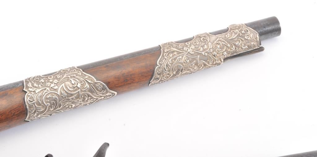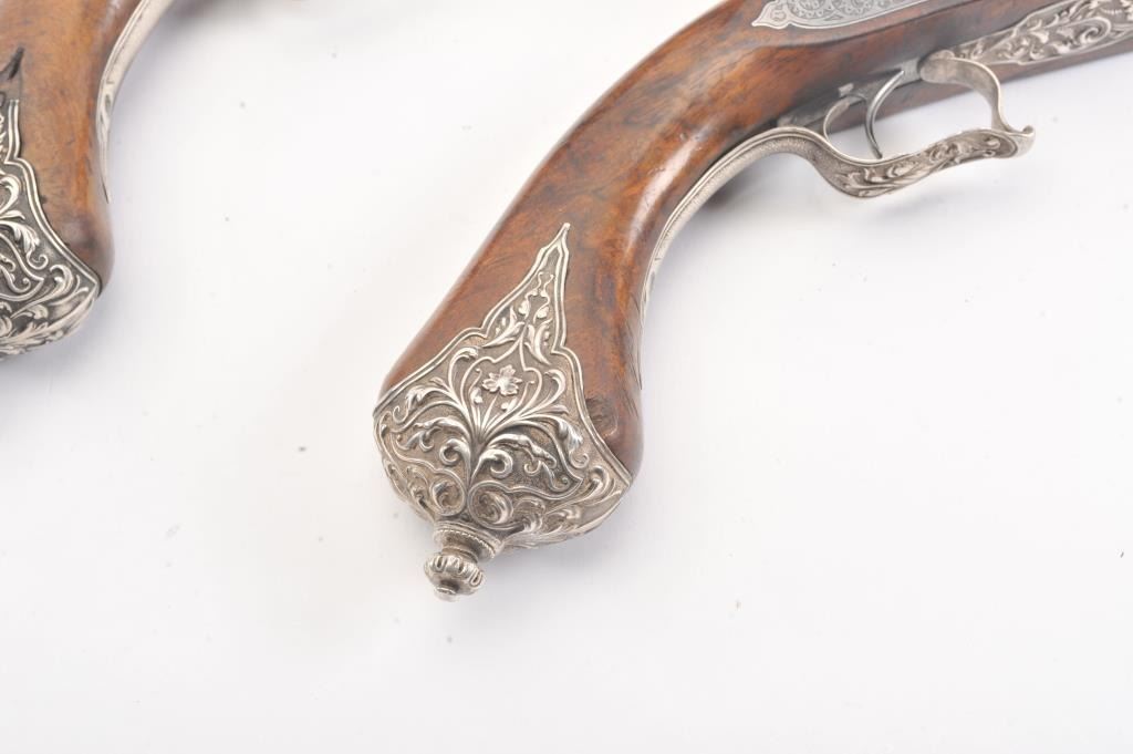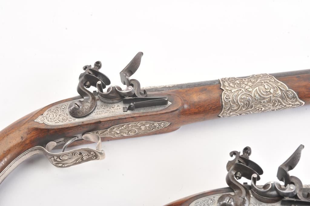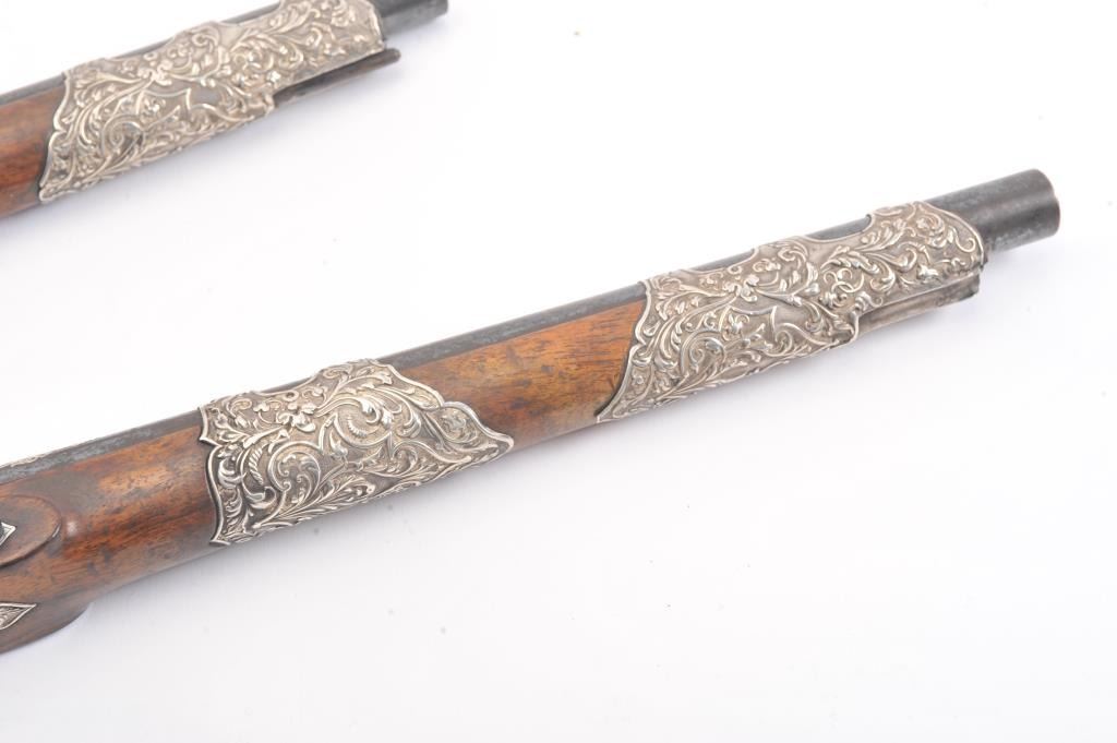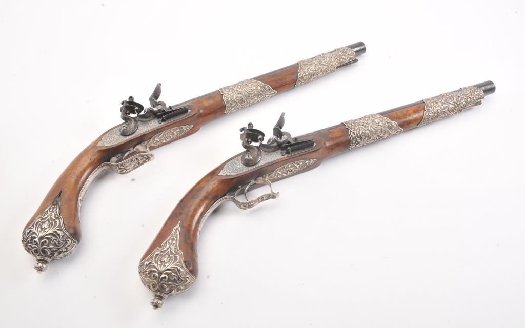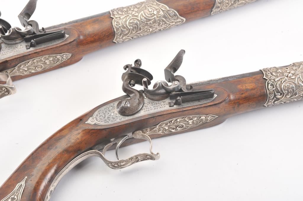 Ornate and impressive pair of flintlock pistols with locks marked "LePage Moutier Arq Du Roy" (Gun maker to the king). Measures 21" overall with 14" barrels of approximately .69 caliber smoothbore. Fire blued andsilver inlaid barrels. Very ornate and good quality silver mounts in floral motifs that are European made. Select wood stocks. Very good overall condition with barrels showing minor pitting. The ramrods are missing. Veryhigh quality 19th century waterproof pans with finely made locks. Type made for sultans and kings of N. Africa to Middle-East than were huge customers for fine arms in 19th century. (Antique) Est.: $5,000-$10,000