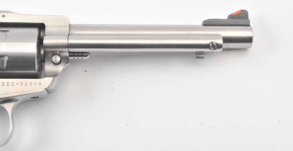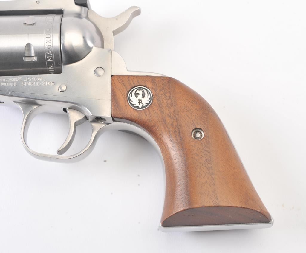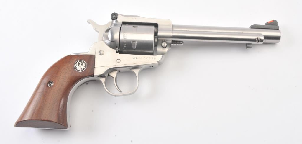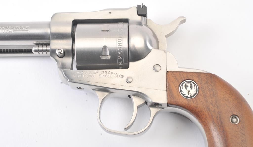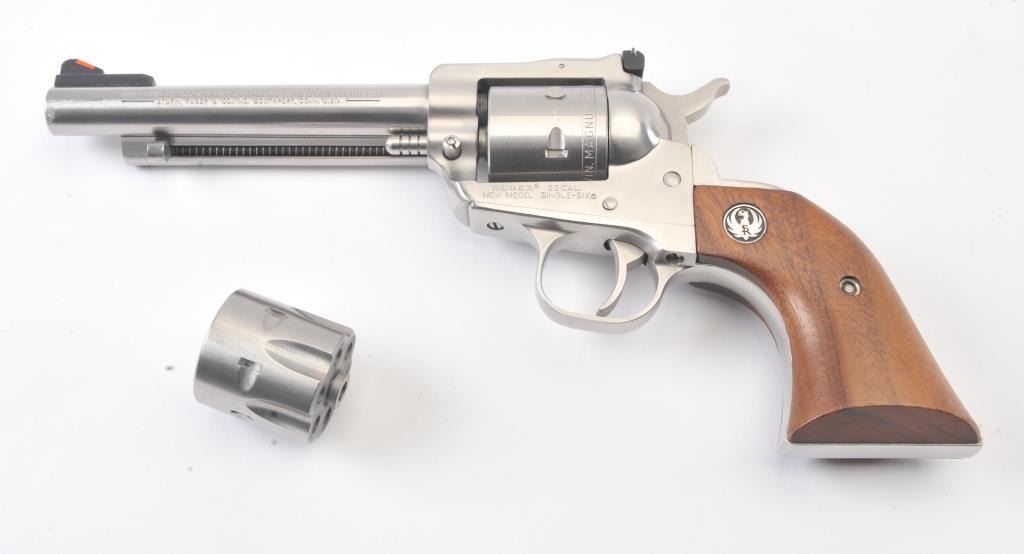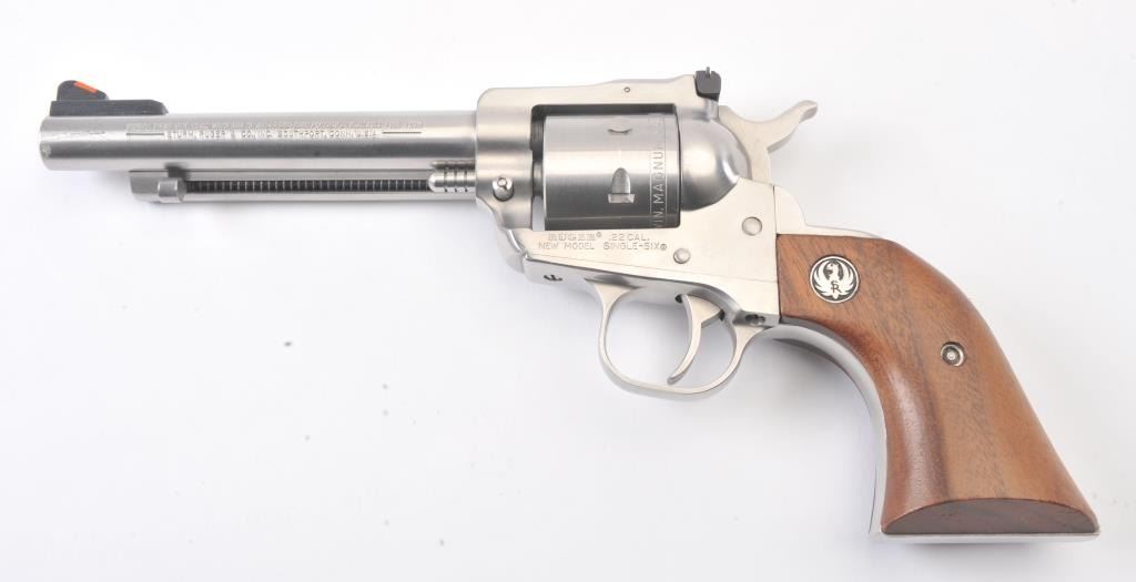 Ruger New Model Single Six revolver, .22 Win. Mag. caliber with .22 caliber extra cylinder, 5.5” barrel, stainless steel, smooth wood medallion grips, S/N 260-82686; overall fine condition with a fine bore,action, markings and grips. (Modern/PPT). Est.: $350-650.