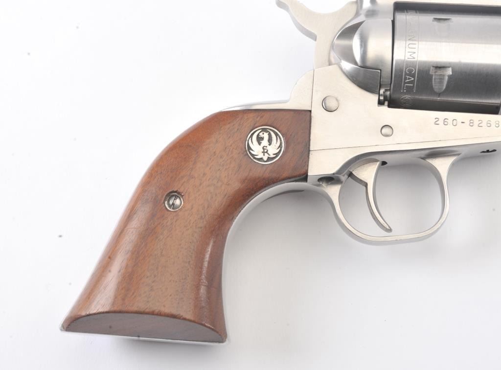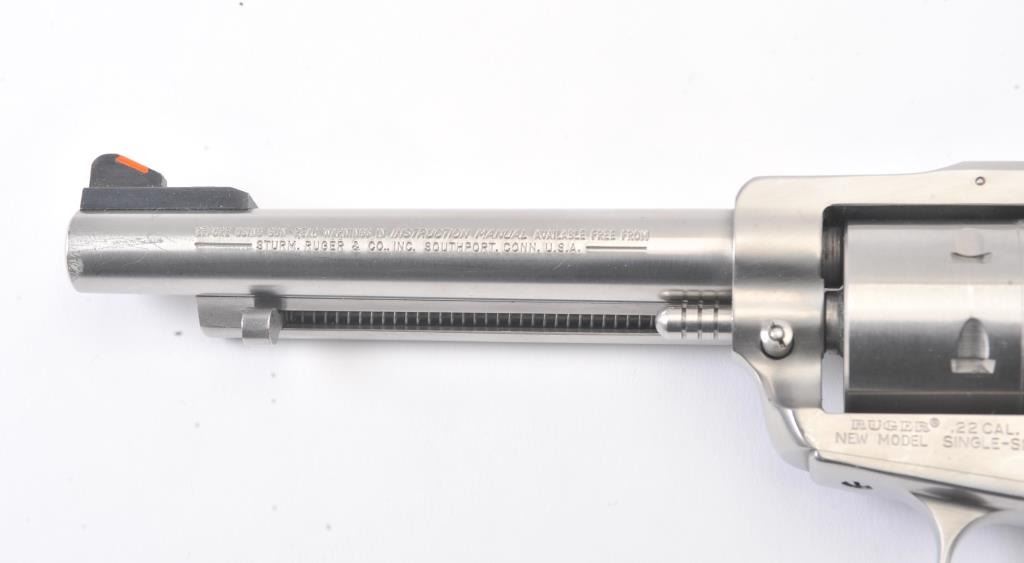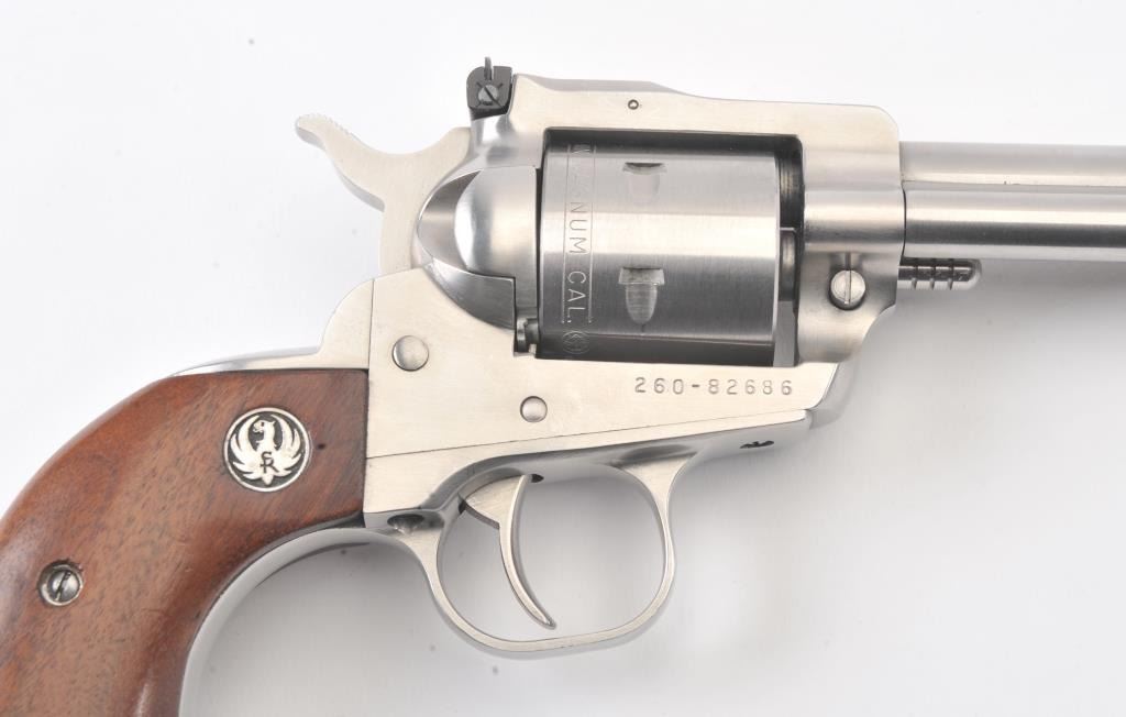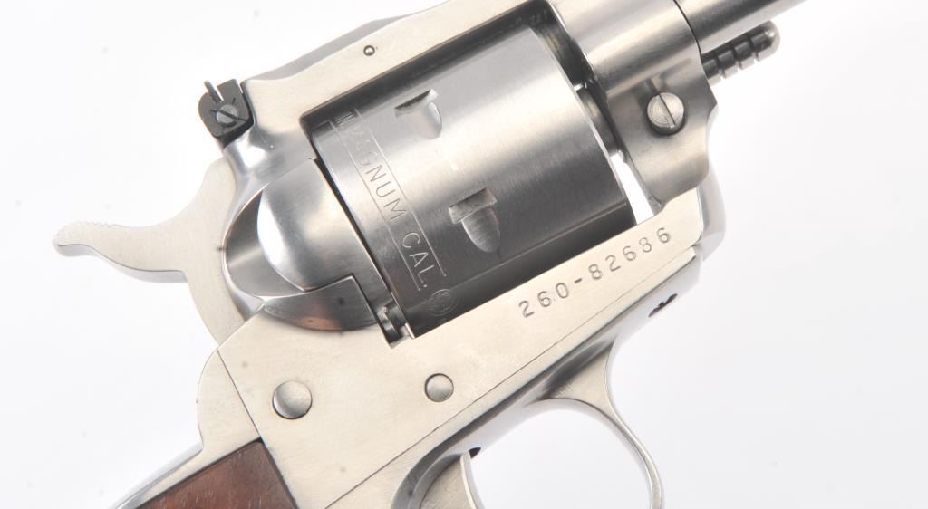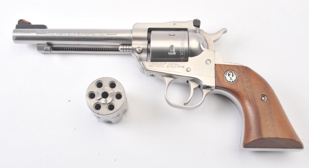 Ruger New Model Single Six revolver, .22 Win. Mag. caliber with .22 caliber extra cylinder, 5.5” barrel, stainless steel, smooth wood medallion grips, S/N 260-82686; overall fine condition with a fine bore,action, markings and grips. (Modern/PPT). Est.: $350-650.