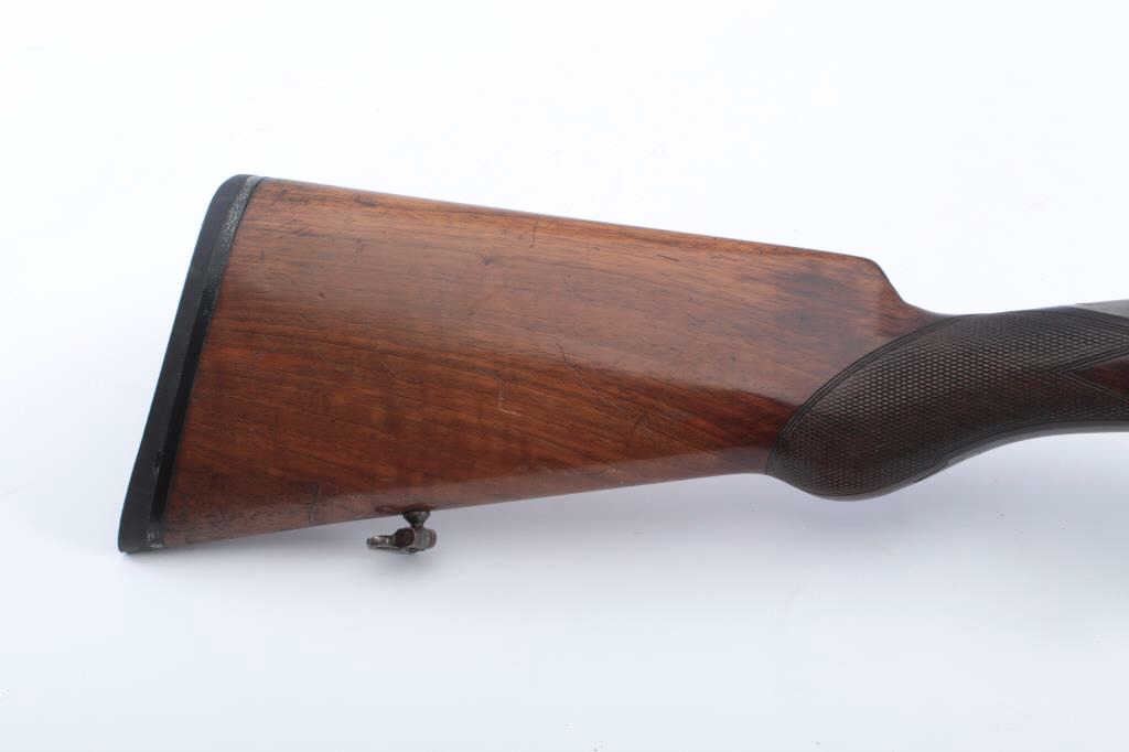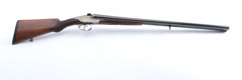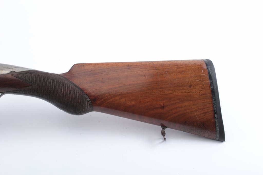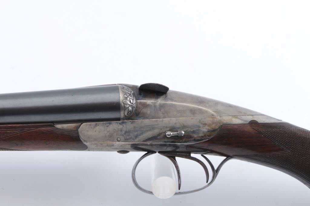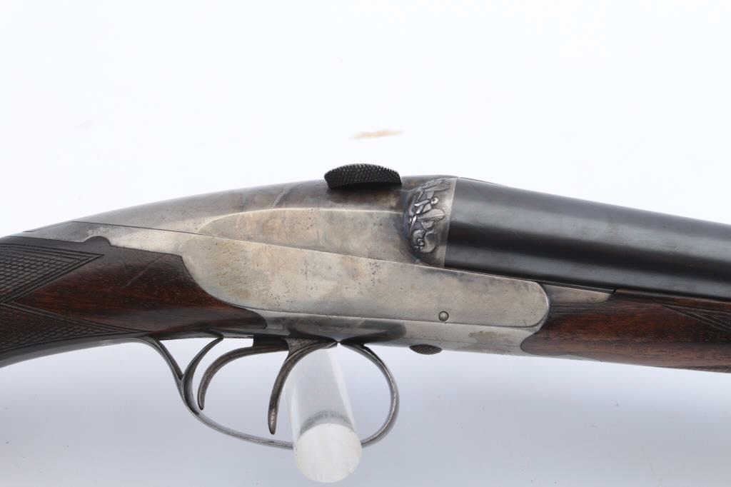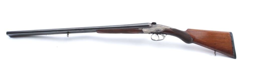 Charnet (Similar to Darne) breech loading SxS barrel shotgun in 16GA with 26 3/4" barrels. 90%-95% original blue on the barrels, 30%-50% case colors on the frame drifting to a silver/gray but some vivid areas. Cleanbores and brought interior. Locks like a bank vault. The stocks are good to very good with normal wear and slight scratches. Measures 14 3/8" to the end of thin pad and 14" to the end of the wood. Choked about full left andmodified right. A very nice example of the French canon breech shotgun style. (C&R) Est.: $1000-$2000