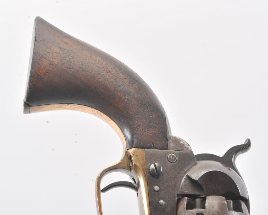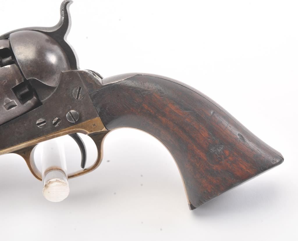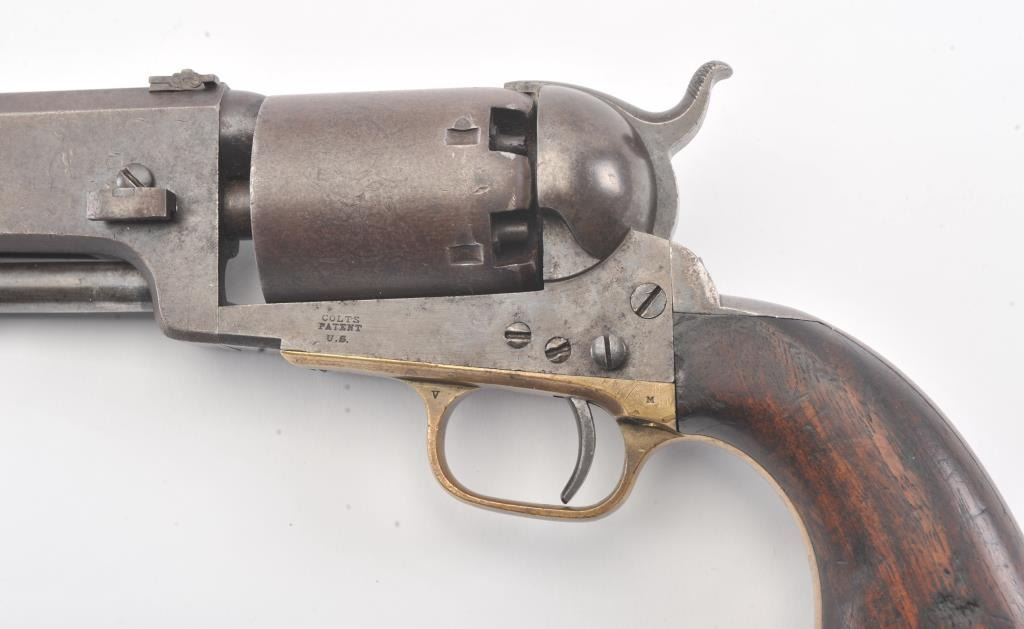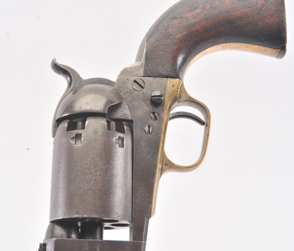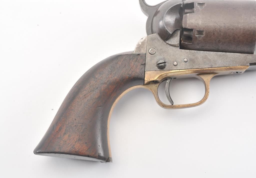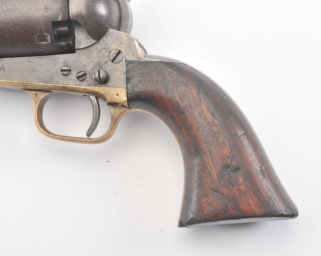 Colt 3rd Model Dragoon cut for shoulder stock and U.S. inspected, S/N 17005. Remaining in very good plus original condition with strong traces of blue and case colors mixed in a pleasing patina. Approximately 60%-70%original scene with visible U.S.M.R. and Colts patent. Sharp edges and good markings. Correct rear sight and all matching visible serial numbers. The grips are also very good plus with traces of cartouche on the left and full "W.A.T." on the right. The grips show some impressions from the stock and normal bumps and small losses at the toes. Good action and a quality cut for stock dragoon from the well-recognized Gary Wiemanncollection estate. (Antique) Est.: $7,500-$15,000