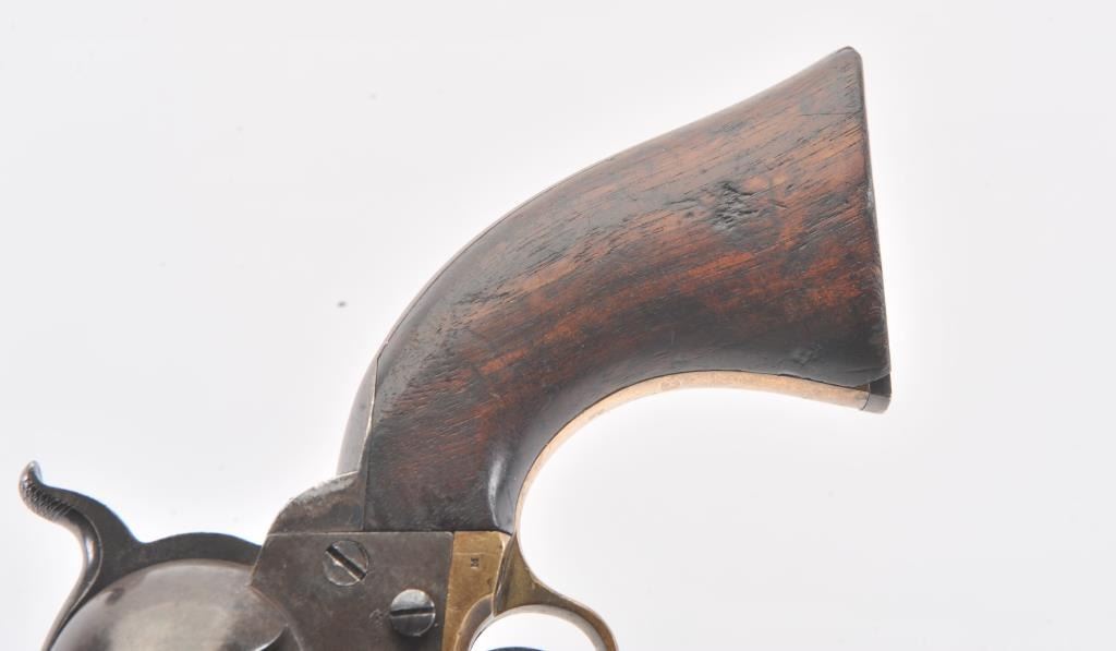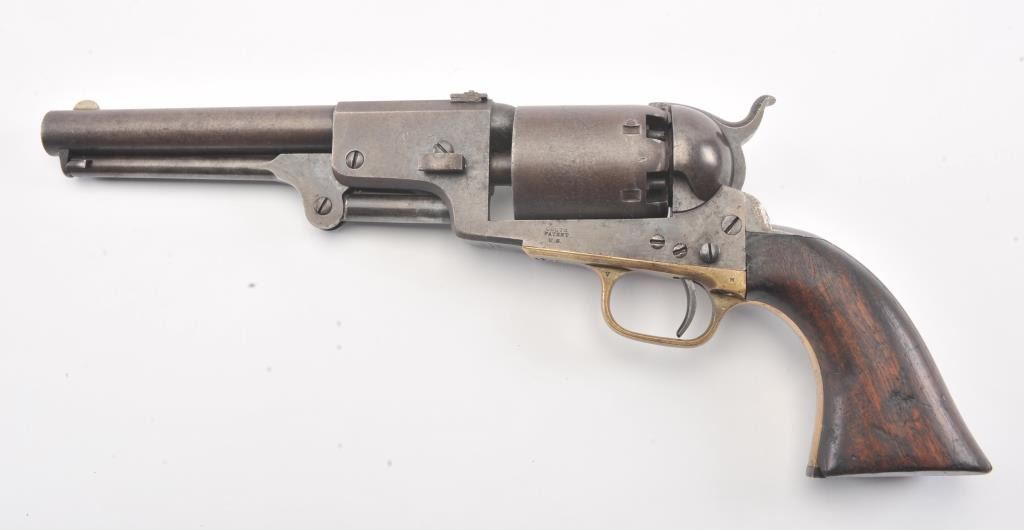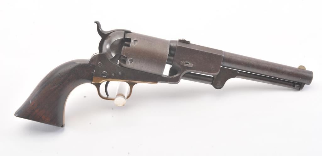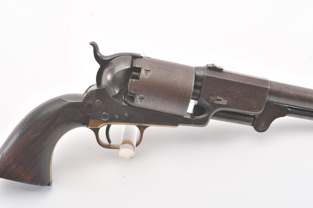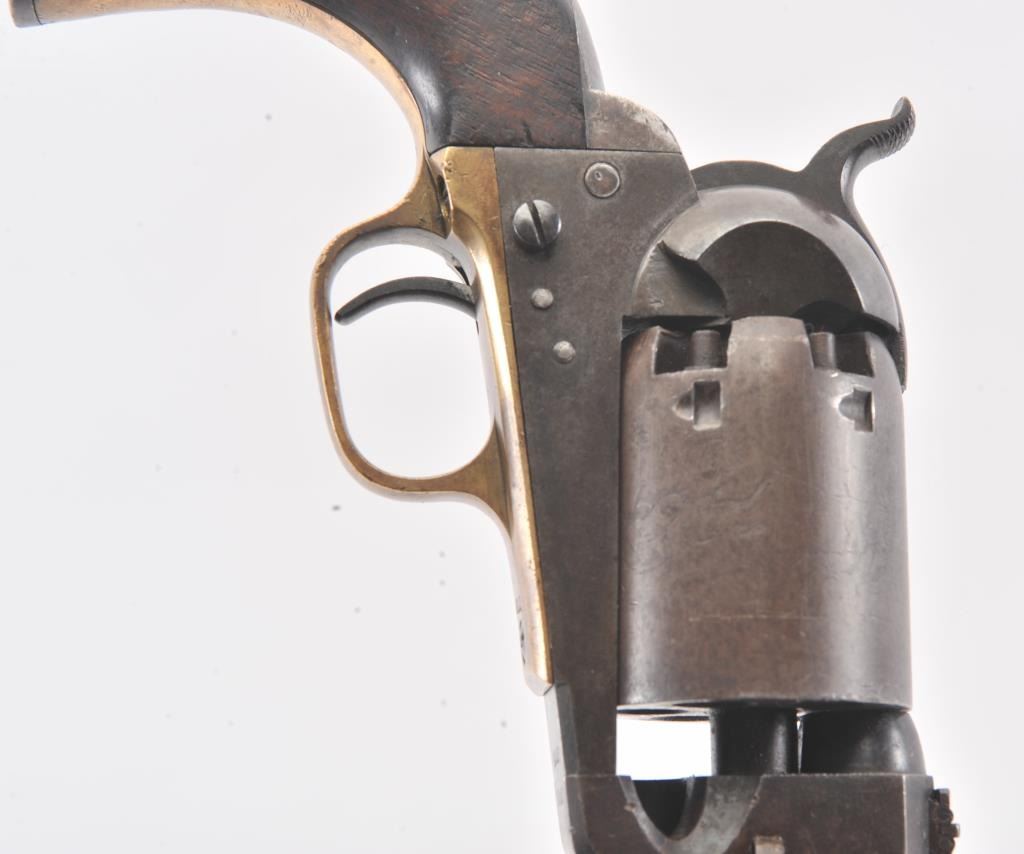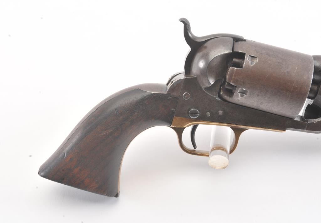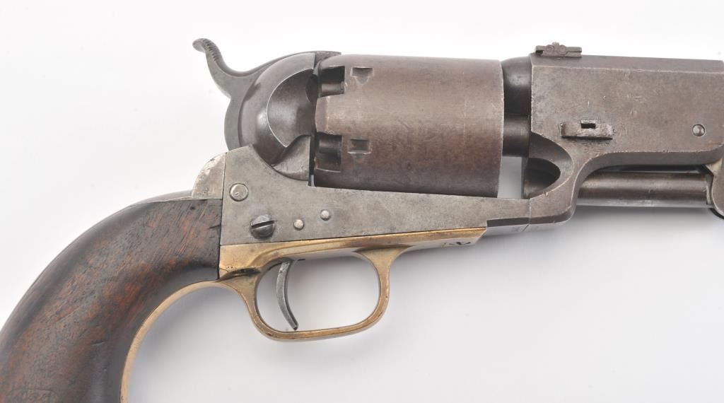 Colt 3rd Model Dragoon cut for shoulder stock and U.S. inspected, S/N 17005. Remaining in very good plus original condition with strong traces of blue and case colors mixed in a pleasing patina. Approximately 60%-70%original scene with visible U.S.M.R. and Colts patent. Sharp edges and good markings. Correct rear sight and all matching visible serial numbers. The grips are also very good plus with traces of cartouche on the left and full "W.A.T." on the right. The grips show some impressions from the stock and normal bumps and small losses at the toes. Good action and a quality cut for stock dragoon from the well-recognized Gary Wiemanncollection estate. (Antique) Est.: $7,500-$15,000