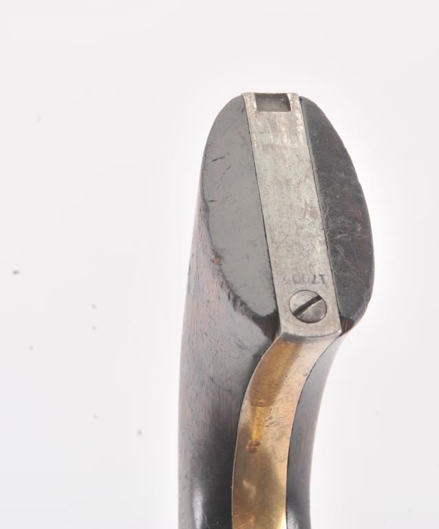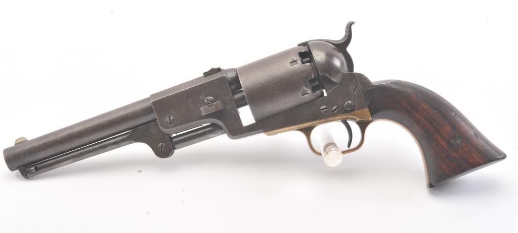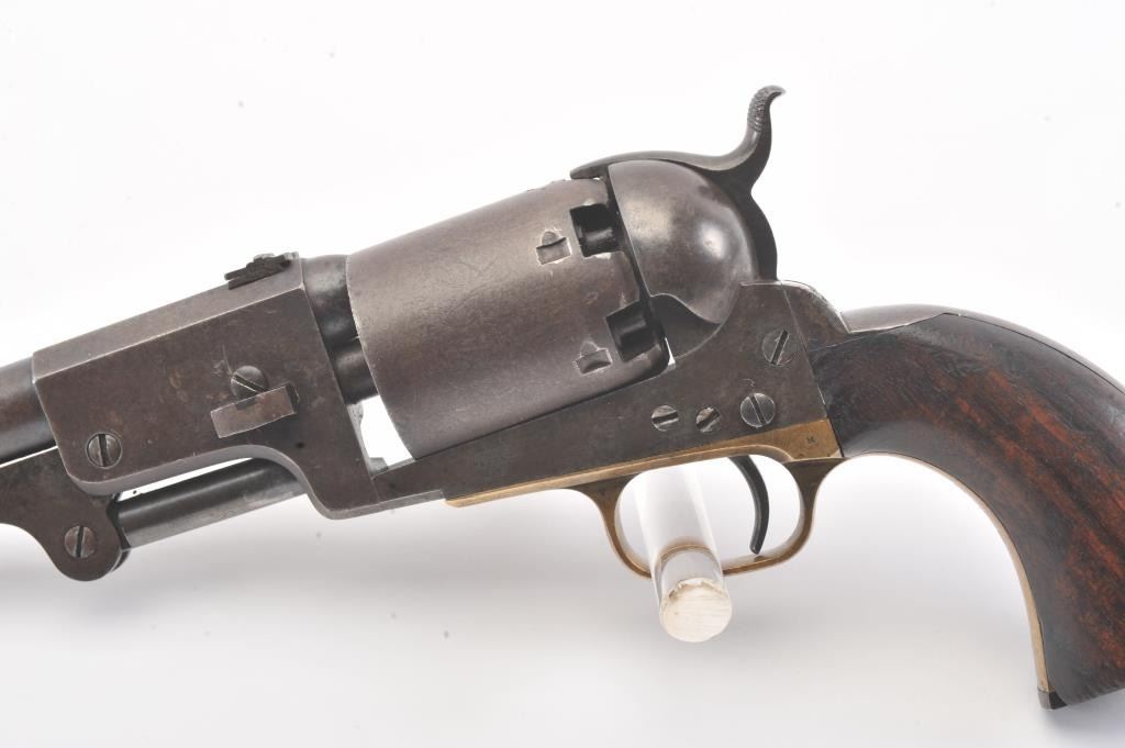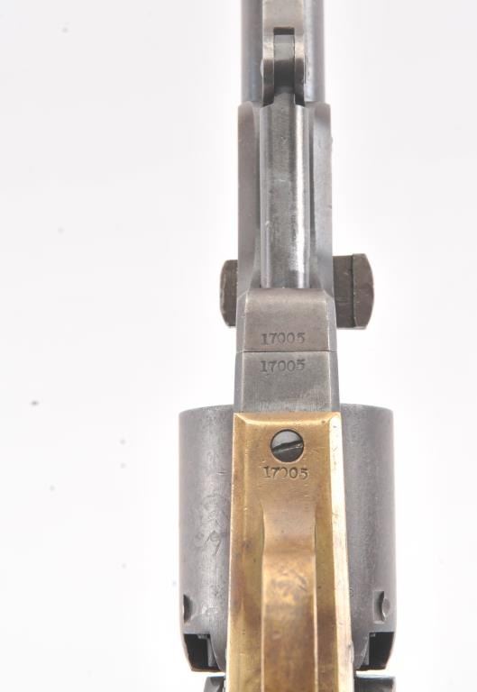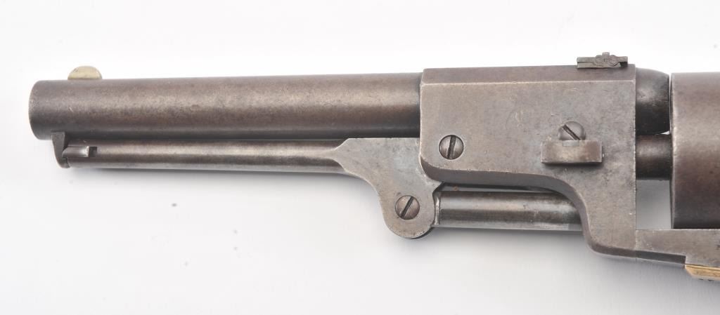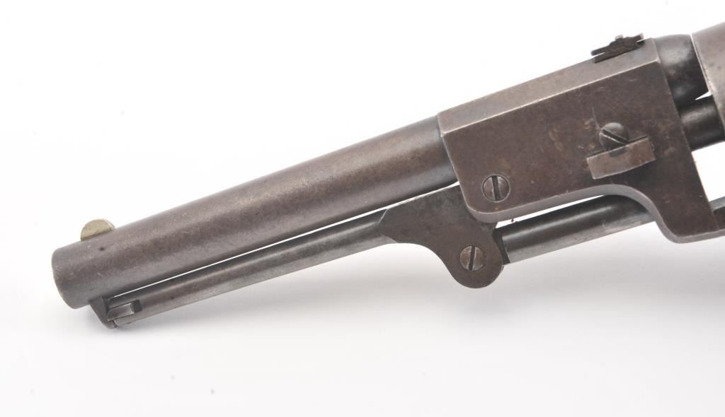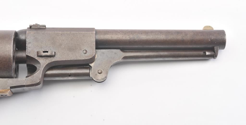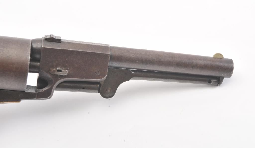 Colt 3rd Model Dragoon cut for shoulder stock and U.S. inspected, S/N 17005. Remaining in very good plus original condition with strong traces of blue and case colors mixed in a pleasing patina. Approximately 60%-70%original scene with visible U.S.M.R. and Colts patent. Sharp edges and good markings. Correct rear sight and all matching visible serial numbers. The grips are also very good plus with traces of cartouche on the left and full "W.A.T." on the right. The grips show some impressions from the stock and normal bumps and small losses at the toes. Good action and a quality cut for stock dragoon from the well-recognized Gary Wiemanncollection estate. (Antique) Est.: $7,500-$15,000