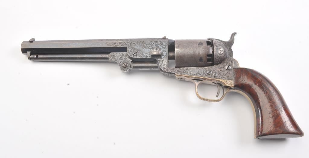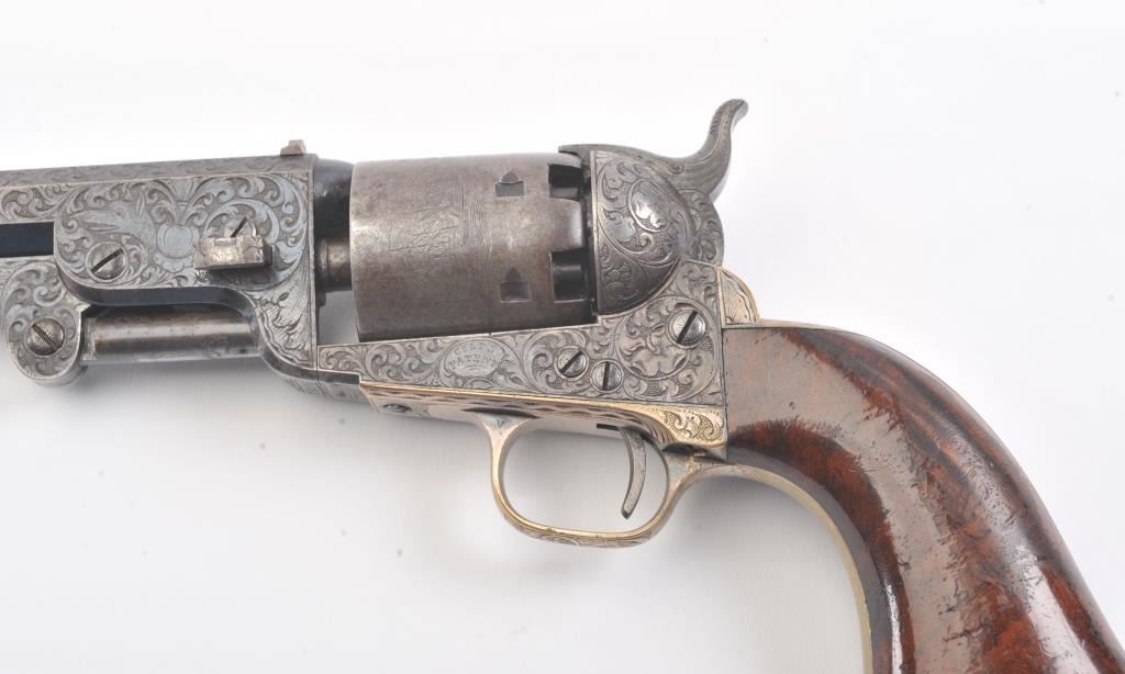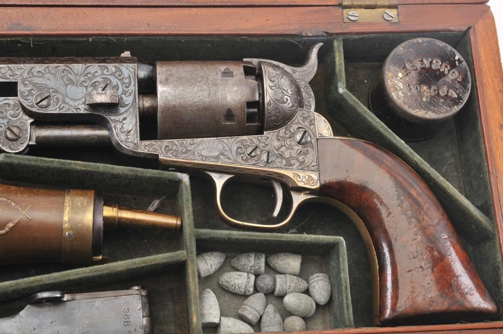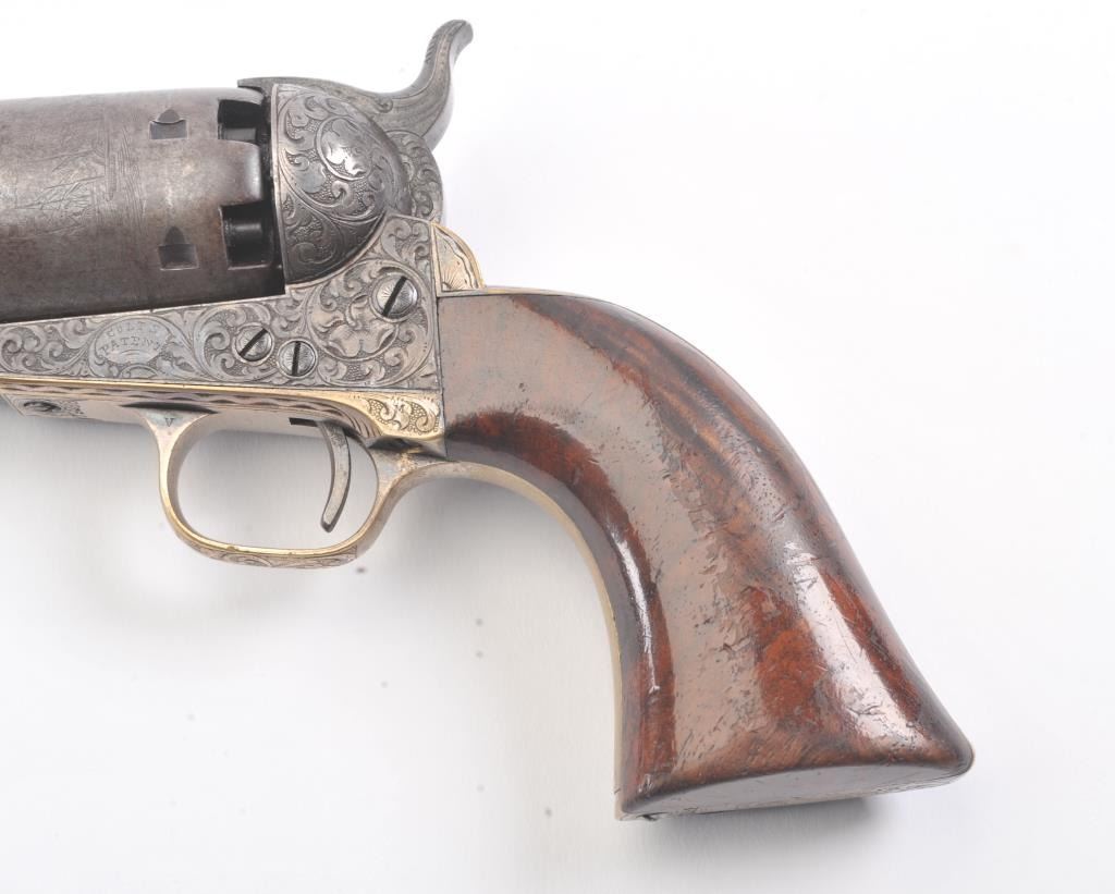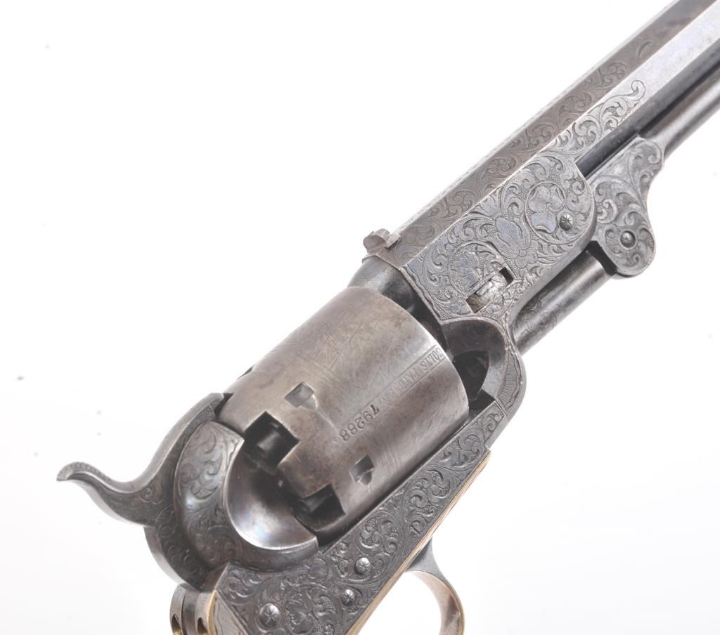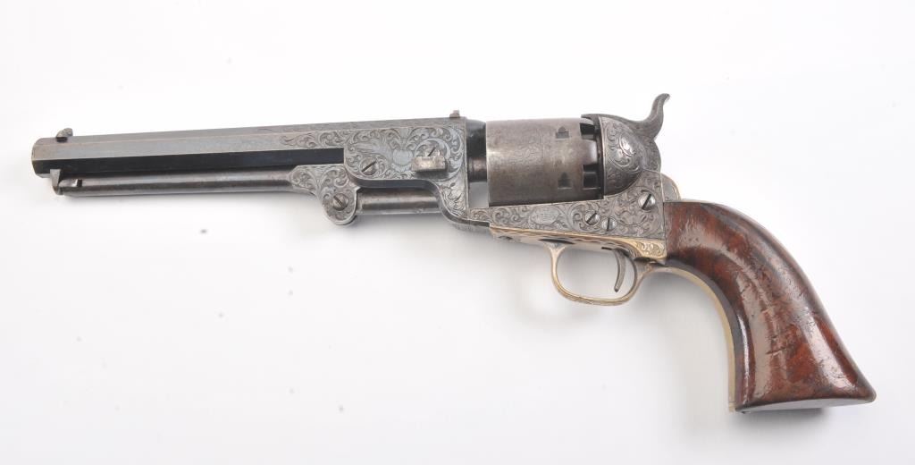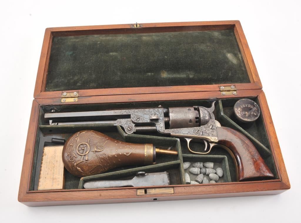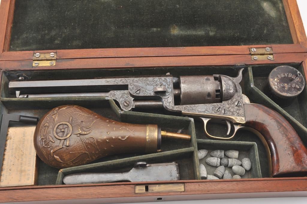Colt 1851 Navy Revolver Finely Deluxe Gustave Young engraved and cased with accessories, S/N 79228. This Navy shows exceptional Young treatments with dog head engraved on the left lug, hand cut Colt's patent, florals and masterful and deep engraving of deluxe quality. The barrel shows 30%-50% original blue that is toning and drifting to patina. The cylinder shows traces of blue that and 50% plus light original cylinder scene. The frame, hammers and lever show 40%-60% case colors turning to silver but still some good tones. 30%-50% silver on the straps. The grips are burl walnut and are good to very good with 30%-50% varnish and even loss due to wear and some use. All matching visible numbers. Period added V notch and blade front sight. Contained in an original partition style Navy case lined with green velveteen. The interior is very good plus with minor wear and aging. A very good bent spout Navy flask with 70%-80% lacquer is included along with 36 B mold, wrench, cap tin and authentic unopened cartridge pack. The exterior of the case is very good with minor cracks. From the well-recognized Gary Wiemann Estate Collection. (Antique) Est.: $10,000-$20,000