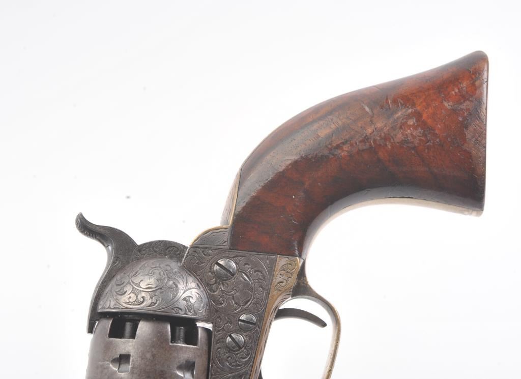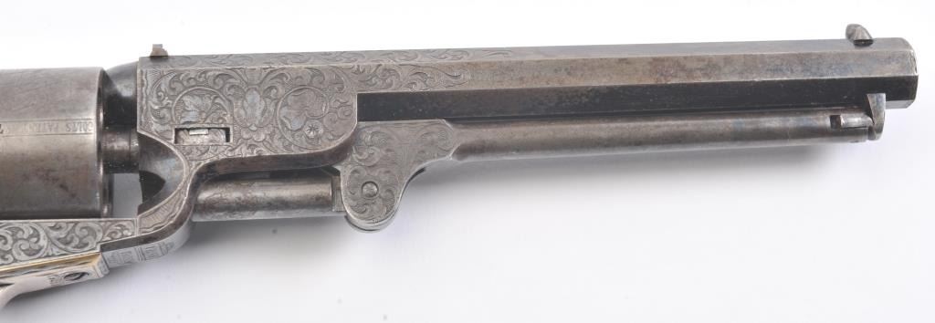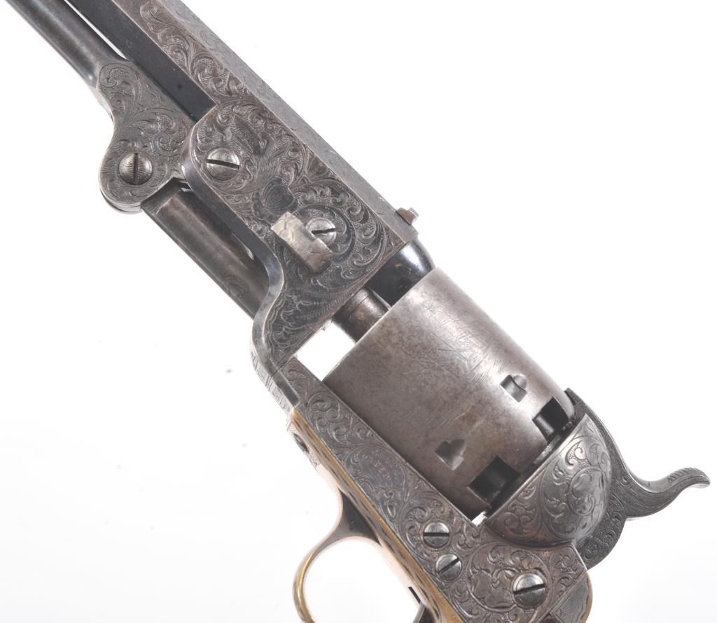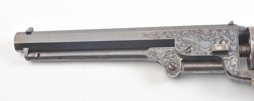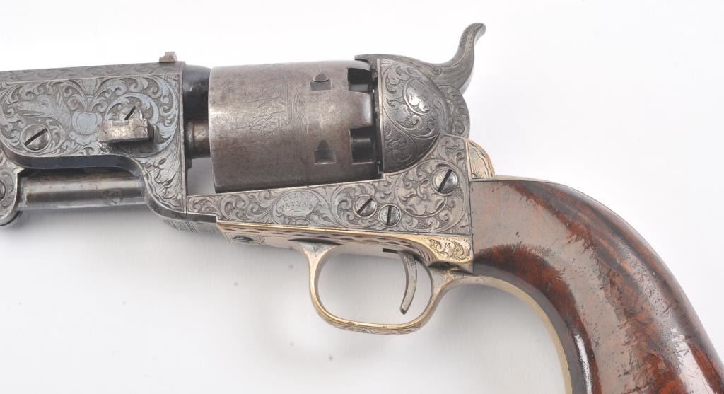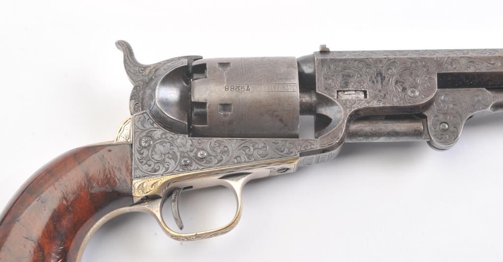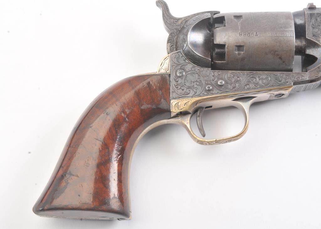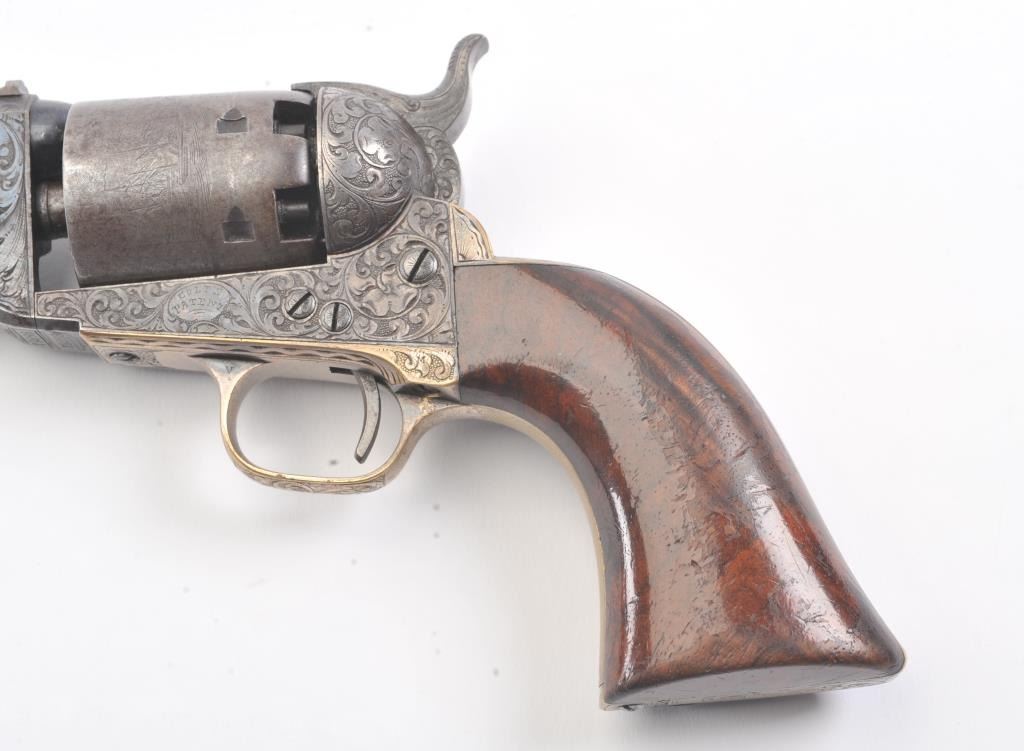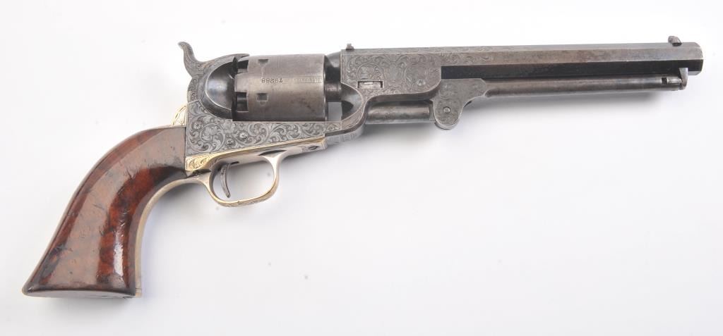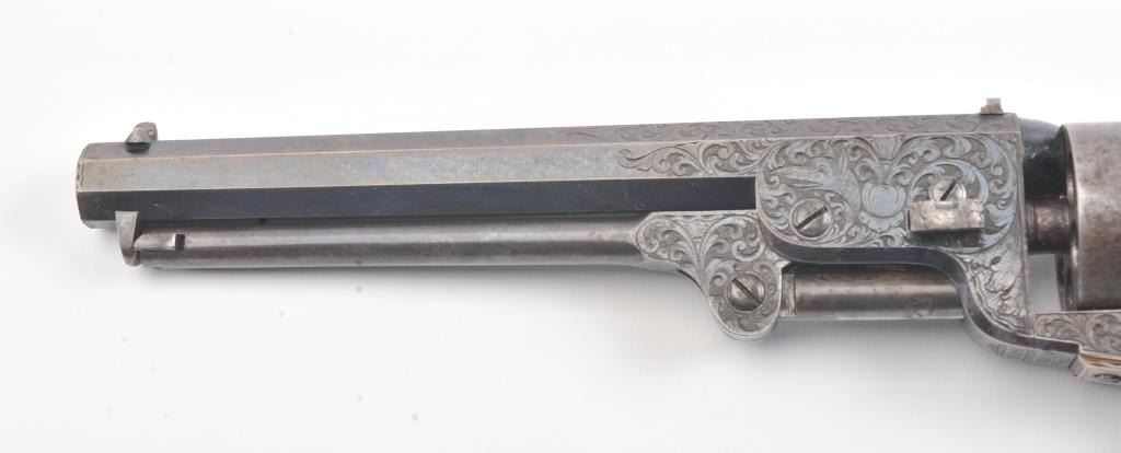 Colt 1851 Navy Revolver Finely Deluxe Gustave Young engraved and cased with accessories, S/N 79228. This Navy shows exceptional Young treatments with dog head engraved on the left lug, hand cut Colt's patent, florals and masterful and deep engraving of deluxe quality. The barrel shows 30%-50% original blue that is toning and drifting to patina. The cylinder shows traces of blue that and 50% plus light original cylinder scene. The frame, hammers and lever show 40%-60% case colors turning to silver but still some good tones. 30%-50% silver on the straps. The grips are burl walnut and are good to very good with 30%-50% varnish and even loss due to wear and some use. All matching visible numbers. Period added V notch and blade front sight. Contained in an original partition style Navy case lined with green velveteen. The interior is very good plus with minor wear and aging. A very good bent spout Navy flask with 70%-80% lacquer is included along with 36 B mold, wrench, cap tin and authentic unopened cartridge pack. The exterior of the case is very good with minor cracks. From the well-recognized Gary Wiemann Estate Collection. (Antique) Est.: $10,000-$20,000