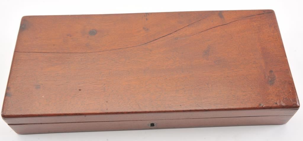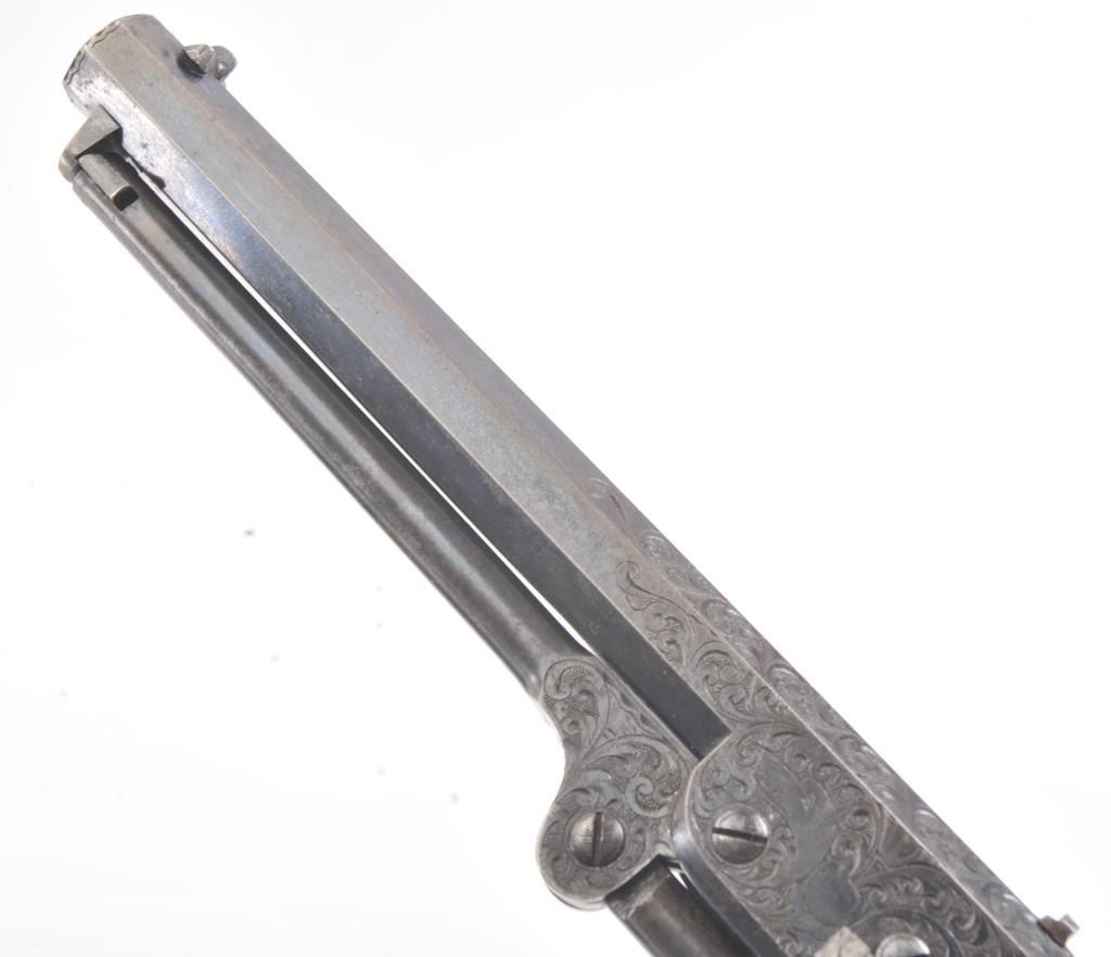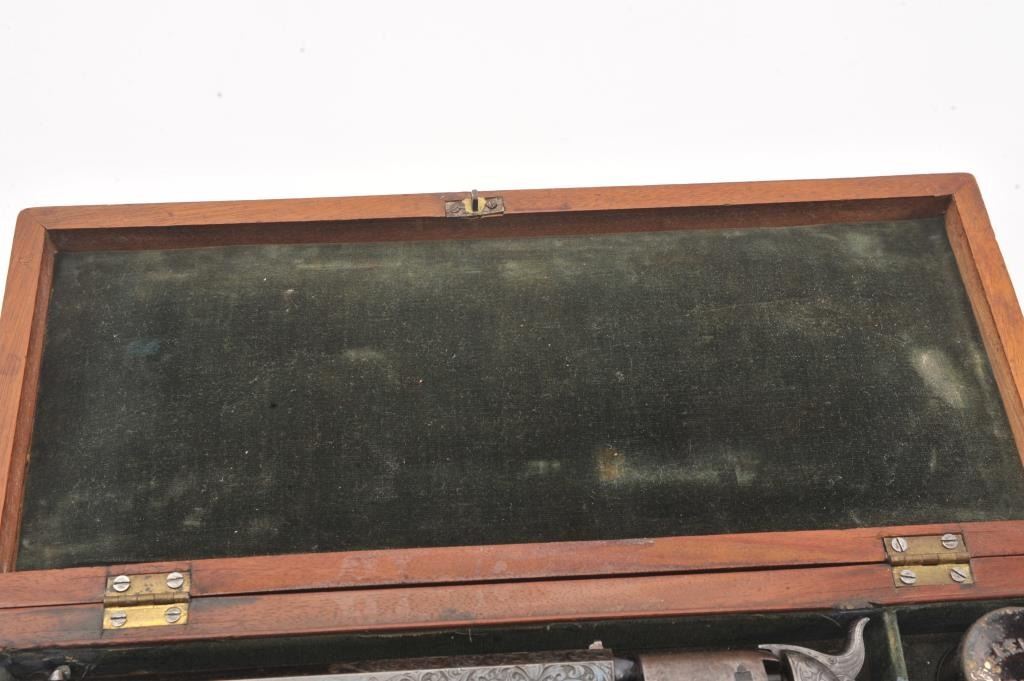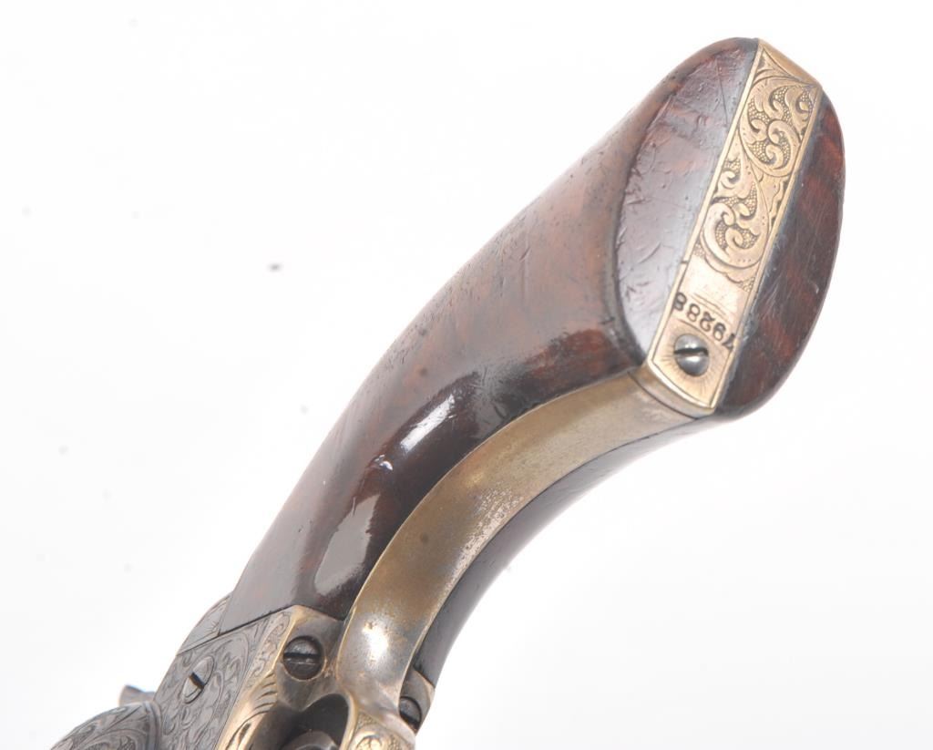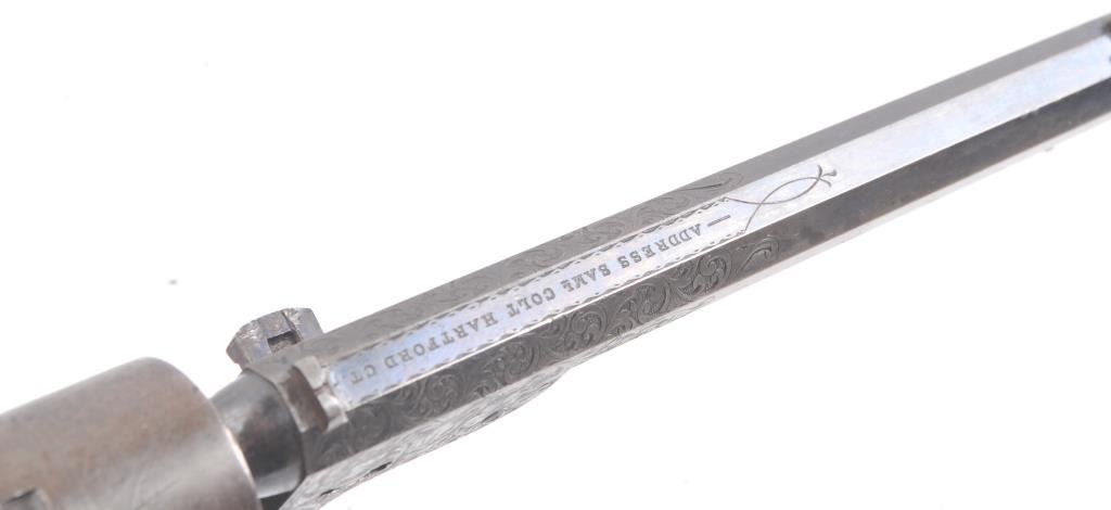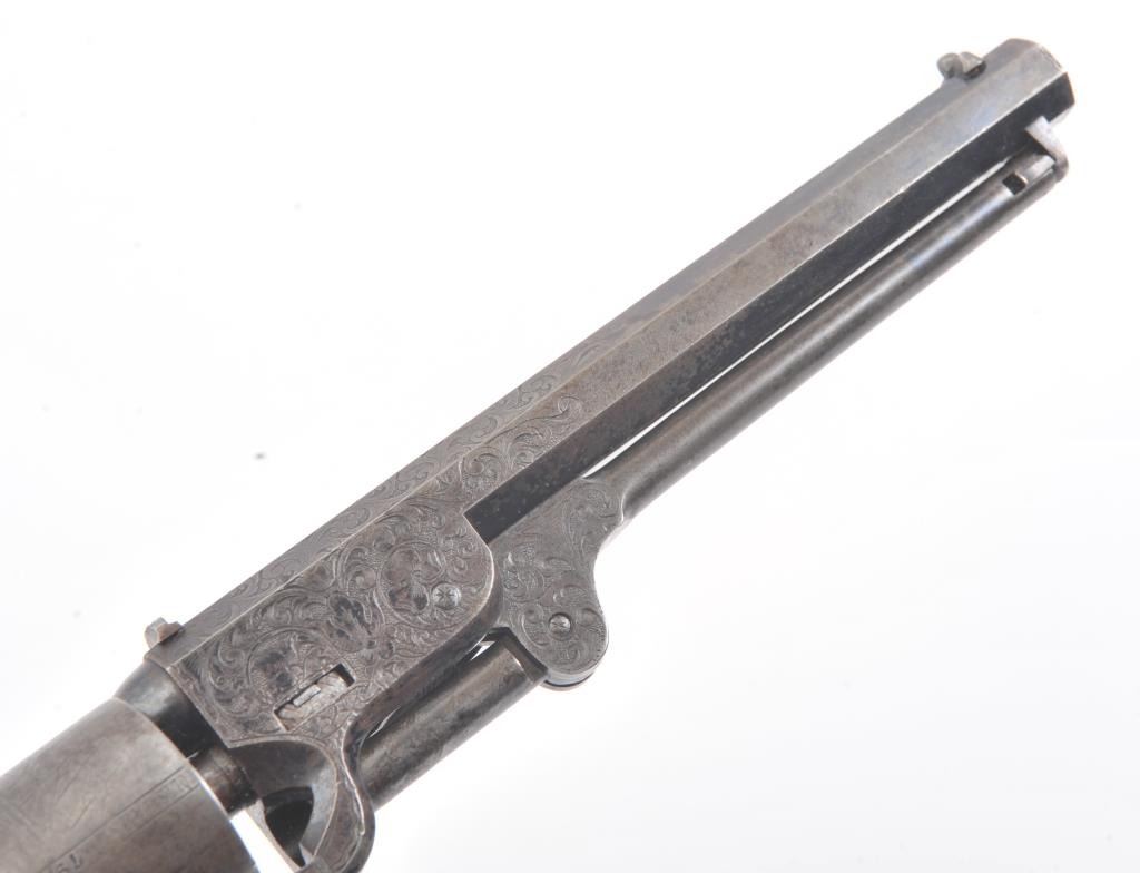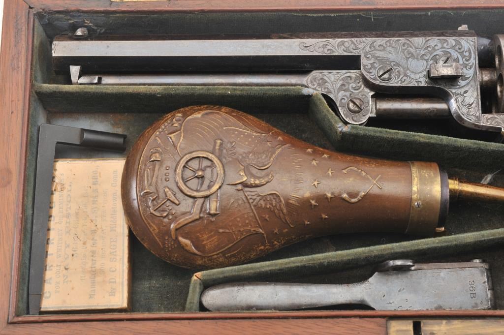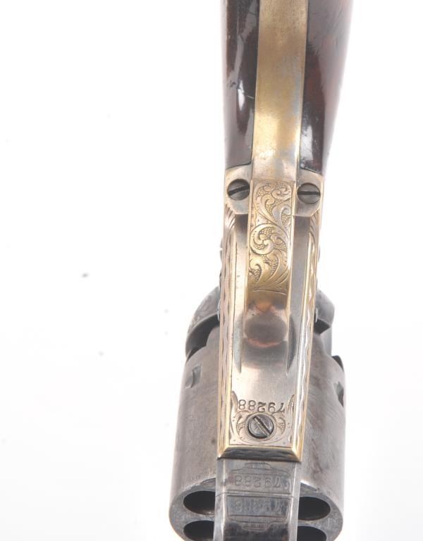 Colt 1851 Navy Revolver Finely Deluxe Gustave Young engraved and cased with accessories, S/N 79228. This Navy shows exceptional Young treatments with dog head engraved on the left lug, hand cut Colt's patent, florals and masterful and deep engraving of deluxe quality. The barrel shows 30%-50% original blue that is toning and drifting to patina. The cylinder shows traces of blue that and 50% plus light original cylinder scene. The frame, hammers and lever show 40%-60% case colors turning to silver but still some good tones. 30%-50% silver on the straps. The grips are burl walnut and are good to very good with 30%-50% varnish and even loss due to wear and some use. All matching visible numbers. Period added V notch and blade front sight. Contained in an original partition style Navy case lined with green velveteen. The interior is very good plus with minor wear and aging. A very good bent spout Navy flask with 70%-80% lacquer is included along with 36 B mold, wrench, cap tin and authentic unopened cartridge pack. The exterior of the case is very good with minor cracks. From the well-recognized Gary Wiemann Estate Collection. (Antique) Est.: $10,000-$20,000