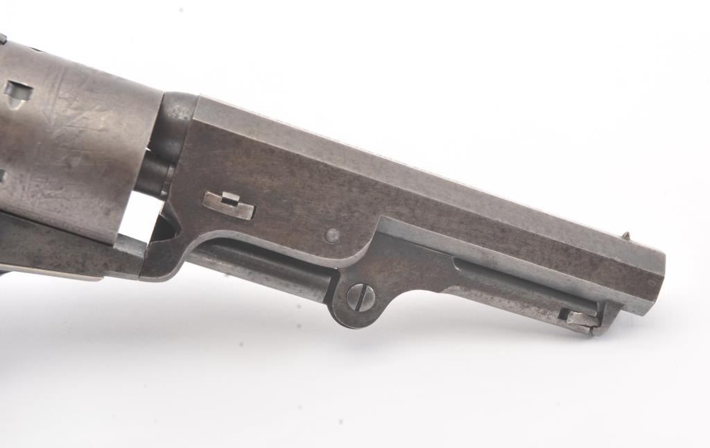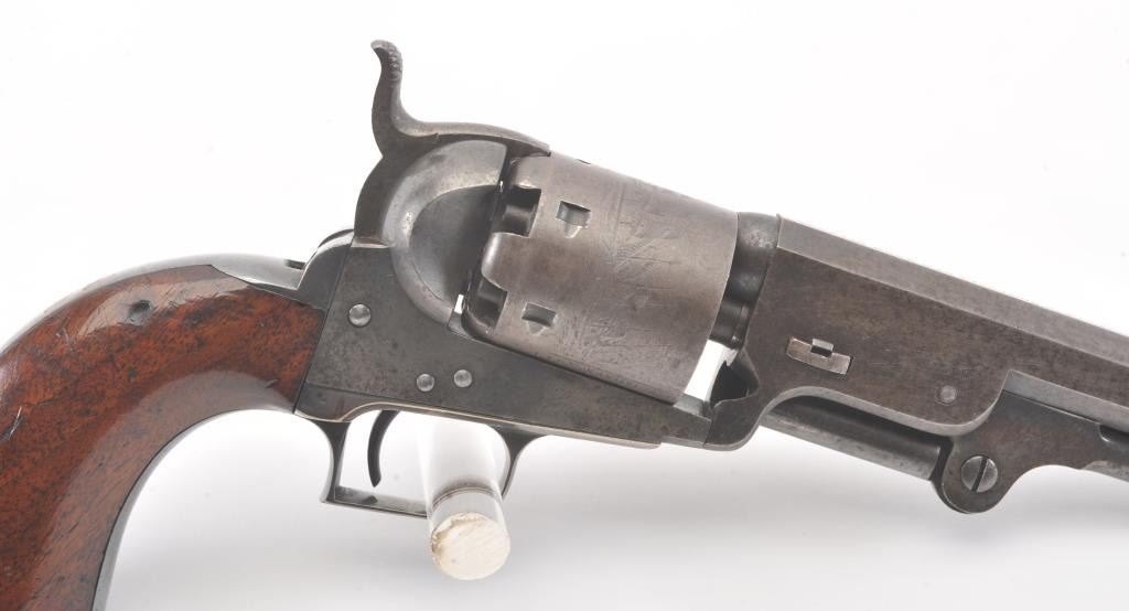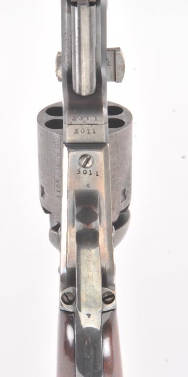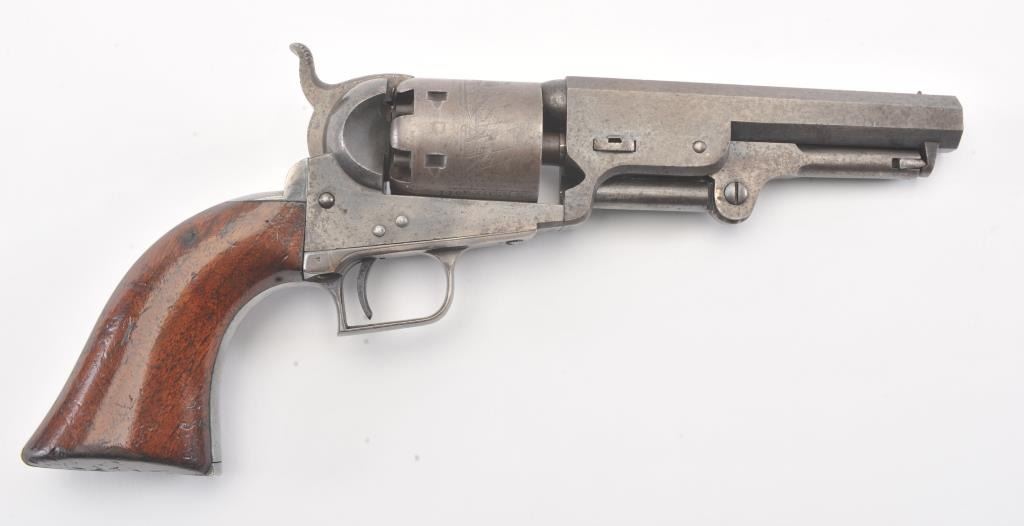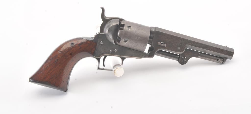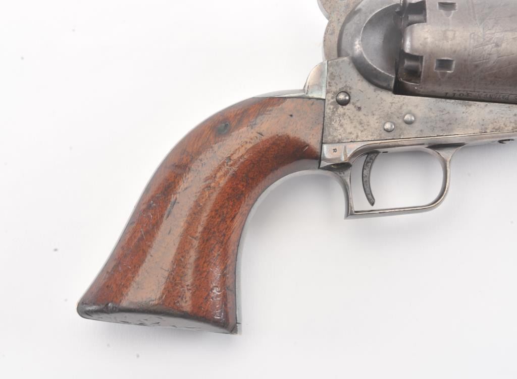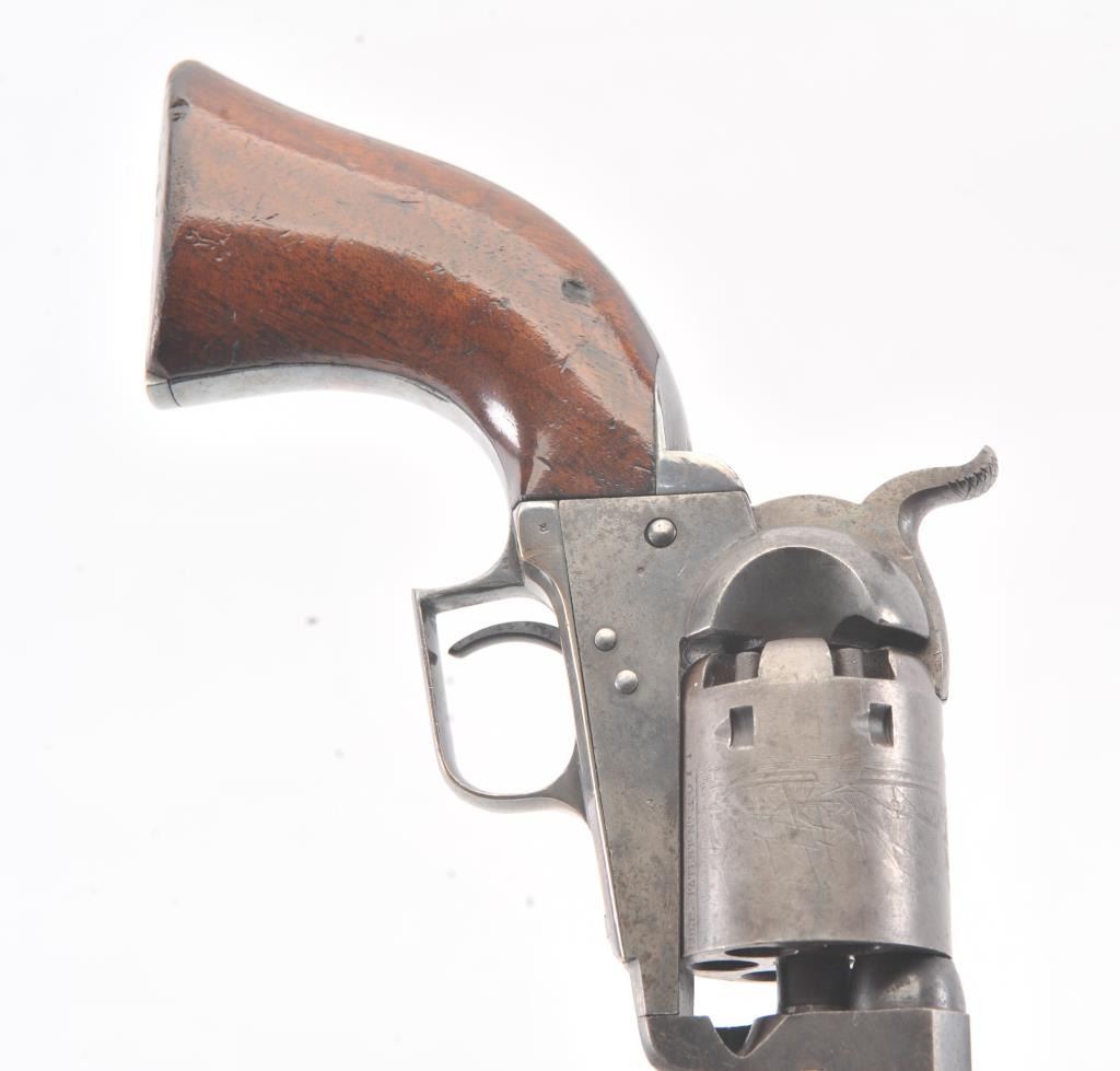 Colt 1851 Navy 2nd Model Square back with period "Reduced" length inscribed "B. Brandieth" in period script on the back strap, S/N 3011. The barrel retains 30%-50% original blue going to a "Soft" naturalpatina. The cylinder shows most of its original scene and sharp Ormsby signature. All matching visible numbers. 50%-70% light original case colors on the frame, hammer, and rammer. The grips show 50%-70% varnishwith wear at the edges and many "tacking" marks on the butt probably from horse shoe nails. All matching and crisp. Note: Our recollection is that B. Brandieth was a San Francisco wine merchant that made his fortune in the gold rush. From the well-recognized collection of Gary Wiemann. (Antique) Est.: $2,500-$5,000