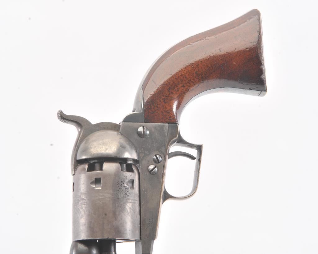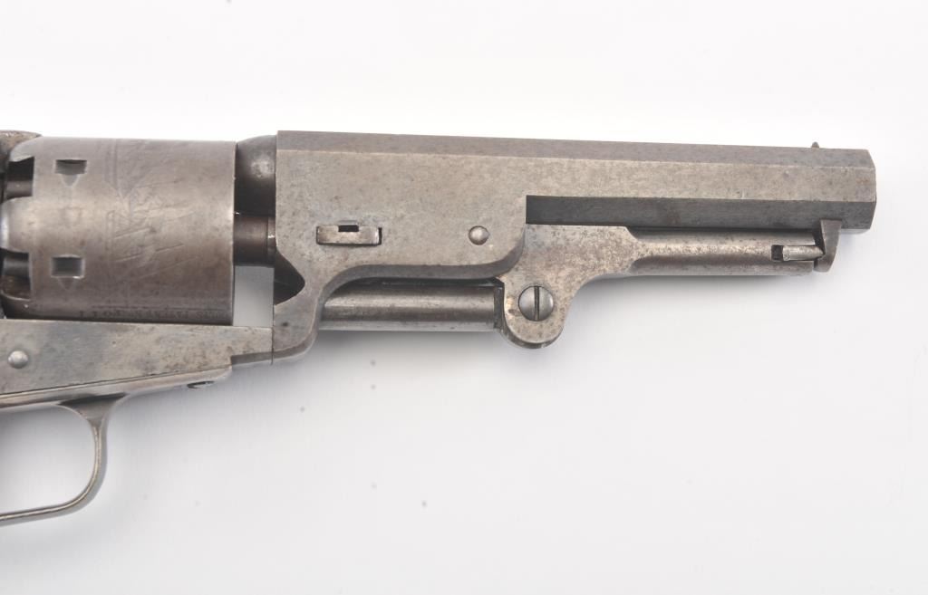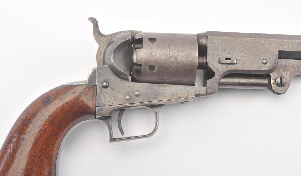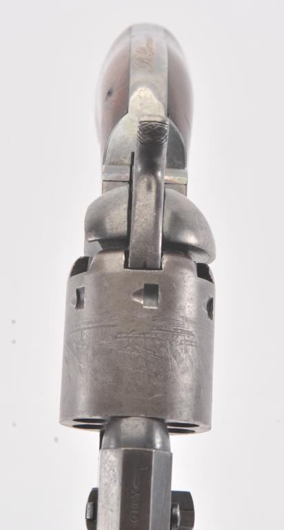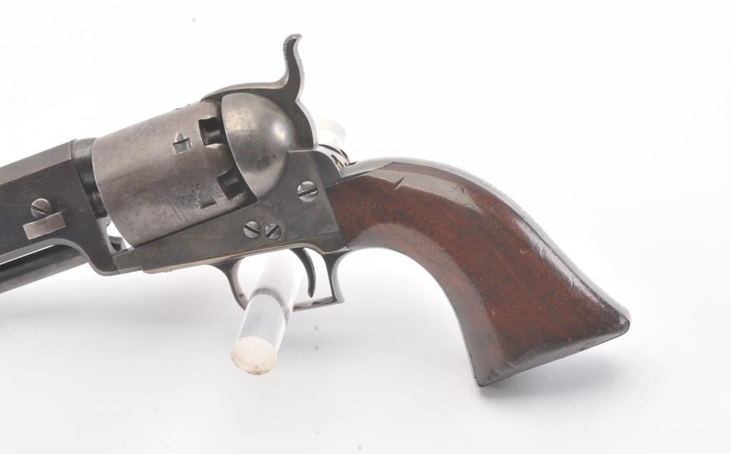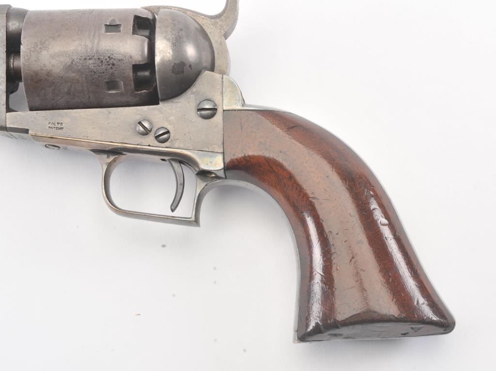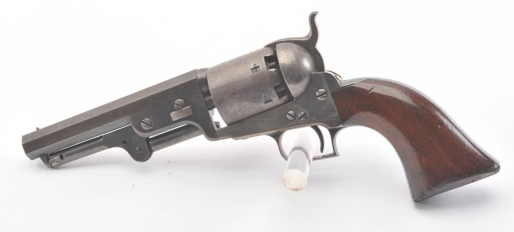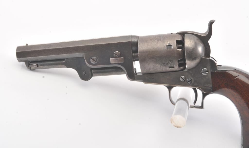 Colt 1851 Navy 2nd Model Square back with period "Reduced" length inscribed "B. Brandieth" in period script on the back strap, S/N 3011. The barrel retains 30%-50% original blue going to a "Soft" naturalpatina. The cylinder shows most of its original scene and sharp Ormsby signature. All matching visible numbers. 50%-70% light original case colors on the frame, hammer, and rammer. The grips show 50%-70% varnishwith wear at the edges and many "tacking" marks on the butt probably from horse shoe nails. All matching and crisp. Note: Our recollection is that B. Brandieth was a San Francisco wine merchant that made his fortune in the gold rush. From the well-recognized collection of Gary Wiemann. (Antique) Est.: $2,500-$5,000