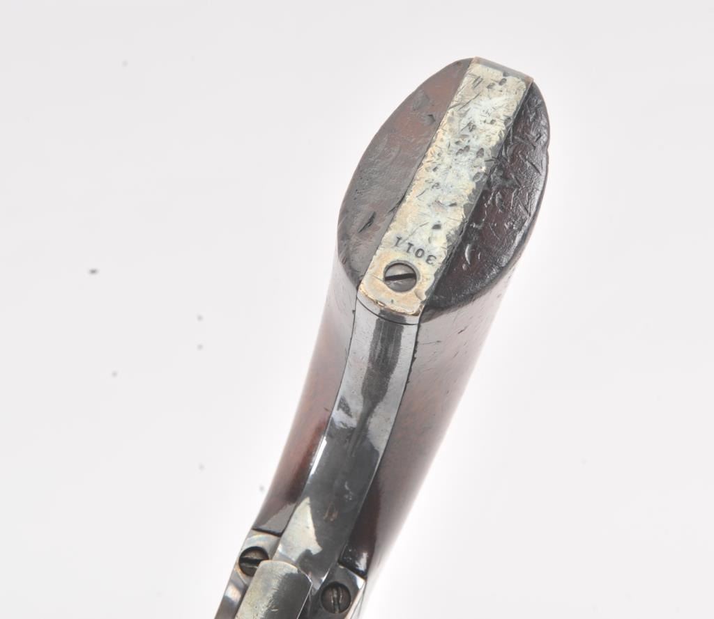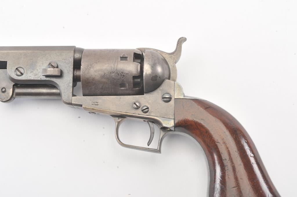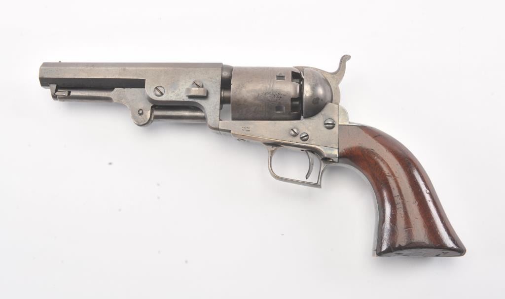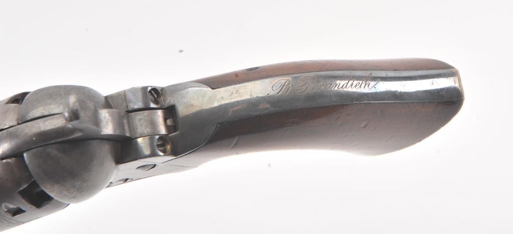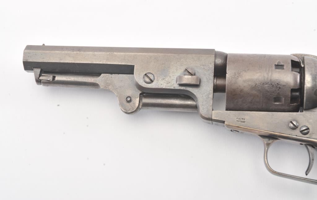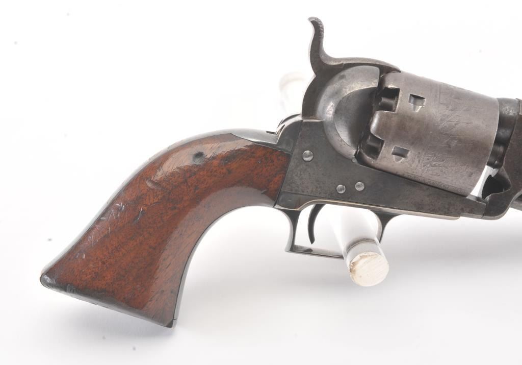 Colt 1851 Navy 2nd Model Square back with period "Reduced" length inscribed "B. Brandieth" in period script on the back strap, S/N 3011. The barrel retains 30%-50% original blue going to a "Soft" naturalpatina. The cylinder shows most of its original scene and sharp Ormsby signature. All matching visible numbers. 50%-70% light original case colors on the frame, hammer, and rammer. The grips show 50%-70% varnishwith wear at the edges and many "tacking" marks on the butt probably from horse shoe nails. All matching and crisp. Note: Our recollection is that B. Brandieth was a San Francisco wine merchant that made his fortune in the gold rush. From the well-recognized collection of Gary Wiemann. (Antique) Est.: $2,500-$5,000