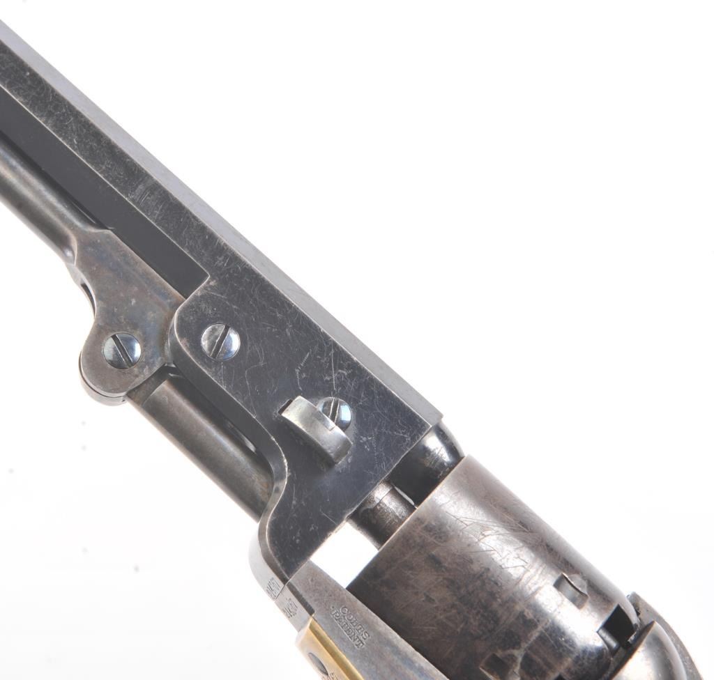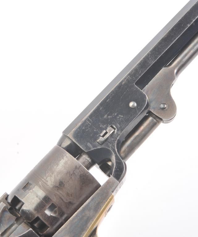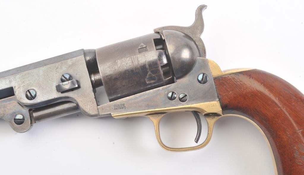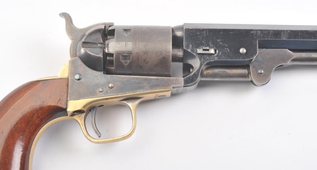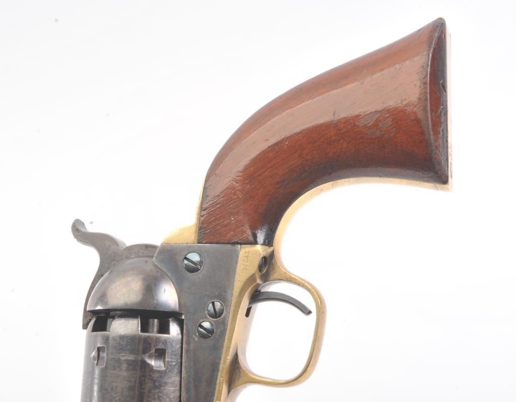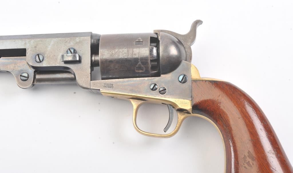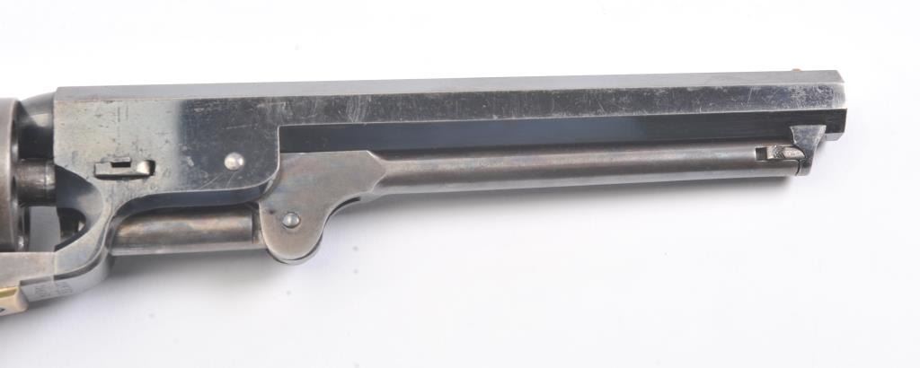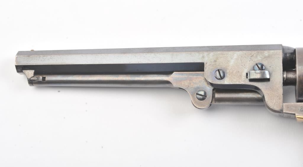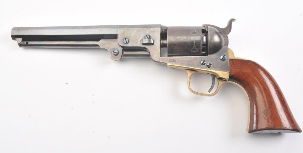 Colt 1851 Navy Revolver 4th Model with capping groove remaining in fine original condition, S/N 214367. The barrel retains 80%-90% bright and inky blue finish with minor losses at the edges and muzzle andslight scratches. The edges and markings are crisp. The cylinder shows nearly all of the late in production "Light" scene with 30%-50% blue going to a patina. The frame, hammer and lever show 70%-80% case colors with still colorful rainbow hues going slightly "Soft". The silver has drifted as normal on late navies with traces on the brass straps with "Honey" patina. The grips are near fine with 80%-90% varnish remaining and minor dings,mars and scratches with a couple of dents. All matching visible numbers. Bright finish on the small parts and screws. A strong 8.5 on a 1-10 scale. From the well-recognized Gary Wiemann collection. (Antique) Est.:$7,000-$14,000