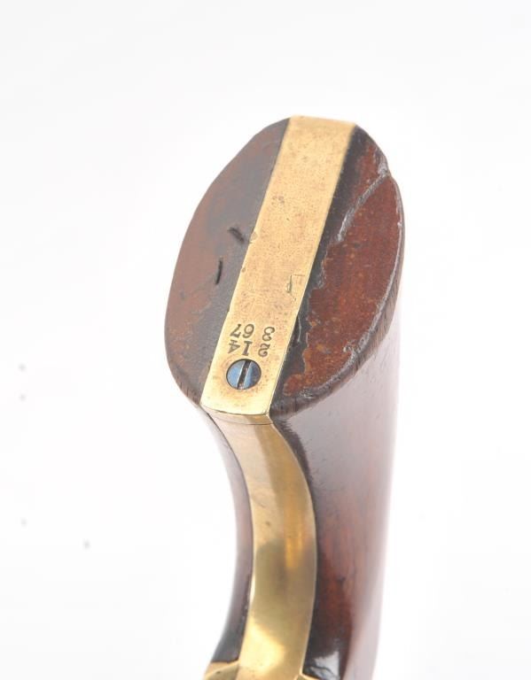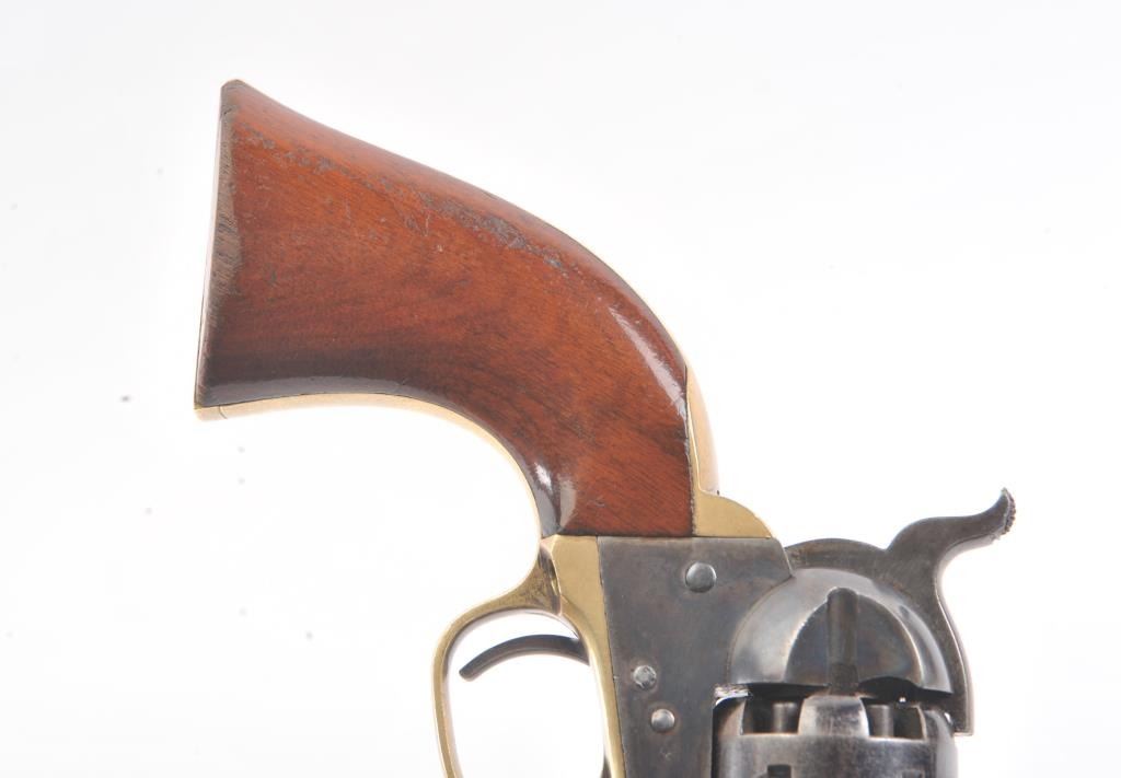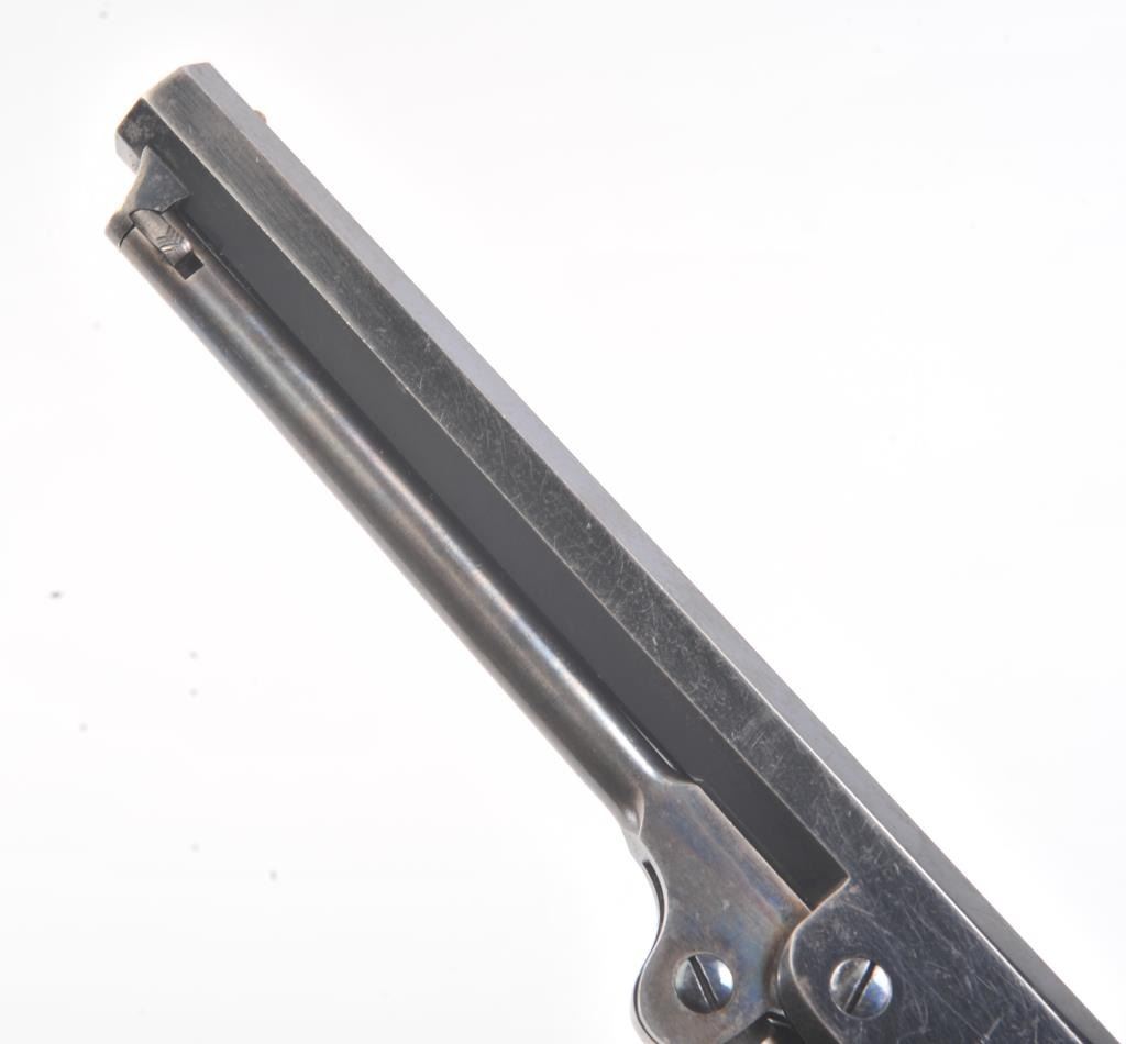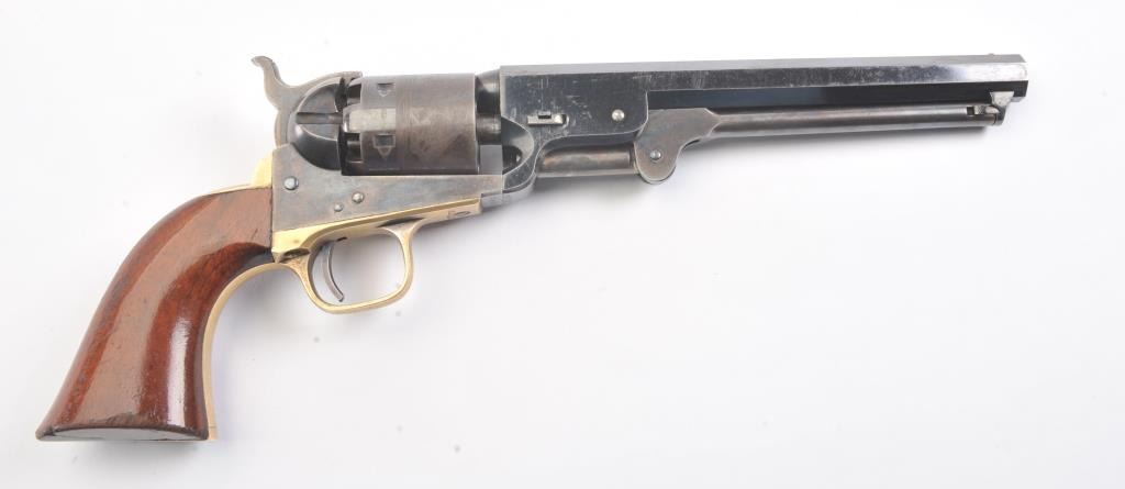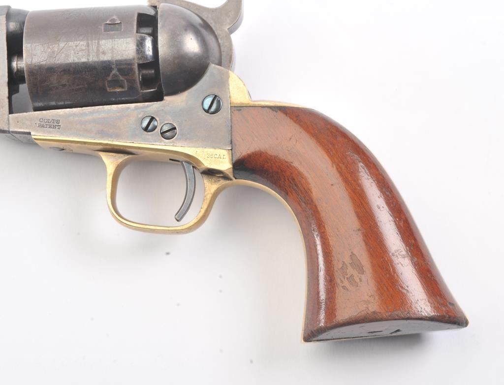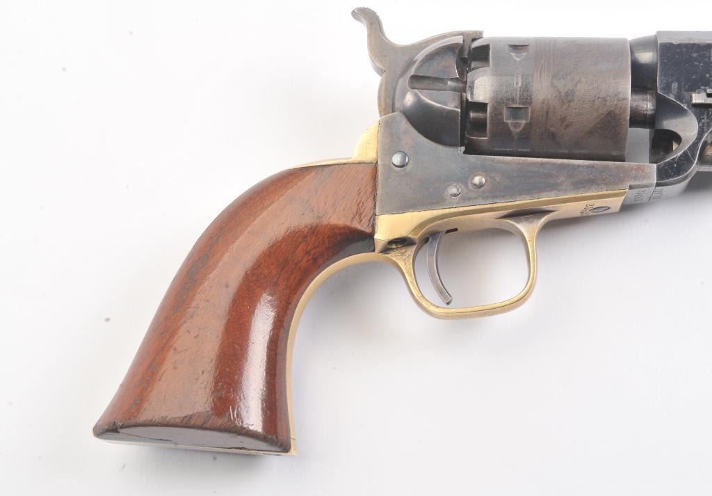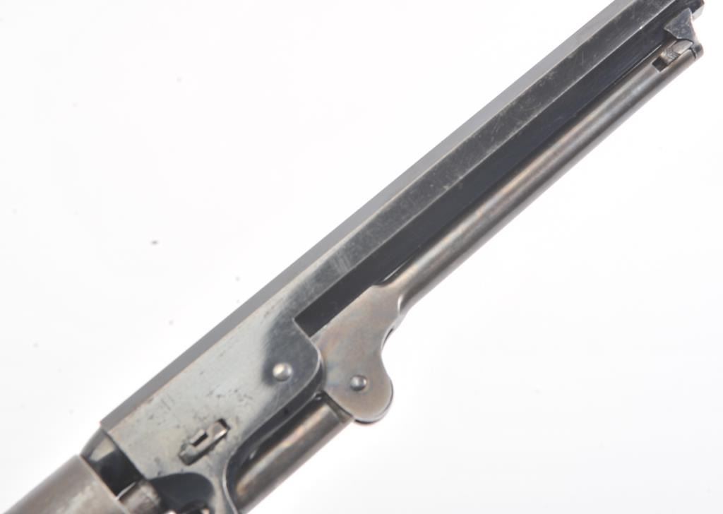 Colt 1851 Navy Revolver 4th Model with capping groove remaining in fine original condition, S/N 214367. The barrel retains 80%-90% bright and inky blue finish with minor losses at the edges and muzzle andslight scratches. The edges and markings are crisp. The cylinder shows nearly all of the late in production "Light" scene with 30%-50% blue going to a patina. The frame, hammer and lever show 70%-80% case colors with still colorful rainbow hues going slightly "Soft". The silver has drifted as normal on late navies with traces on the brass straps with "Honey" patina. The grips are near fine with 80%-90% varnish remaining and minor dings,mars and scratches with a couple of dents. All matching visible numbers. Bright finish on the small parts and screws. A strong 8.5 on a 1-10 scale. From the well-recognized Gary Wiemann collection. (Antique) Est.:$7,000-$14,000