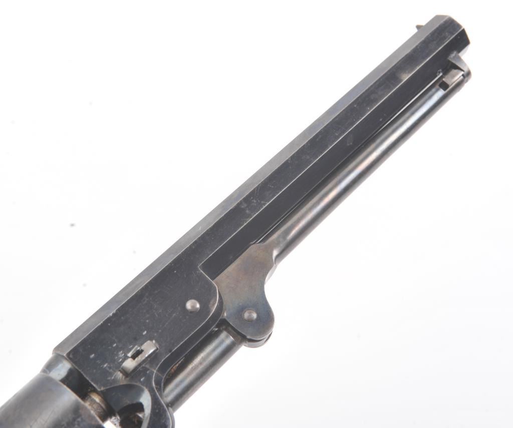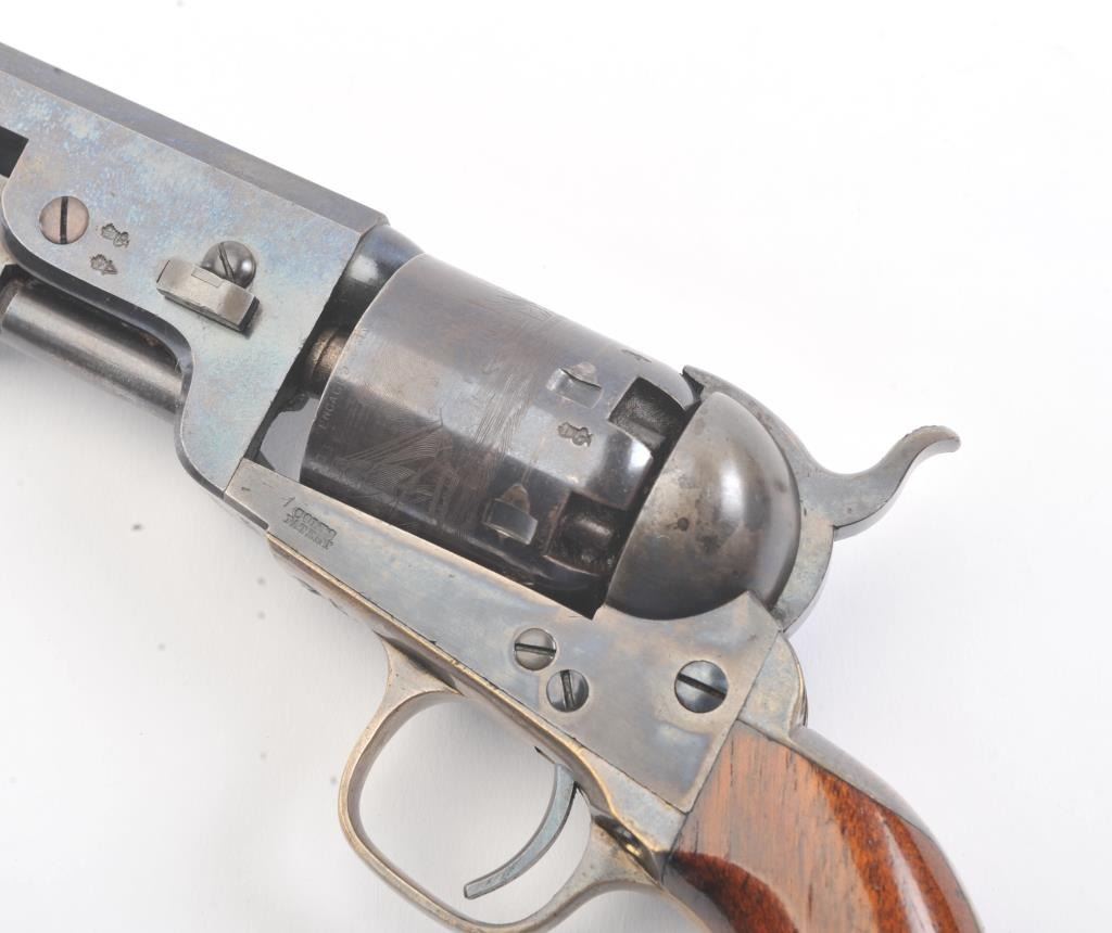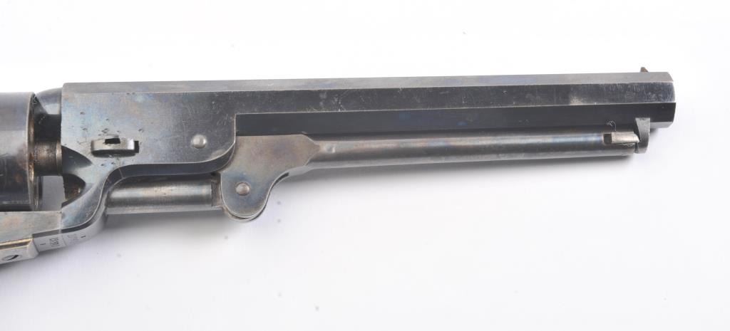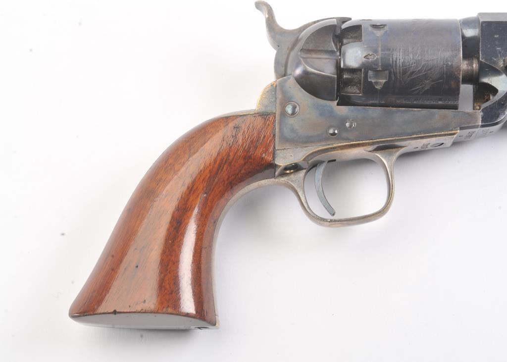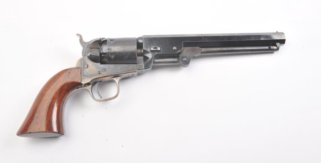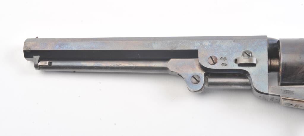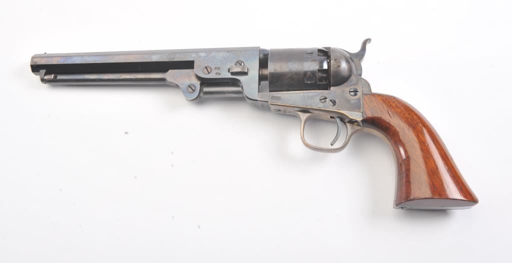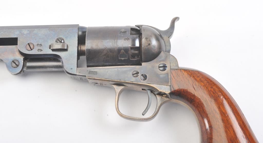 Colt 1851 Navy Revolver in fine original condition, S/N 130630E with New York address and British proofs indicating London returned to U.S. during the Civil War. This Colt shows 90%-95% plus bright and "Inky" blue onthe barrel with light losses at the edges and small scratches. The cylinder shows all of its scene and 80%-90% plus original blue toning slightly. The frame, hammer and lever shows 90%-95% case colors aging and toningvery slightly with slight losses mostly at the top rear of recoil shield areas. The grips are fine with 90%-95% plus original varnish showing very slight aging and minor handling marks. Nearly all the toned silveris present on straps. Bright finish on small parts and screws. All matching visible serial numbers. A strong 9+ on a 1-10 scale. From the well-recognized Gary Wiemann estate collection. (Antique) Est.: $7,500-$15,000
