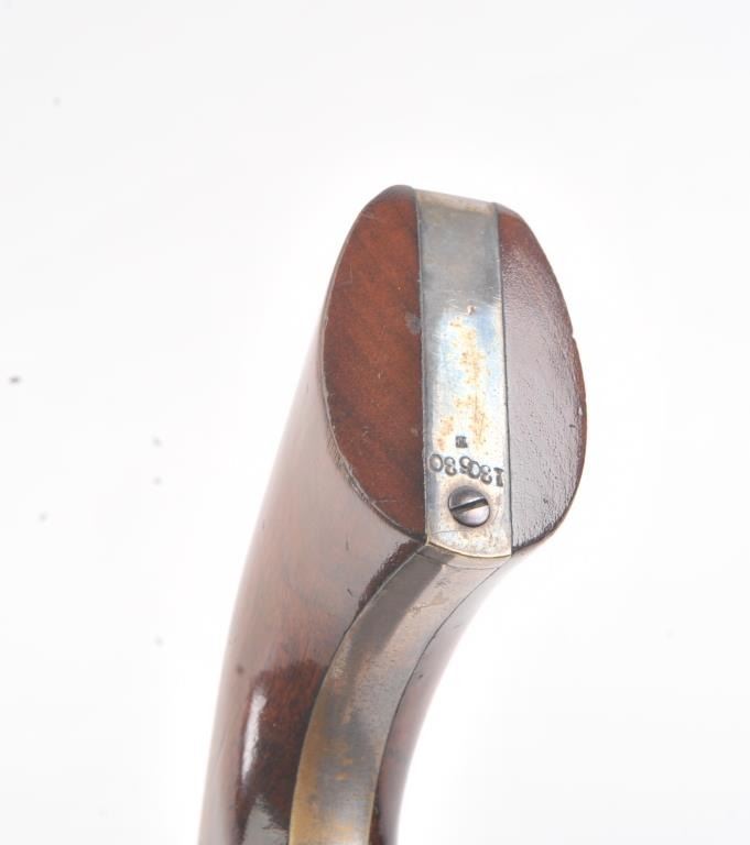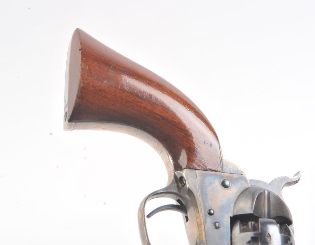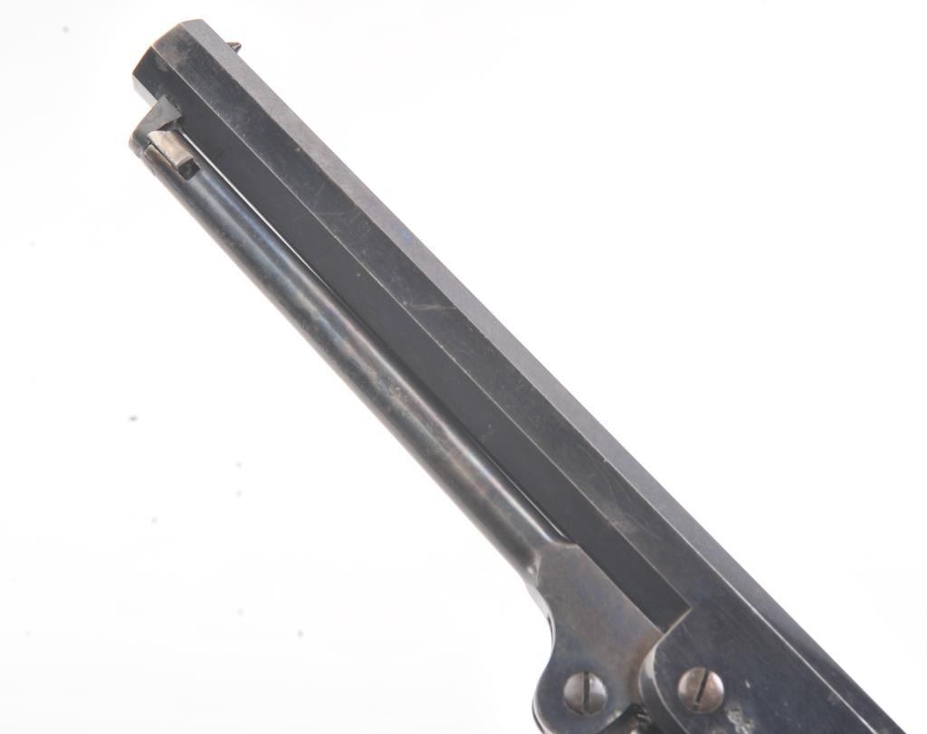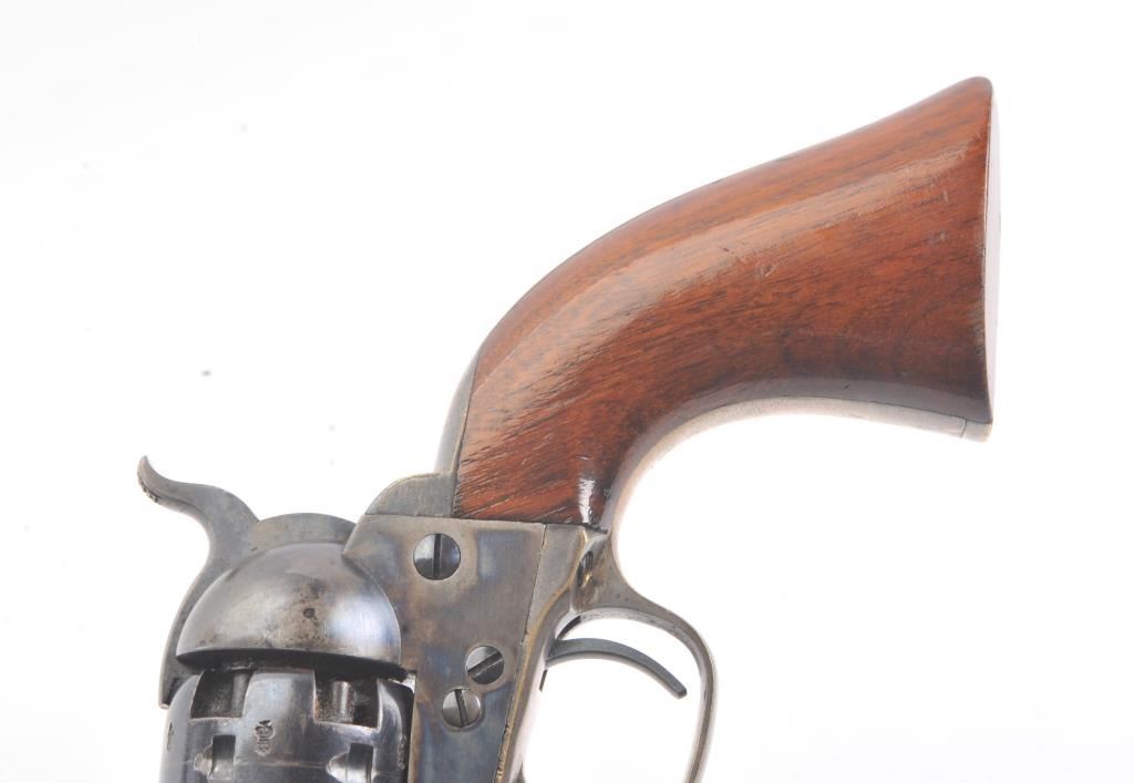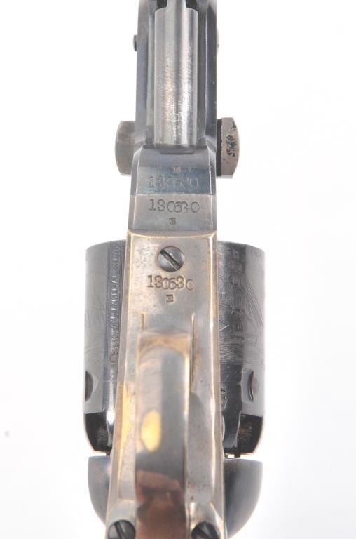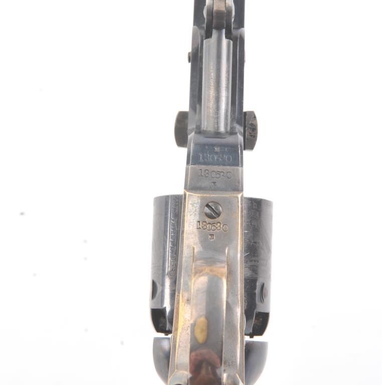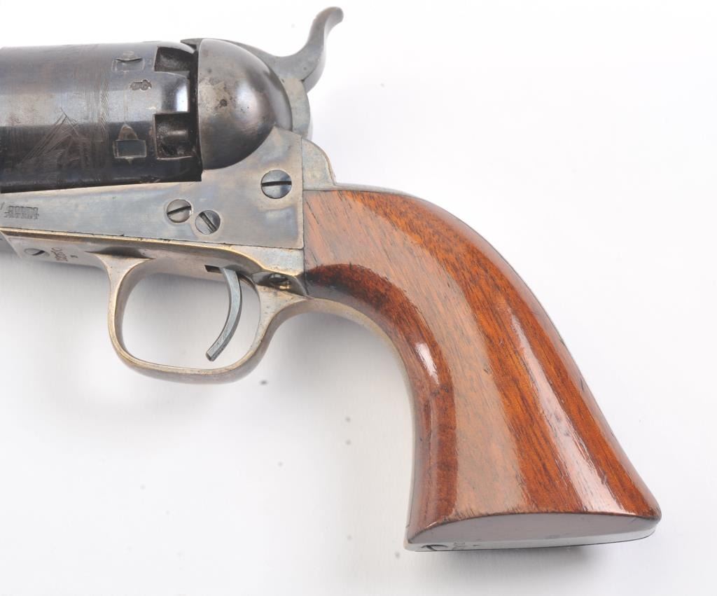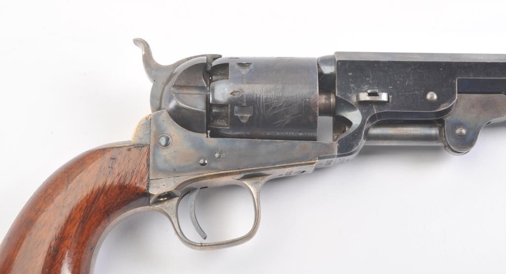 Colt 1851 Navy Revolver in fine original condition, S/N 130630E with New York address and British proofs indicating London returned to U.S. during the Civil War. This Colt shows 90%-95% plus bright and "Inky" blue onthe barrel with light losses at the edges and small scratches. The cylinder shows all of its scene and 80%-90% plus original blue toning slightly. The frame, hammer and lever shows 90%-95% case colors aging and toningvery slightly with slight losses mostly at the top rear of recoil shield areas. The grips are fine with 90%-95% plus original varnish showing very slight aging and minor handling marks. Nearly all the toned silveris present on straps. Bright finish on small parts and screws. All matching visible serial numbers. A strong 9+ on a 1-10 scale. From the well-recognized Gary Wiemann estate collection. (Antique) Est.: $7,500-$15,000
