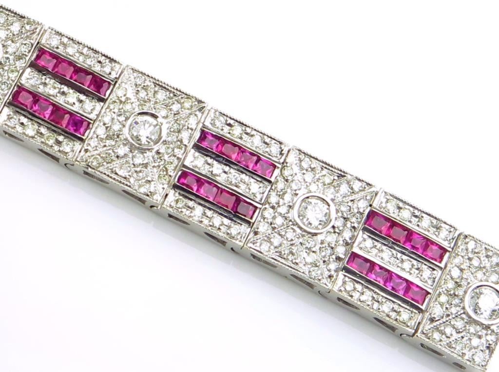 1. Spectacular hard to find Vintage Art Deco Design Bracelet featuring 8 ‘IDEAL’ cut Diamonds and over 353 round Diamonds weighing approx. 10.00 carats total with G-H colors and VS/SI clarity accented with 64 Extra Fine channel set Natural Rubies weighing approx. 8.00 carats. Total Gem weight approx. 18.00-20.00 carats set in an intricate, very labor intensive 14 karat white gold vintage design mounting weighing over 67 grams.Retail $30,000-$40,000 Estimates $15,000-$20,000