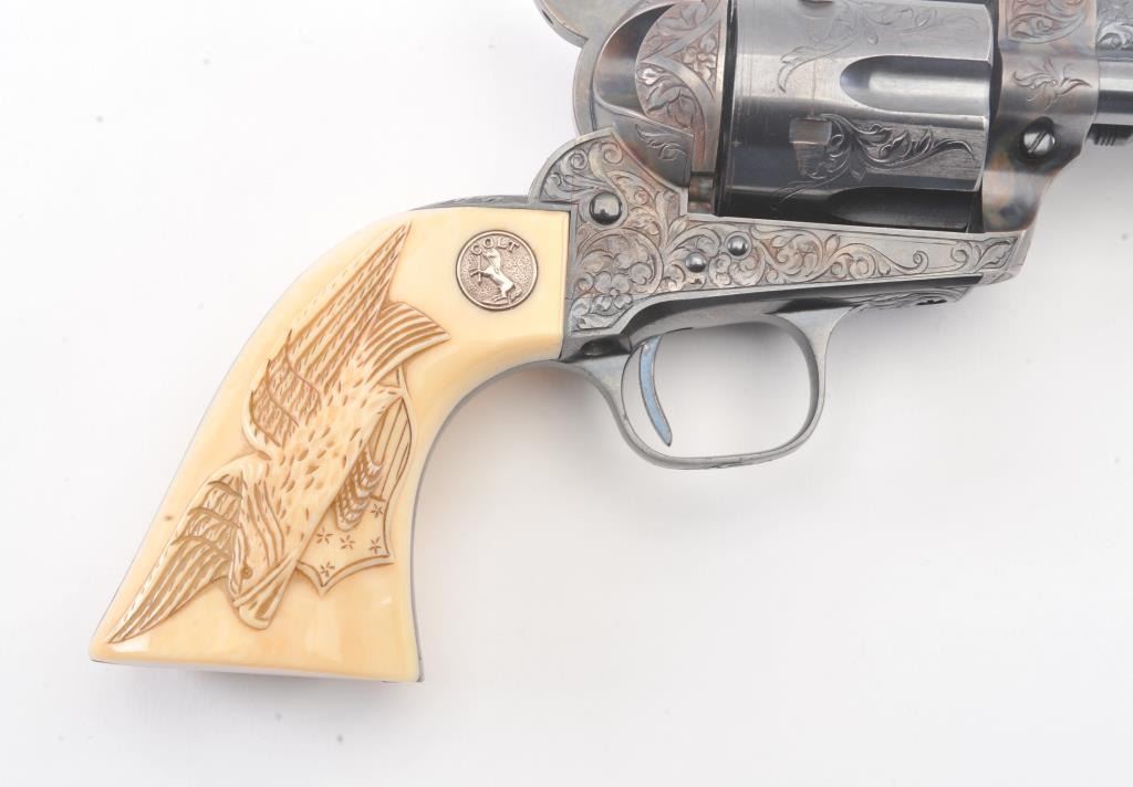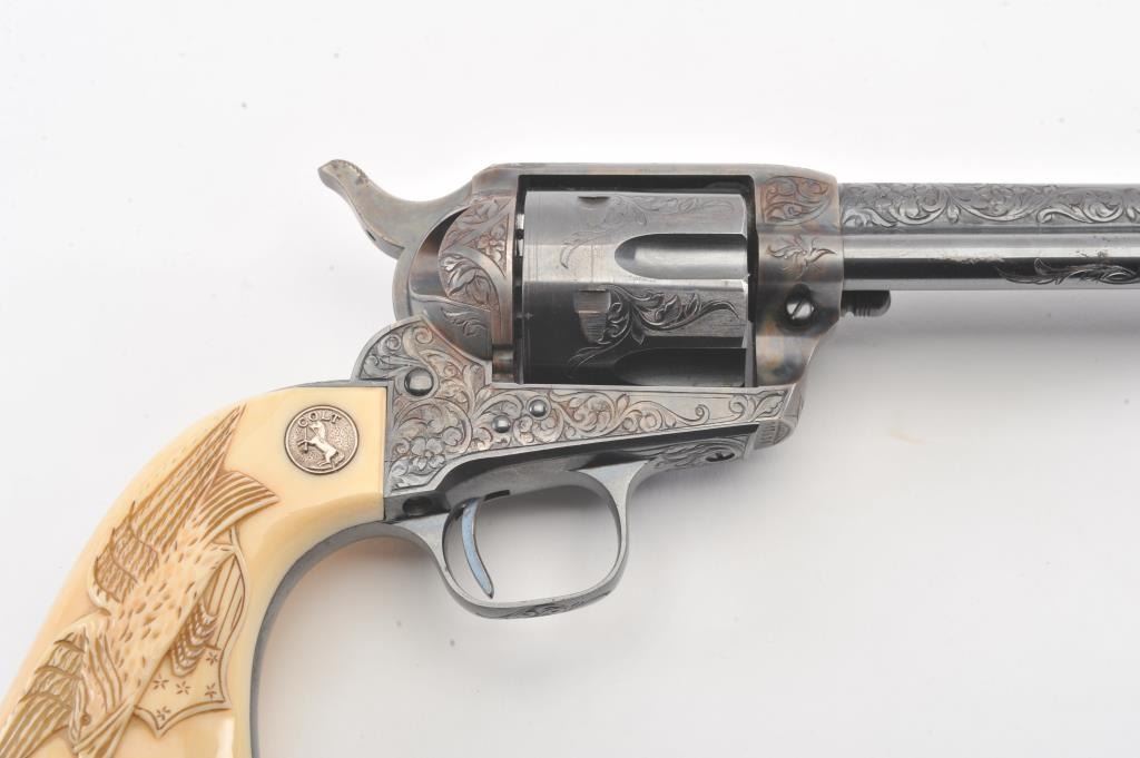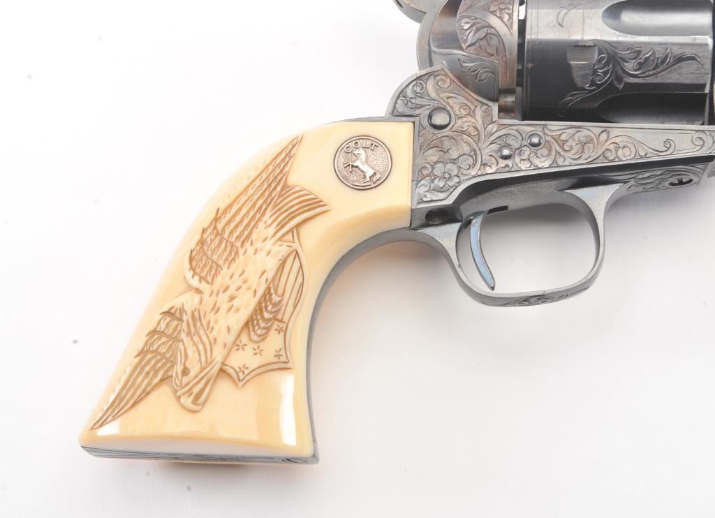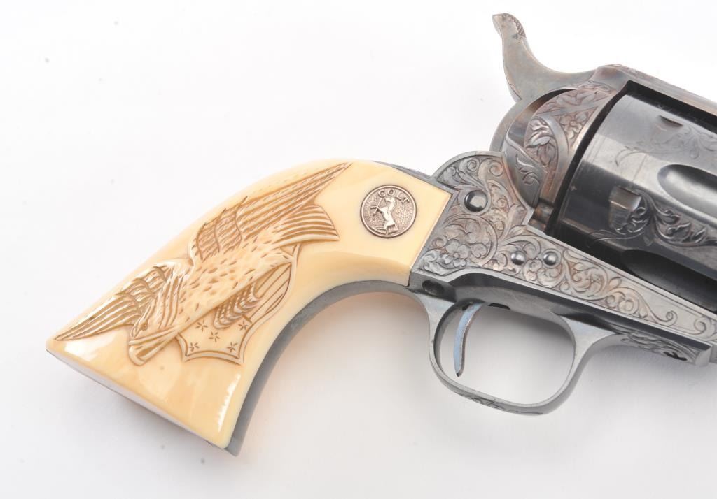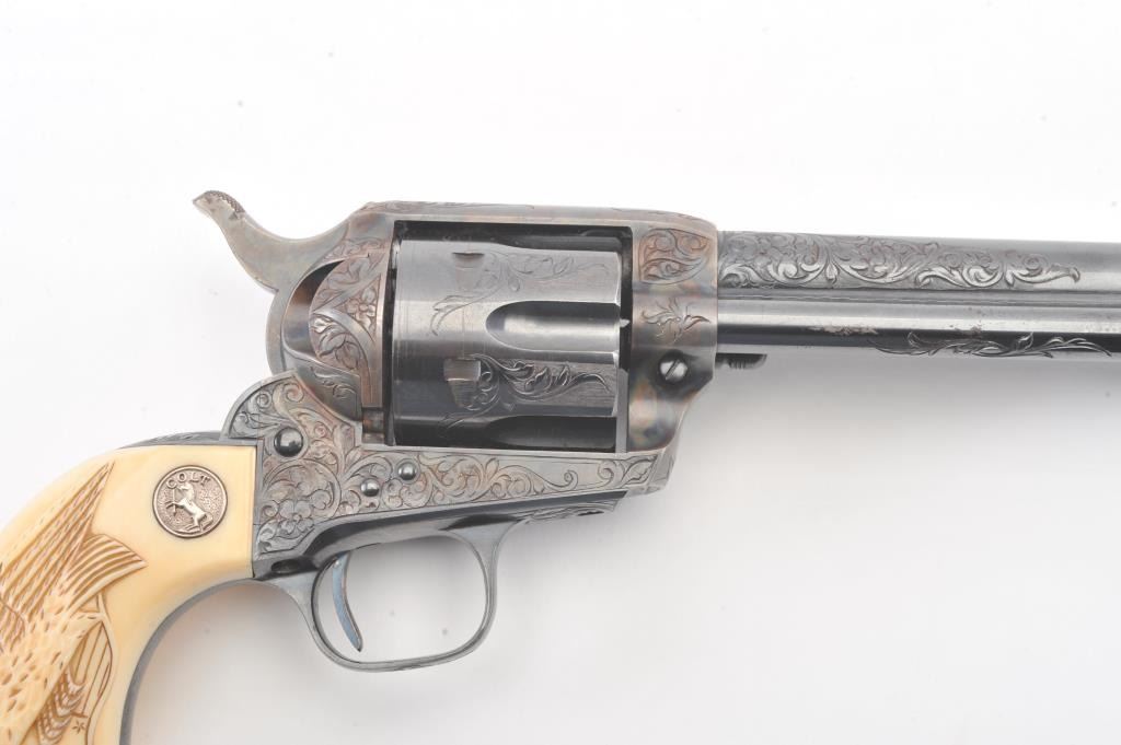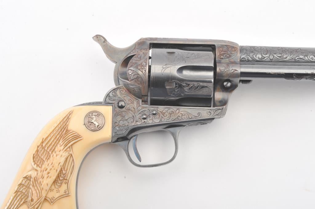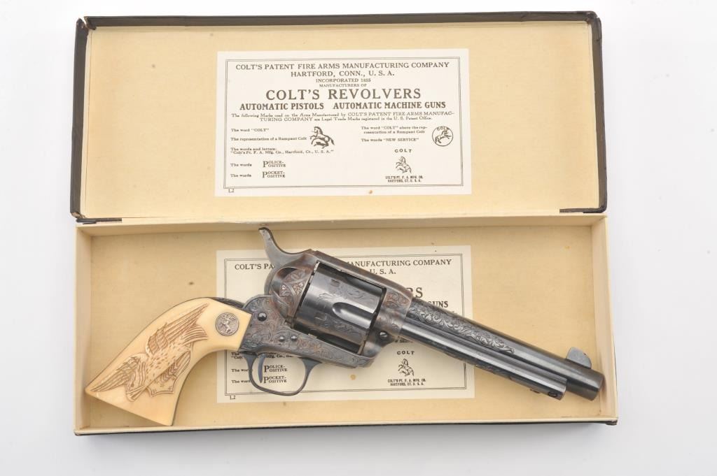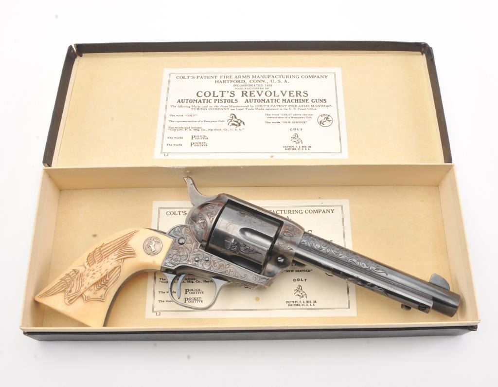 Colt Single Action Army Revolver, .45 Colt caliber, 5 1/2" barrel, factory engraved, blue and cased hardened finish, raised carved ivory grips showing "War Eagle" on shield with medallions, S/N 347534. Shipped to Bob Smith Sporting Goods Co., Boston, Mass. on Jan. 8th, 1925 on order #9294/1 with 1 gun in shipment with factory letter. This stunning Colt remains in near mint condition with 98%-99.9% plus original blue and case hardening with just the slightest of natural aging and excellent grips showing a very light and fine patina. Ultra-sharp and crisp overall. Shows best quality Glahn engraving with trademark "V" on top of the back strap. Included is a Colt box showing correct end labels. The engraving is to the best of Glahn's ability showing higher grade with florals and "Shading" on the cylinder denoting extra fine and fancy factory order. The best factory blue and case hardened Pre-War single action offered on the auction market in the last 5 years in our opinion. Sold by Little John's at auction approximately 15 years ago to noted Colt Collector Association member Pat Boland for $90,000 total and now consigned by his estate. Est:$50,000-100,000 (C& R/PPT)
