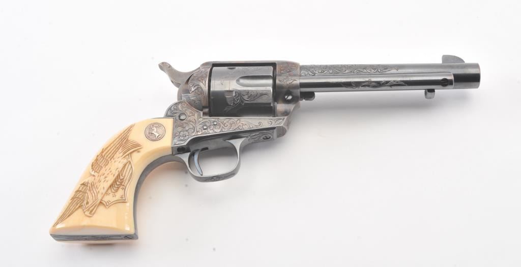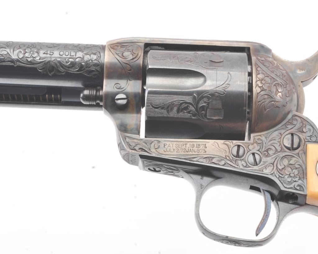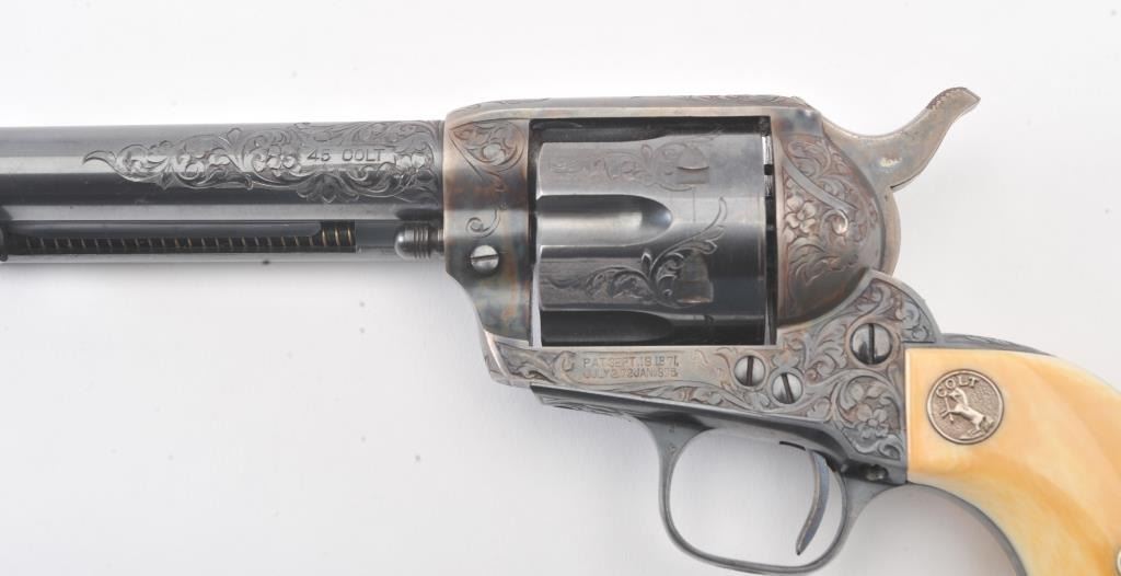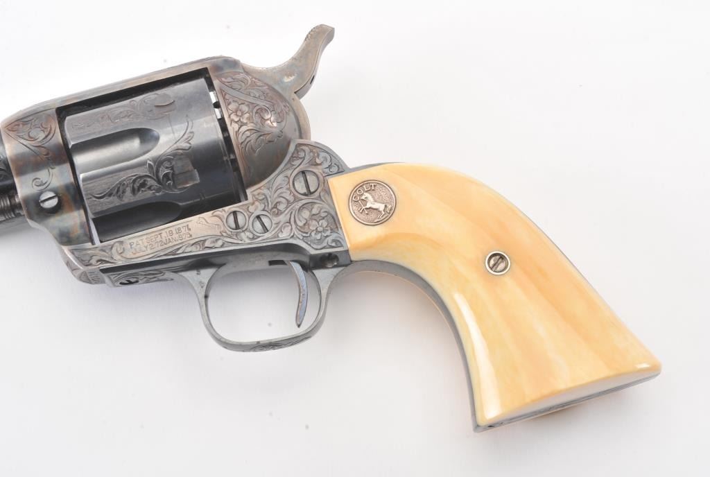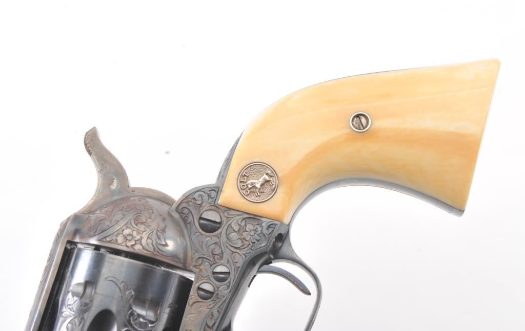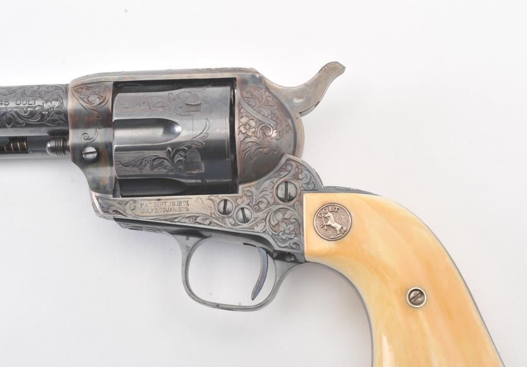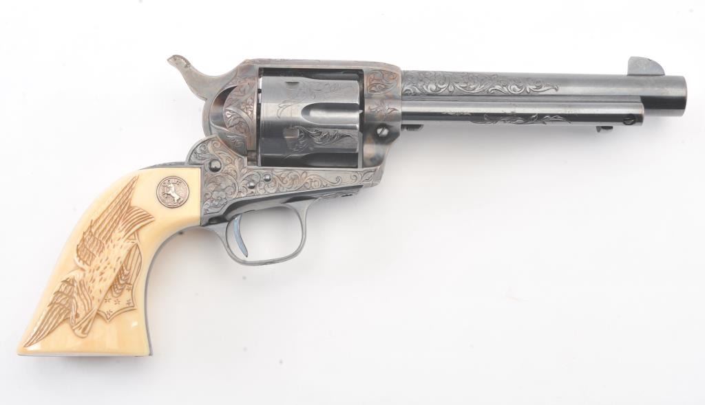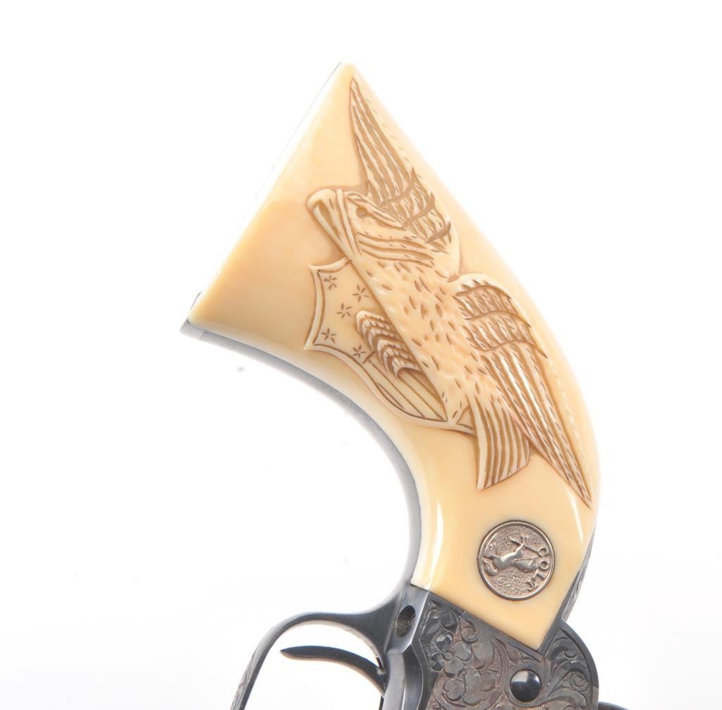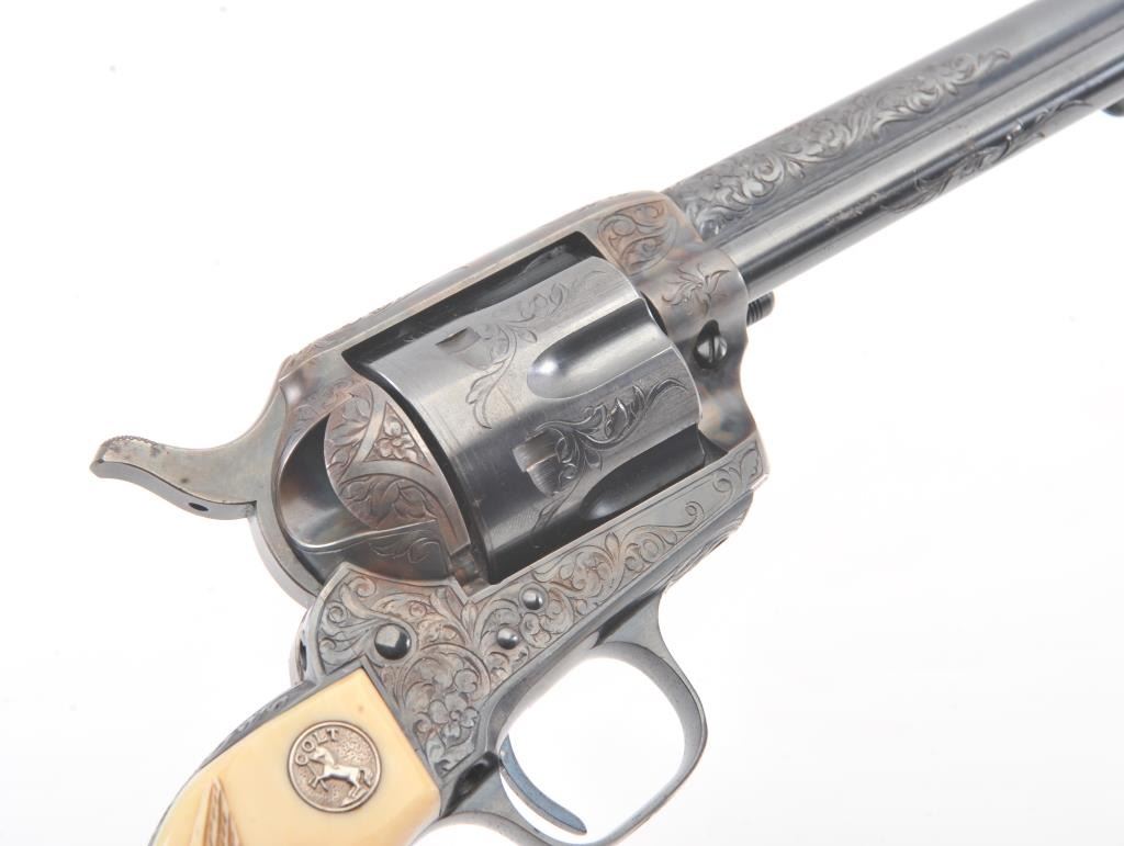 Colt Single Action Army Revolver, .45 Colt caliber, 5 1/2" barrel, factory engraved, blue and cased hardened finish, raised carved ivory grips showing "War Eagle" on shield with medallions, S/N 347534. Shipped to Bob Smith Sporting Goods Co., Boston, Mass. on Jan. 8th, 1925 on order #9294/1 with 1 gun in shipment with factory letter. This stunning Colt remains in near mint condition with 98%-99.9% plus original blue and case hardening with just the slightest of natural aging and excellent grips showing a very light and fine patina. Ultra-sharp and crisp overall. Shows best quality Glahn engraving with trademark "V" on top of the back strap. Included is a Colt box showing correct end labels. The engraving is to the best of Glahn's ability showing higher grade with florals and "Shading" on the cylinder denoting extra fine and fancy factory order. The best factory blue and case hardened Pre-War single action offered on the auction market in the last 5 years in our opinion. Sold by Little John's at auction approximately 15 years ago to noted Colt Collector Association member Pat Boland for $90,000 total and now consigned by his estate. Est:$50,000-100,000 (C& R/PPT)