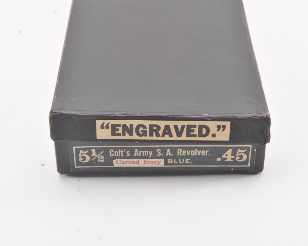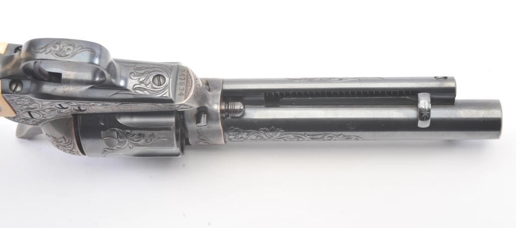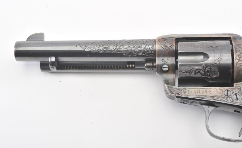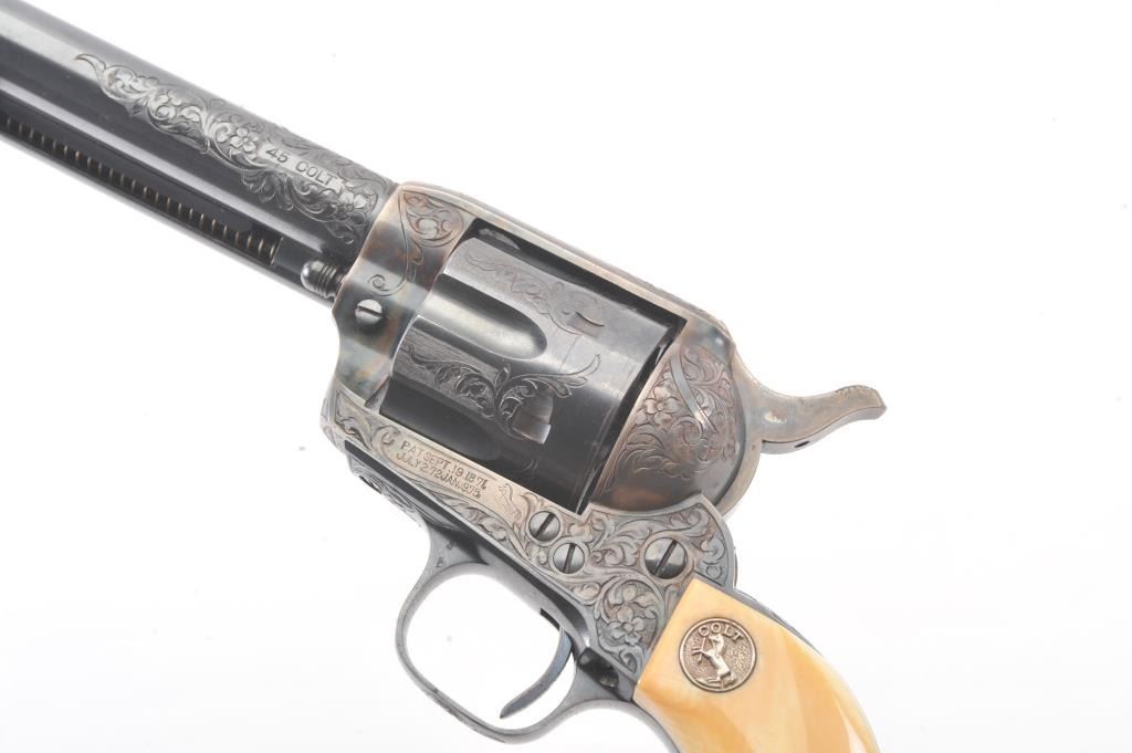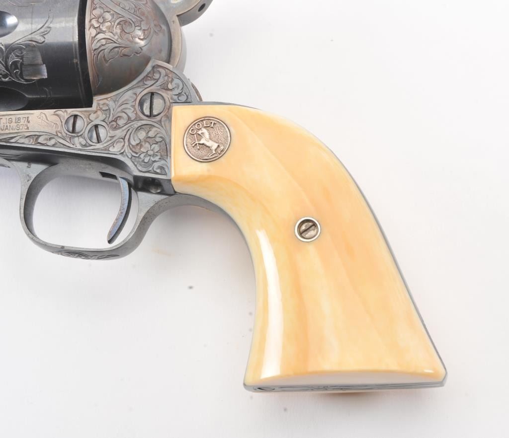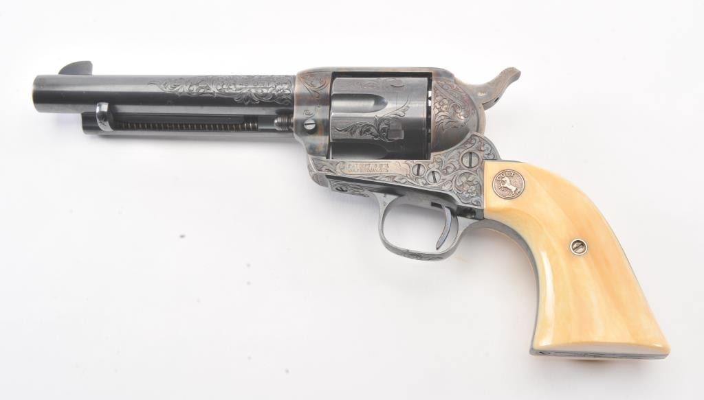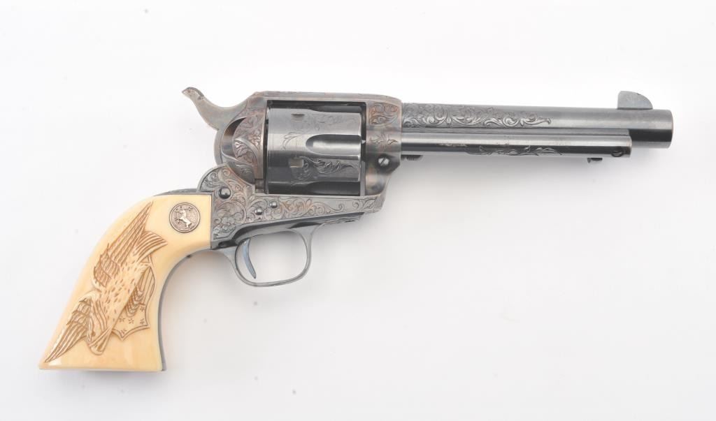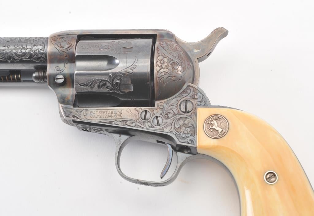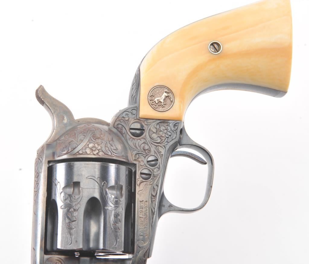 Colt Single Action Army Revolver, .45 Colt caliber, 5 1/2" barrel, factory engraved, blue and cased hardened finish, raised carved ivory grips showing "War Eagle" on shield with medallions, S/N 347534. Shipped to Bob Smith Sporting Goods Co., Boston, Mass. on Jan. 8th, 1925 on order #9294/1 with 1 gun in shipment with factory letter. This stunning Colt remains in near mint condition with 98%-99.9% plus original blue and case hardening with just the slightest of natural aging and excellent grips showing a very light and fine patina. Ultra-sharp and crisp overall. Shows best quality Glahn engraving with trademark "V" on top of the back strap. Included is a Colt box showing correct end labels. The engraving is to the best of Glahn's ability showing higher grade with florals and "Shading" on the cylinder denoting extra fine and fancy factory order. The best factory blue and case hardened Pre-War single action offered on the auction market in the last 5 years in our opinion. Sold by Little John's at auction approximately 15 years ago to noted Colt Collector Association member Pat Boland for $90,000 total and now consigned by his estate. Est:$50,000-100,000 (C& R/PPT)