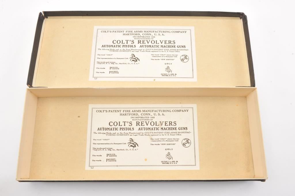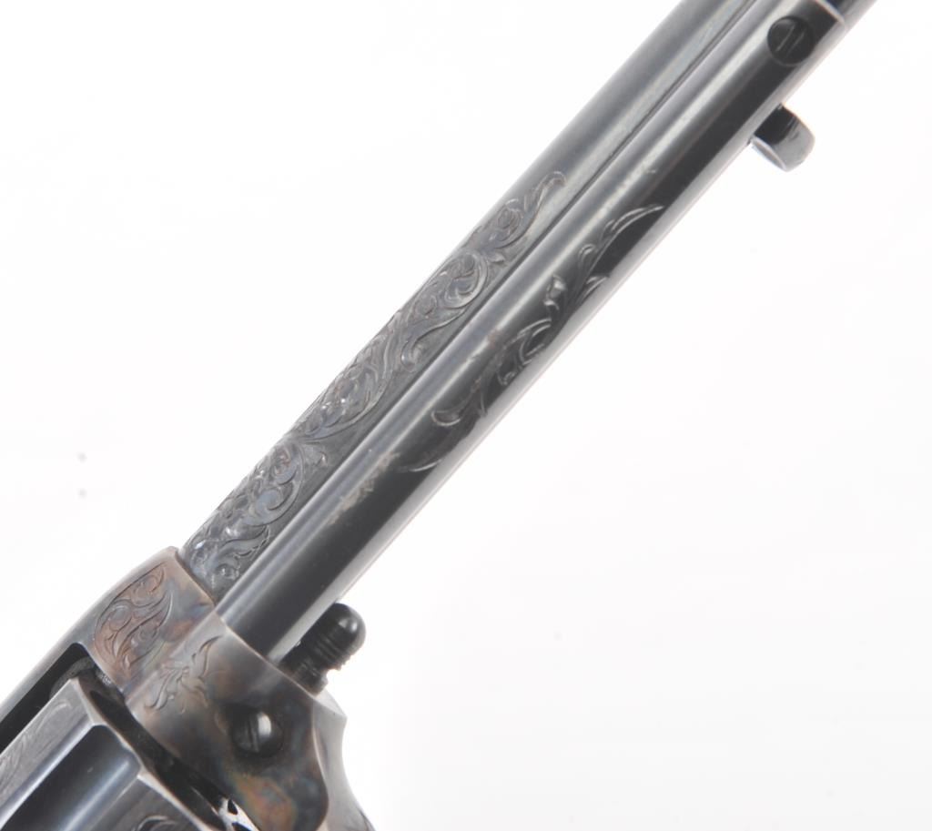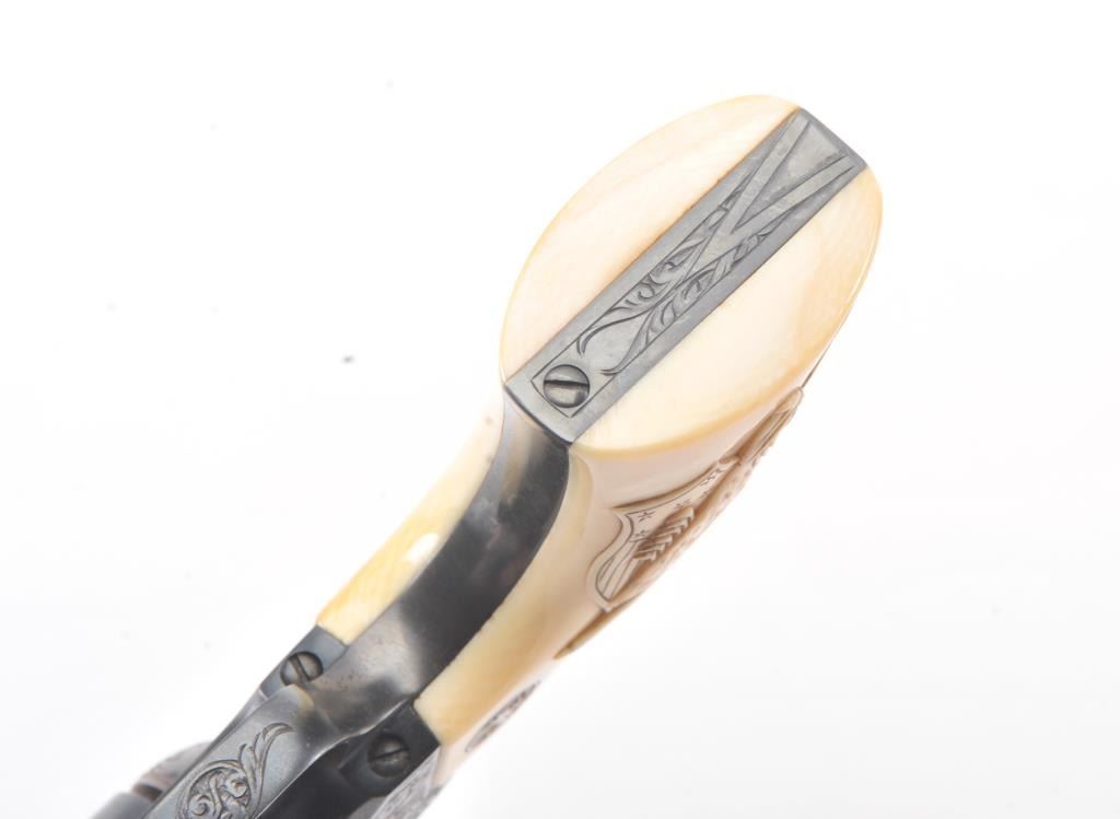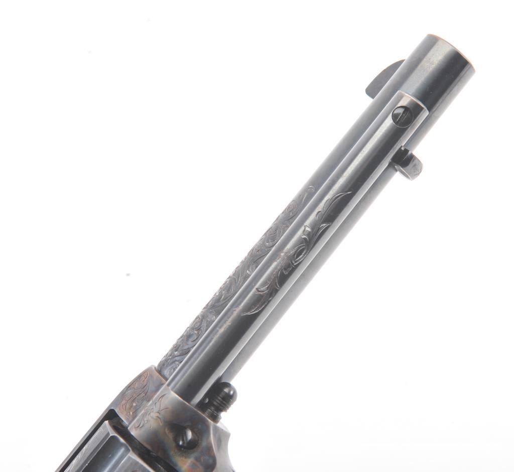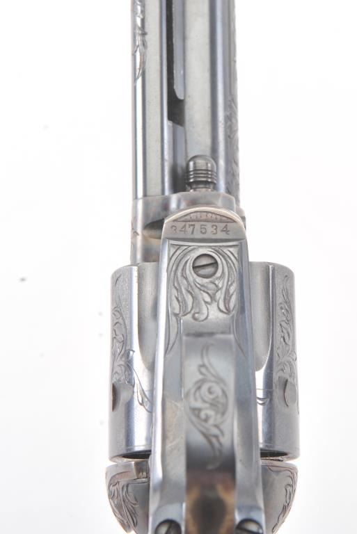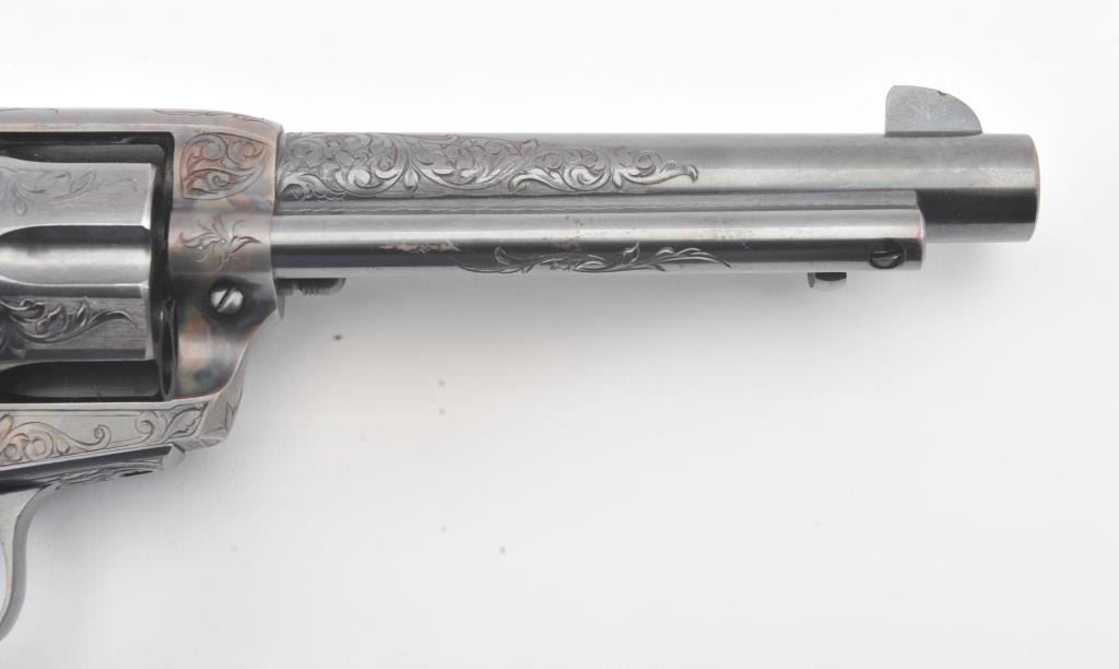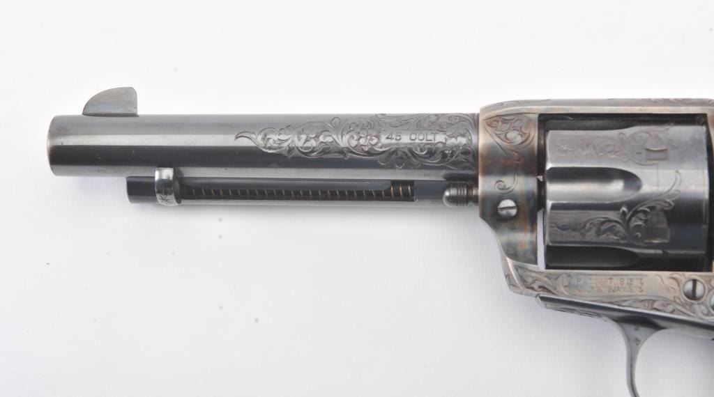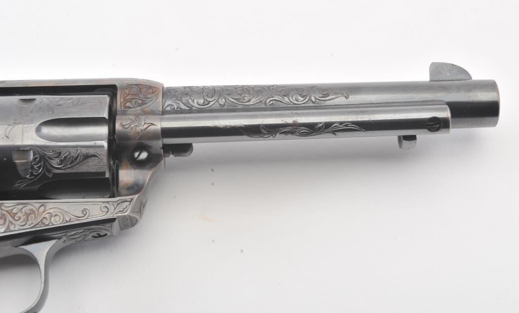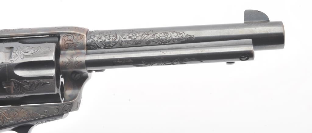 Colt Single Action Army Revolver, .45 Colt caliber, 5 1/2" barrel, factory engraved, blue and cased hardened finish, raised carved ivory grips showing "War Eagle" on shield with medallions, S/N 347534. Shipped to Bob Smith Sporting Goods Co., Boston, Mass. on Jan. 8th, 1925 on order #9294/1 with 1 gun in shipment with factory letter. This stunning Colt remains in near mint condition with 98%-99.9% plus original blue and case hardening with just the slightest of natural aging and excellent grips showing a very light and fine patina. Ultra-sharp and crisp overall. Shows best quality Glahn engraving with trademark "V" on top of the back strap. Included is a Colt box showing correct end labels. The engraving is to the best of Glahn's ability showing higher grade with florals and "Shading" on the cylinder denoting extra fine and fancy factory order. The best factory blue and case hardened Pre-War single action offered on the auction market in the last 5 years in our opinion. Sold by Little John's at auction approximately 15 years ago to noted Colt Collector Association member Pat Boland for $90,000 total and now consigned by his estate. Est:$50,000-100,000 (C& R/PPT)