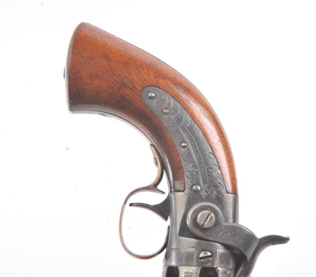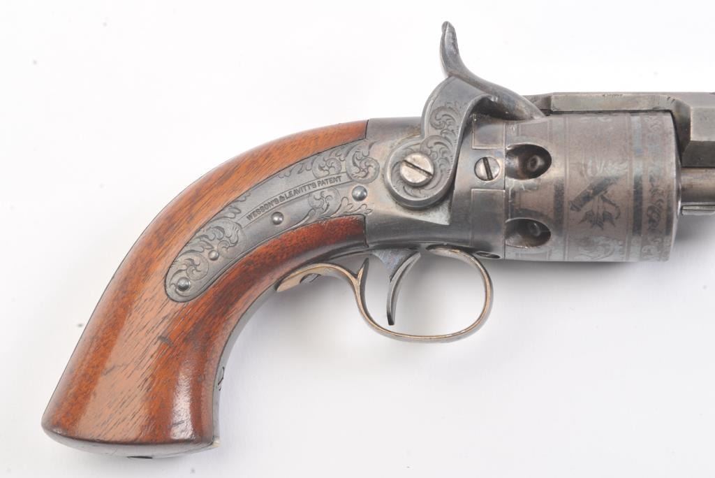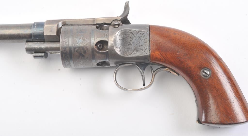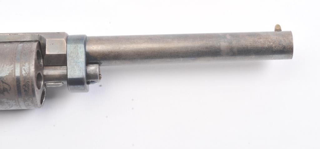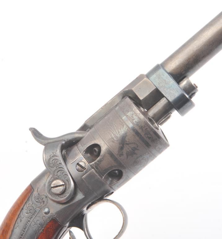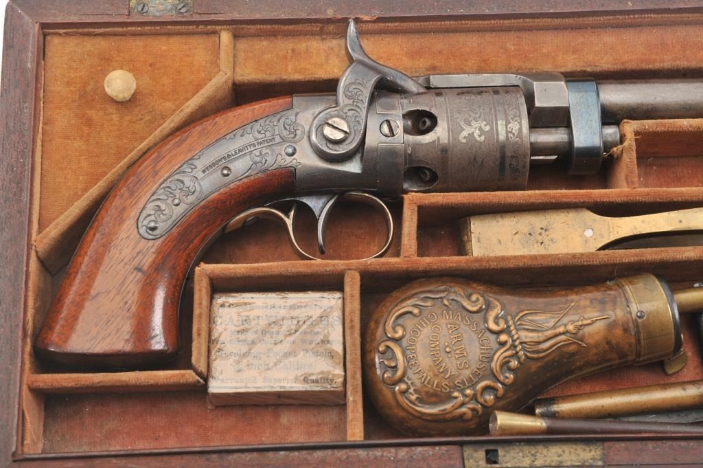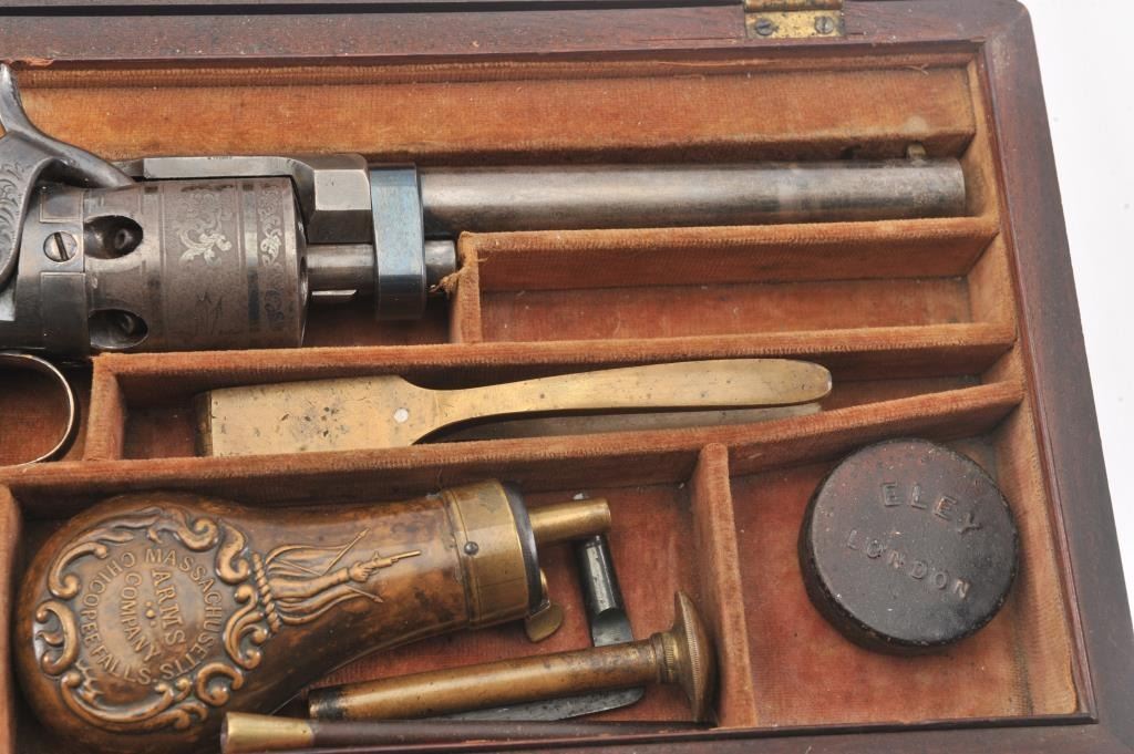 Mass. Arms Wesson and Levitt patent Pre-Civil War era percussion .31 caliber revolver cased with full accessories, #456. 1 of approximately 1000 total produced. This revolver has desirable etched cylinder and 5" barrel. The pistol remains in very good plus to near fine condition with 50%-70% original finishes and all of the original etching on the cylinder. The stocks are almost fine with 90% plus varnish. The revolver is crisp andthe finish has just drifted as it shows almost no firing or use. The partition lined case is faded but very good condition with correct marked mold, marked flask, nipple wrench, mushroom loader, cap tin andcartridge pack of unusual small size that fits this case! The exterior of the case is very good plus. An unusual and nice set. From the well-recognized Gary Wiemann estate collection. (Antique) Est.: $3000-$6000