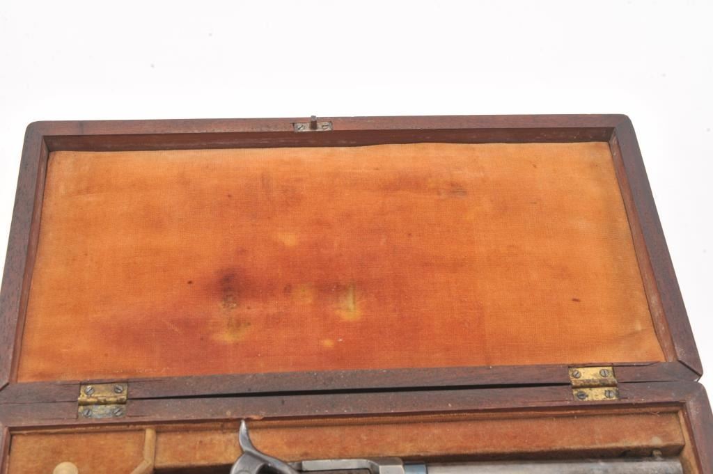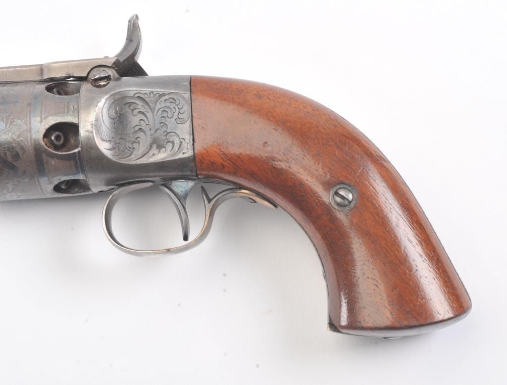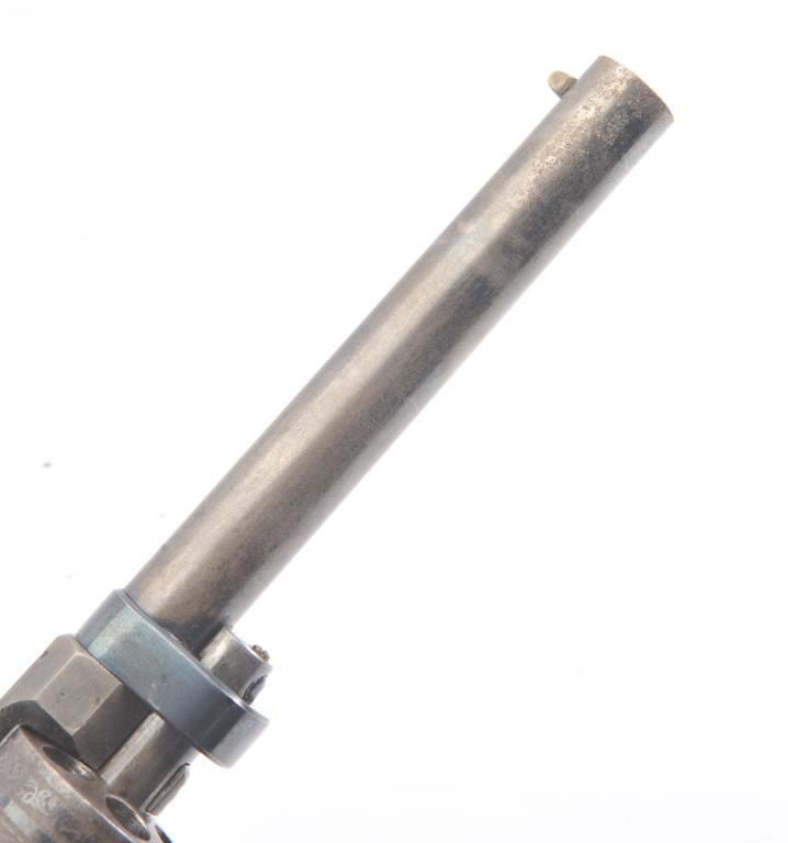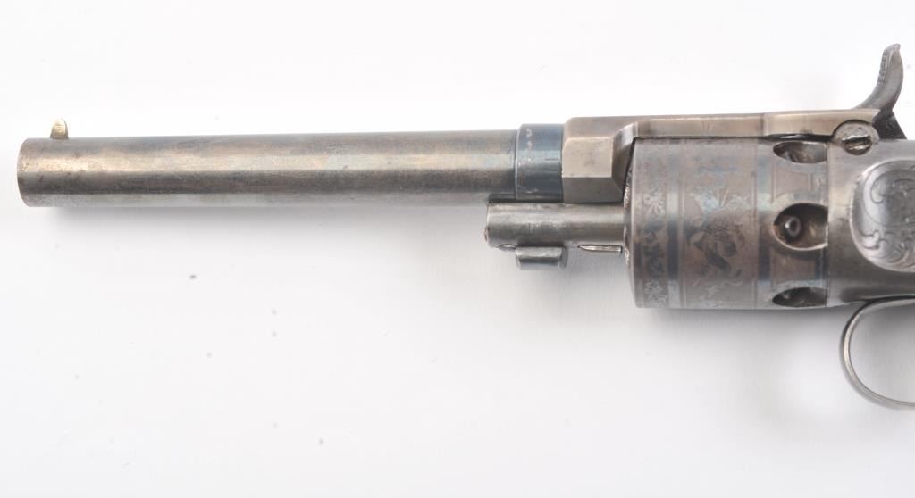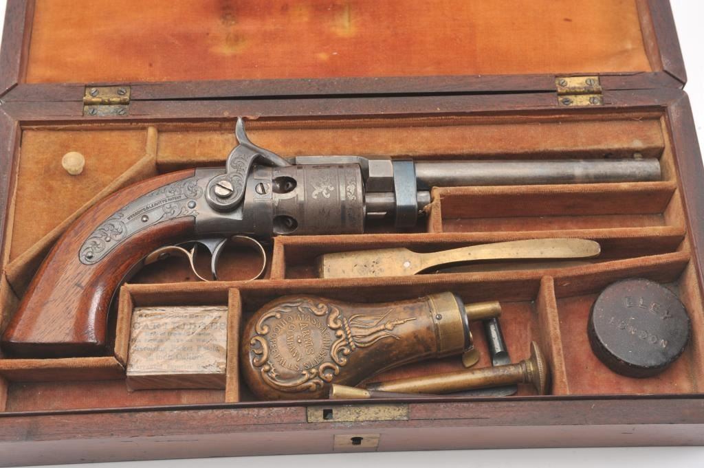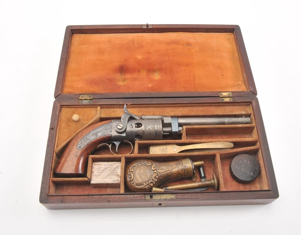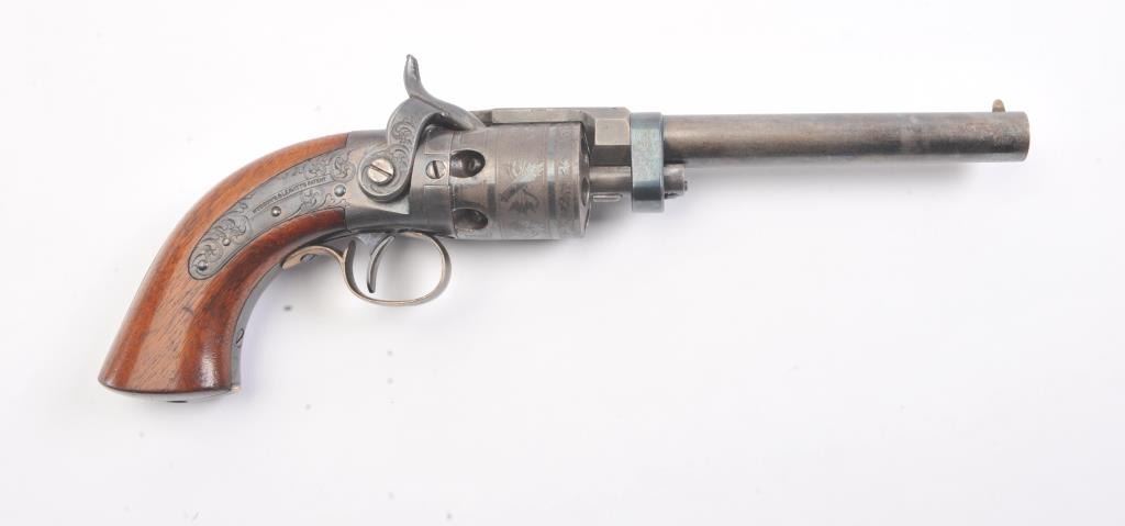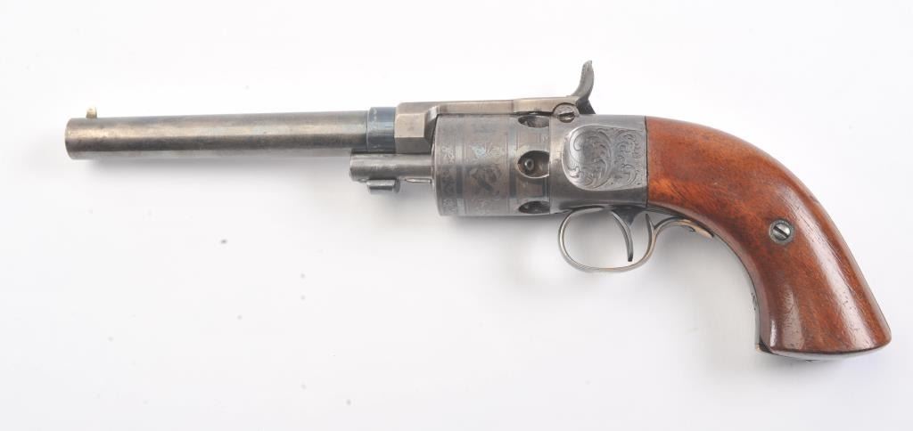 Mass. Arms Wesson and Levitt patent Pre-Civil War era percussion .31 caliber revolver cased with full accessories, #456. 1 of approximately 1000 total produced. This revolver has desirable etched cylinder and 5" barrel. The pistol remains in very good plus to near fine condition with 50%-70% original finishes and all of the original etching on the cylinder. The stocks are almost fine with 90% plus varnish. The revolver is crisp andthe finish has just drifted as it shows almost no firing or use. The partition lined case is faded but very good condition with correct marked mold, marked flask, nipple wrench, mushroom loader, cap tin andcartridge pack of unusual small size that fits this case! The exterior of the case is very good plus. An unusual and nice set. From the well-recognized Gary Wiemann estate collection. (Antique) Est.: $3000-$6000
