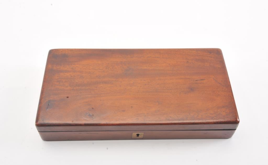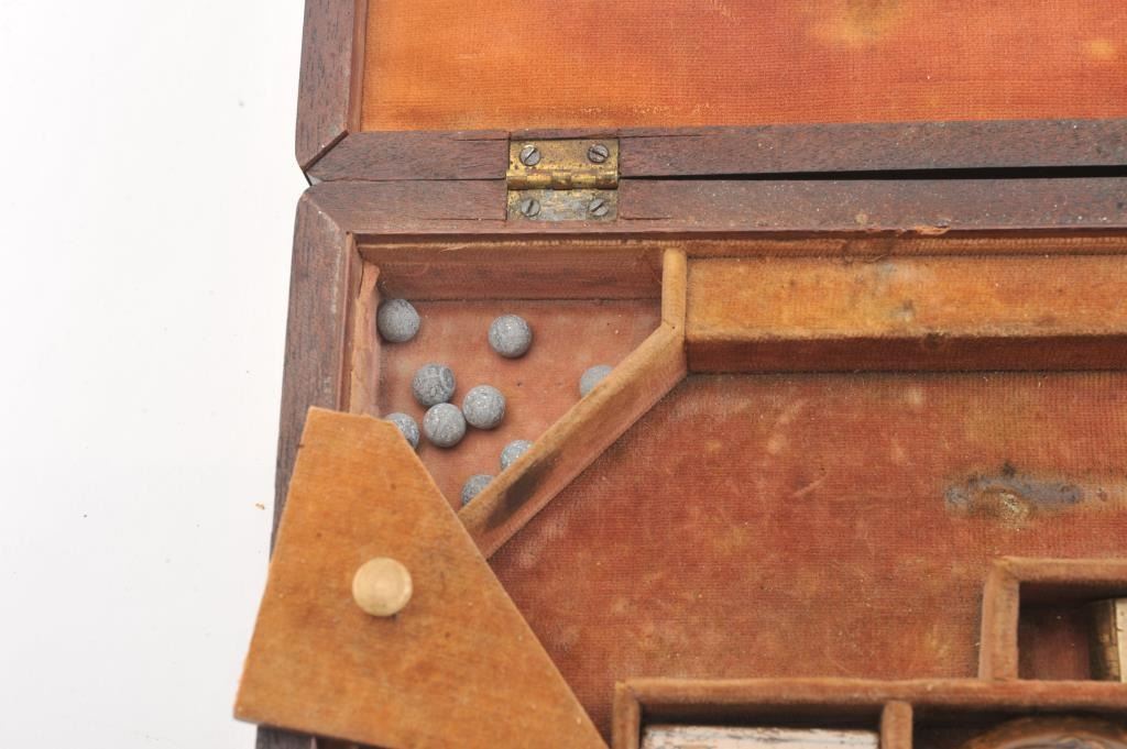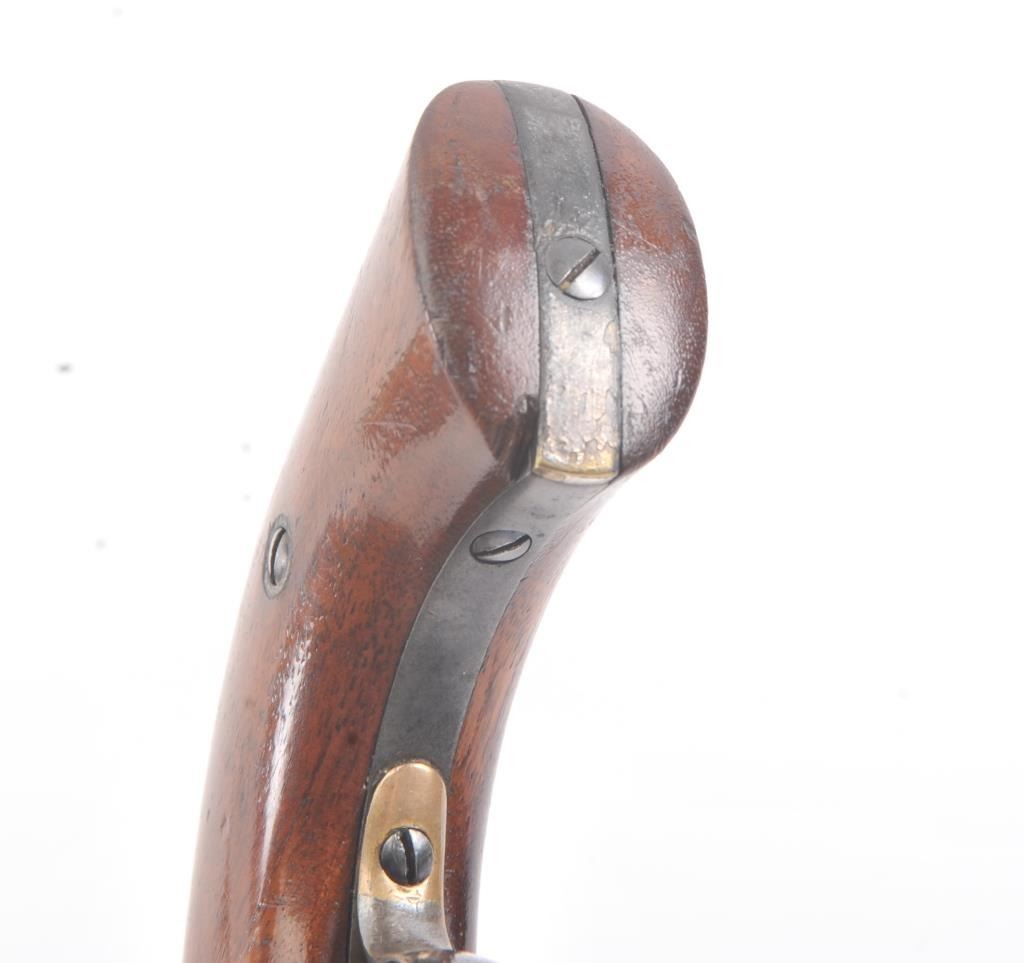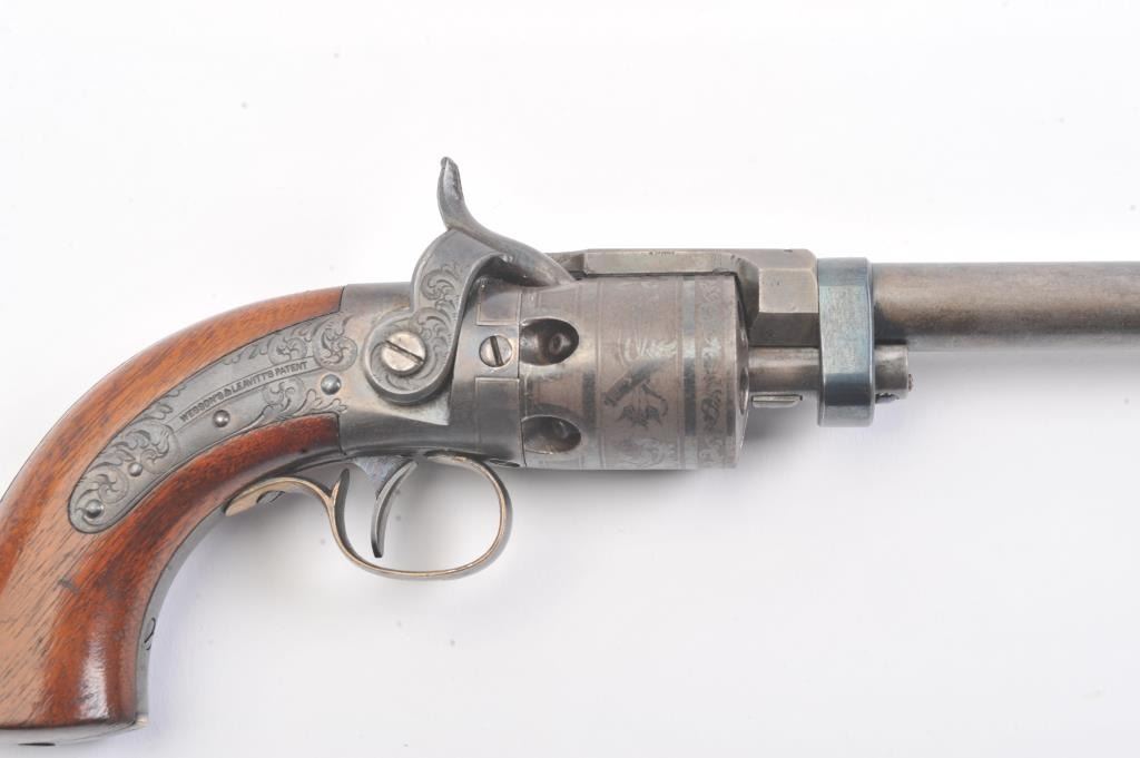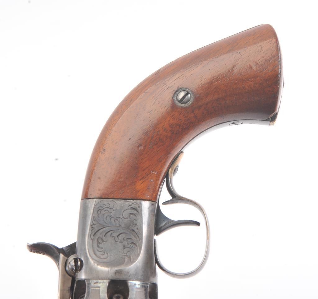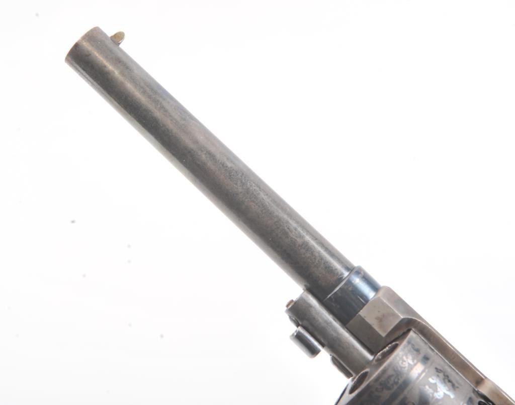 Mass. Arms Wesson and Levitt patent Pre-Civil War era percussion .31 caliber revolver cased with full accessories, #456. 1 of approximately 1000 total produced. This revolver has desirable etched cylinder and 5" barrel. The pistol remains in very good plus to near fine condition with 50%-70% original finishes and all of the original etching on the cylinder. The stocks are almost fine with 90% plus varnish. The revolver is crisp andthe finish has just drifted as it shows almost no firing or use. The partition lined case is faded but very good condition with correct marked mold, marked flask, nipple wrench, mushroom loader, cap tin andcartridge pack of unusual small size that fits this case! The exterior of the case is very good plus. An unusual and nice set. From the well-recognized Gary Wiemann estate collection. (Antique) Est.: $3000-$6000