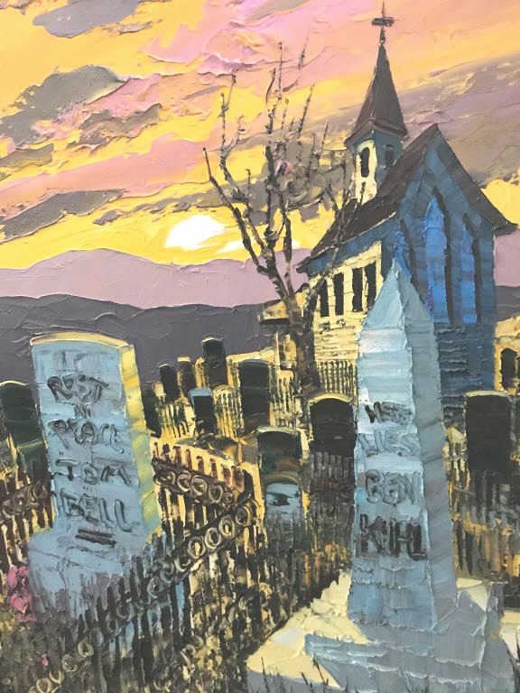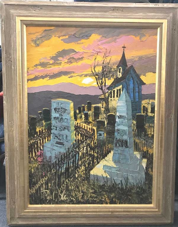 Original oil on canvas by Paul Blaine Henrie, entitled "Tom Belle & Ben Kuhl Gravesite" , one of a series done for the book entitled "Legendary Outlaws of The West" by Brad Williams (refer Lot 1288). The imagemeasures 42" high x 30" wide, all in the series are framed to match Est.: $500-1000