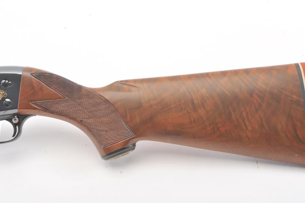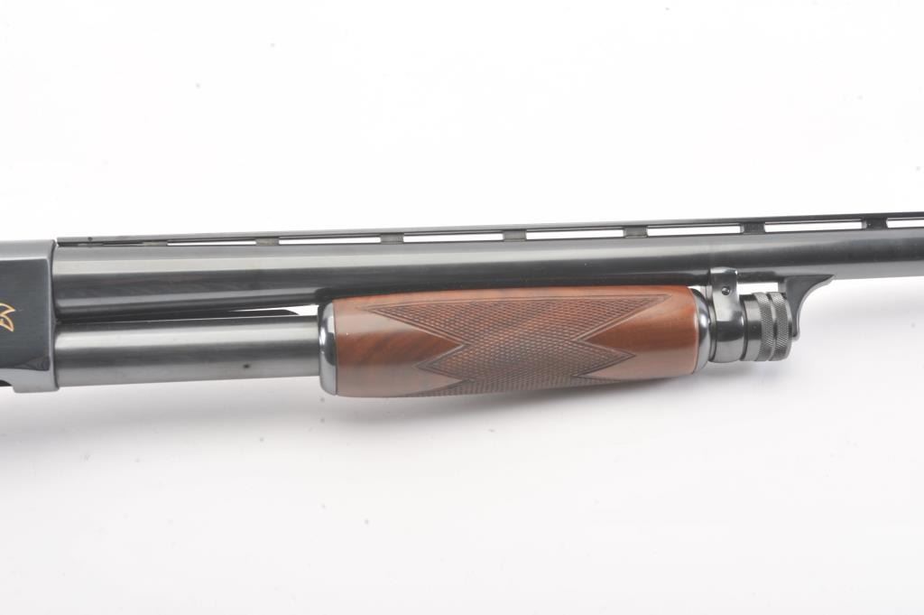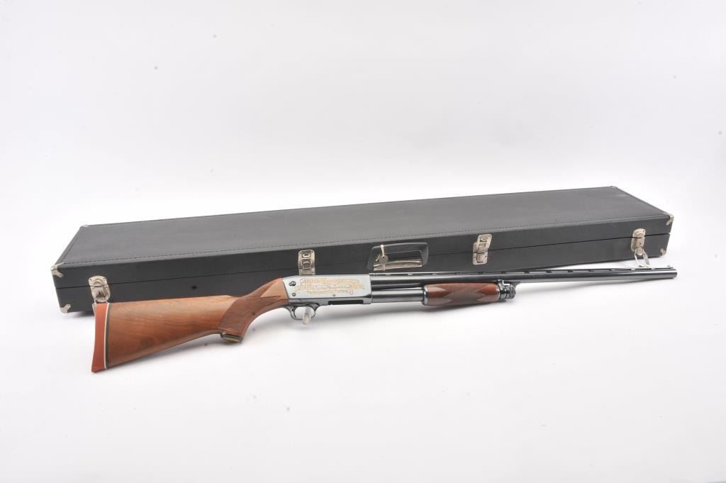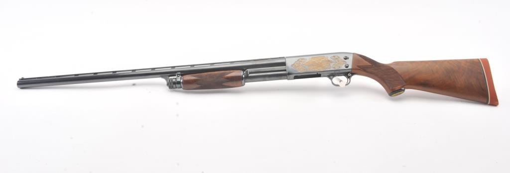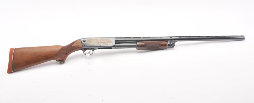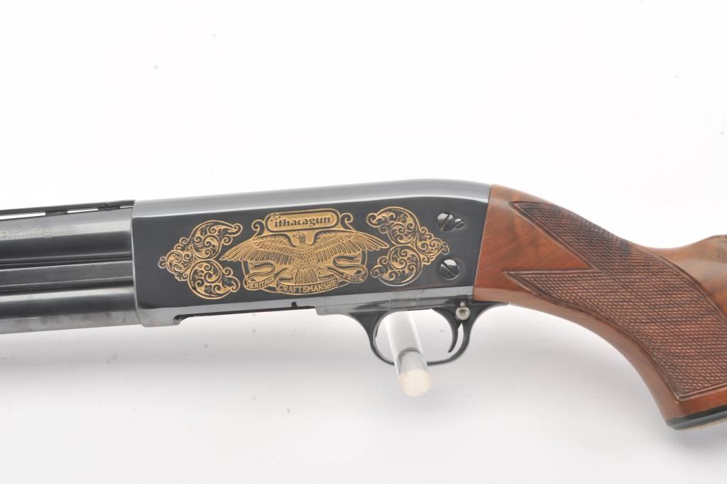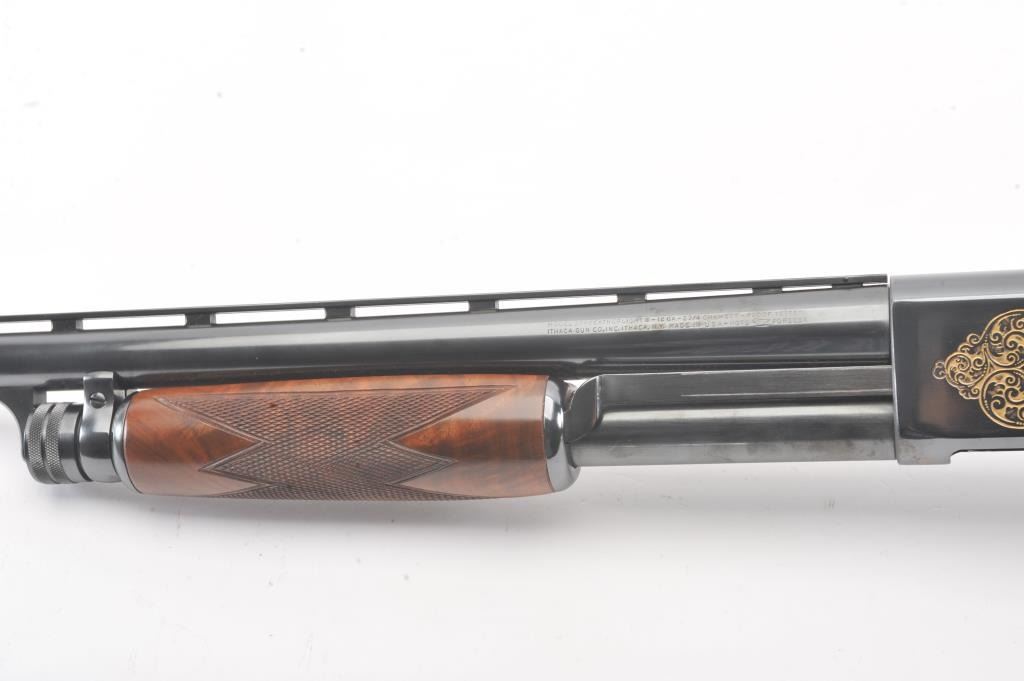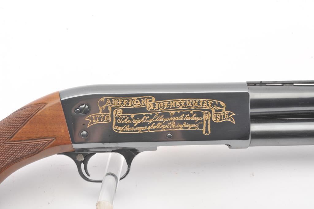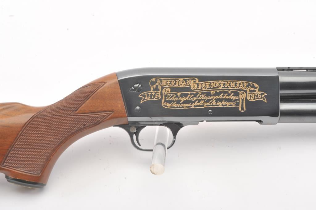 Ithaca Model 37 American Bicentennial, #USA1895, 12 Ga., 28" vent rib barrel, blued finish, receiver engraved "American Bicentennial 1776-1976. 'The right of the people to keep and bear arms shall not beinfringed." on the right side, and "Ithaca Gun Heritage Craftsmanship Pride" with scrolls on the left side of the receiver, with gold accenting the engraving. The shotgun is in near excellent conditionoverall, retaining 97-98% original blue finish, wood is near excellent with minimal finish checking in the forend, checkering is crisp. Length of pull is 13 7/8" to the end of the pad, 12 7/8" to the end of the wood.Includes an Ithaca felt lined hard case. (Modern) Est. $600-1200