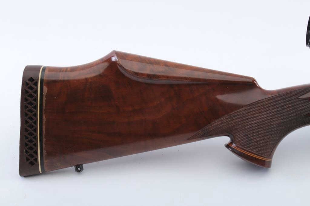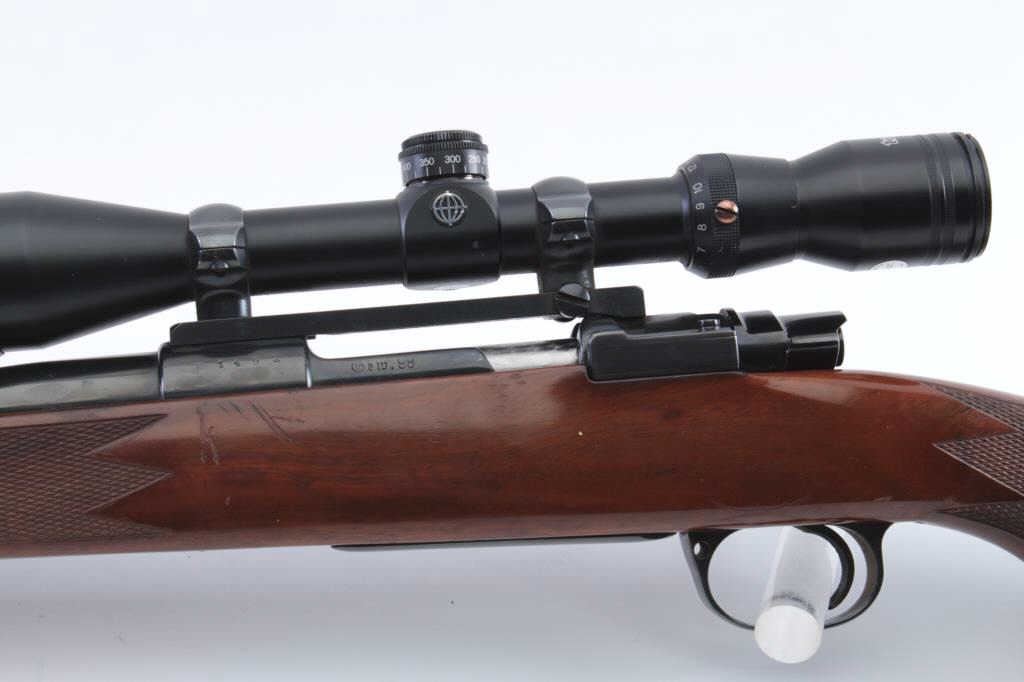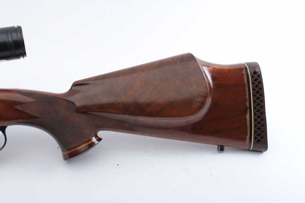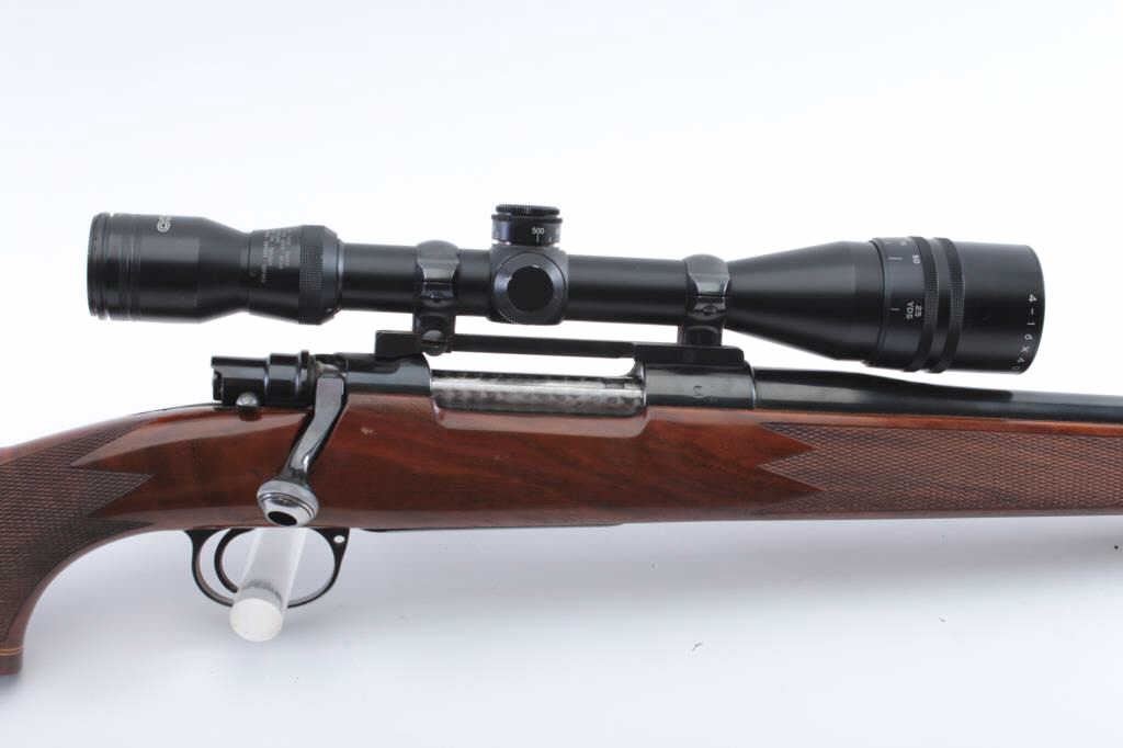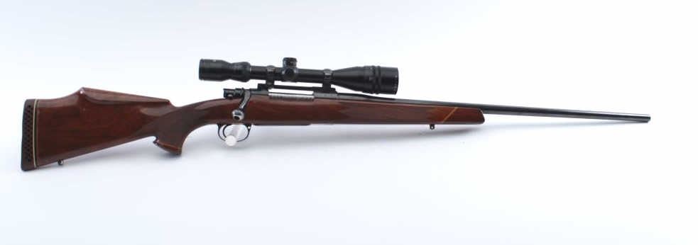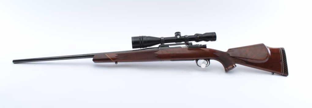 Custom Mauser bolt action rifle, .270 caliber, Serial #1492. The rifle is in fine overall condition with a 25” barrel. The rifle was built by Matthews Gun Shop of Downey, California in the 1950’s-60’s. Therifle is built on a WWI vintage German GEW 98 action with proofs on the front ring and an engine turned bolt. The custom wood stock is in very good condition with a Rosewood fore end cap, exaggerated pistol grip and highcomb cheek piece. The butt stock ends with a ventilated rubber pad providing a 13 ¾” LOP. The rifle is topped with a Tasco 4 x 16 x 40 variable power scope with an adjustable objective. The bore is good, the action iscrisp and the markings are sharp on this custom sporting rifle. Est.: $300-$600. (C+R).