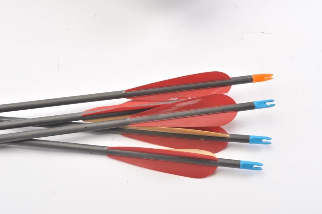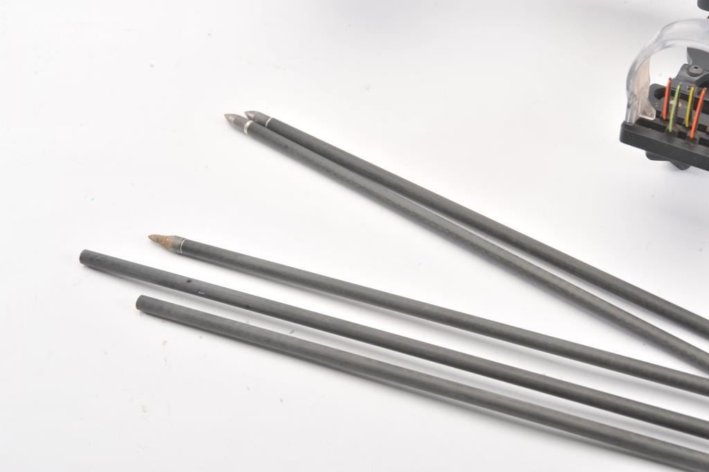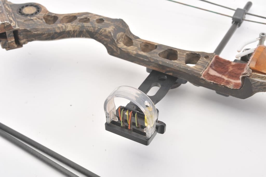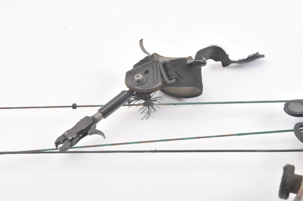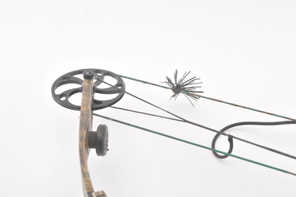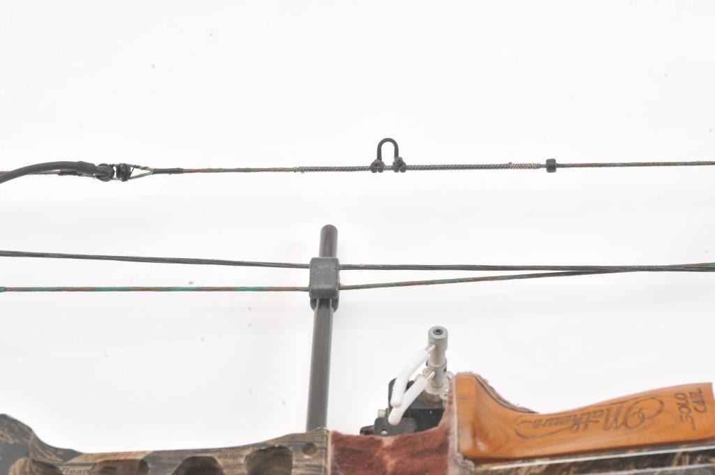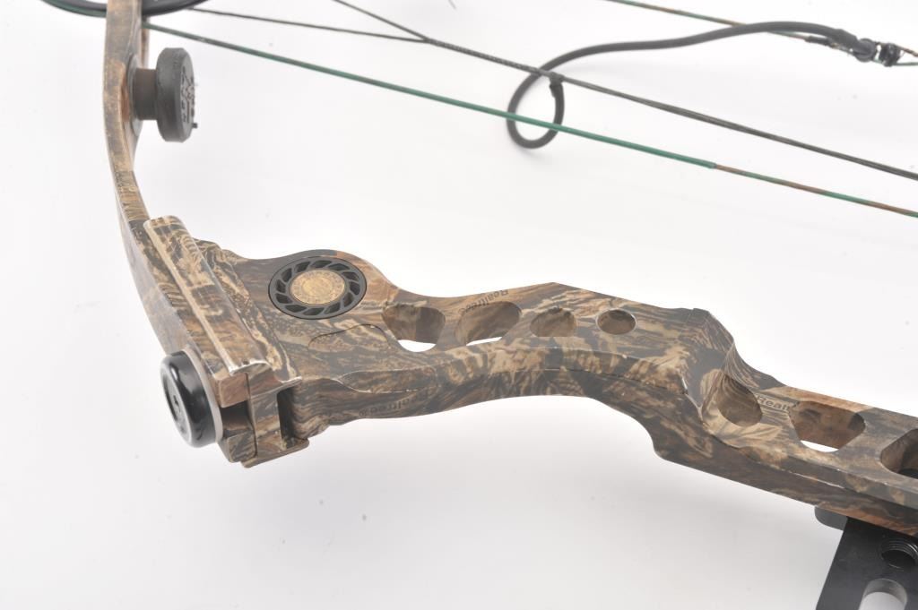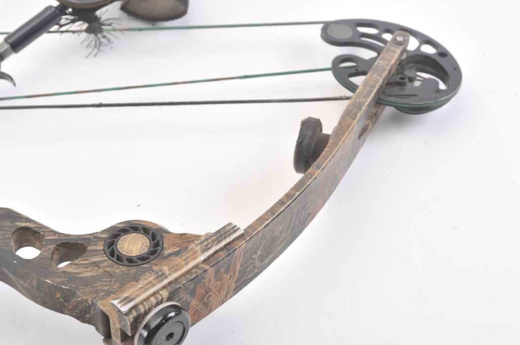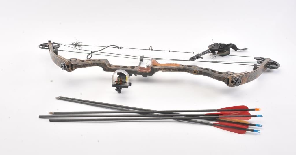 Mathews Solo Cam compound bow with seven arrows and plastic hard case. The Real tree finished bow is in good overall condition with seven arrows and carrying case. Est.: $150-$300.