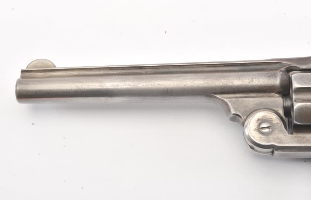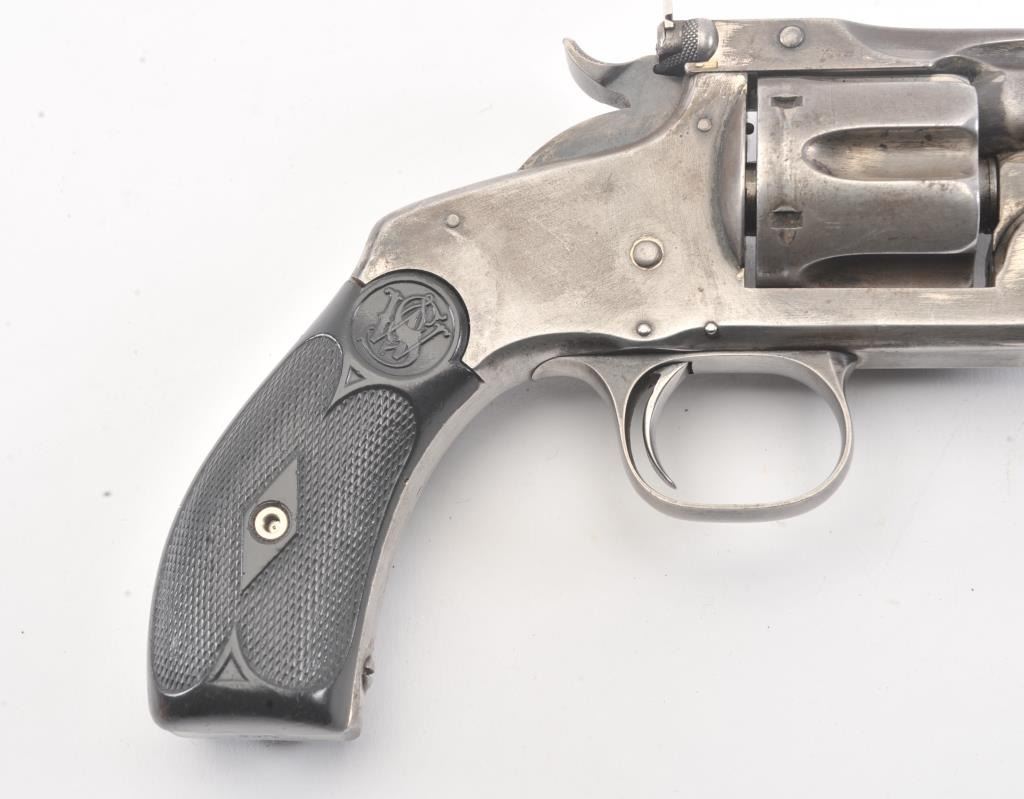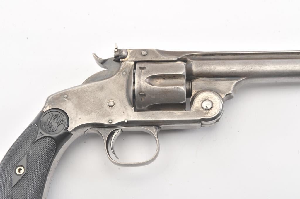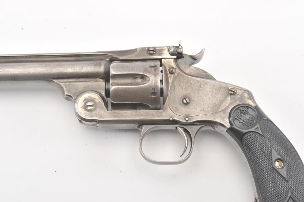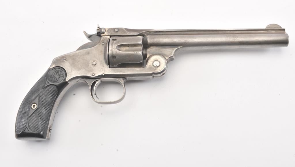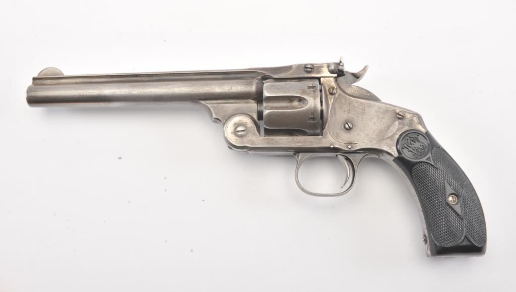 Smith & Wesson New Model 3, #608, .44 Russian cal., 6 1/2" barrel, blued finish, with replacement checkered logo grips. The pistol is in good to very good condition overall, traces of the original finish remain in theprotected areas, the metal surfaces have been cleaned. The bore is very good with very light erosion, the action is good. (Antique) Est. $1000-2000