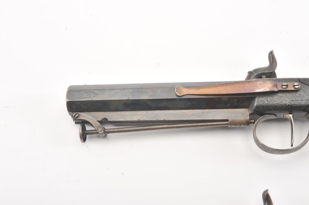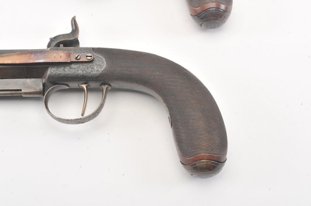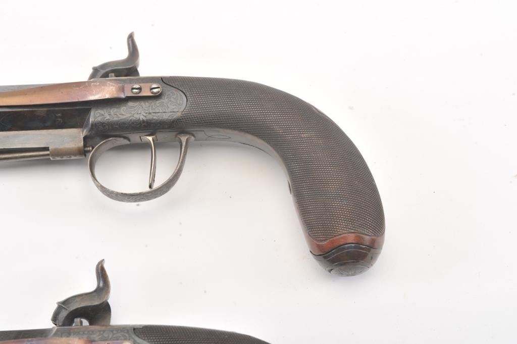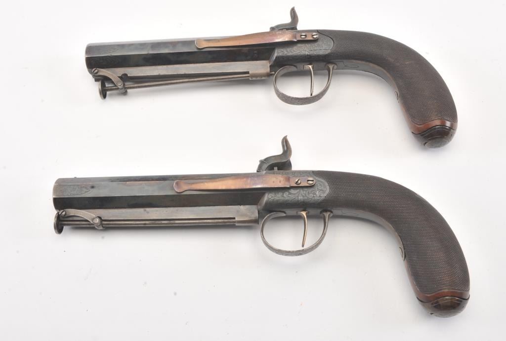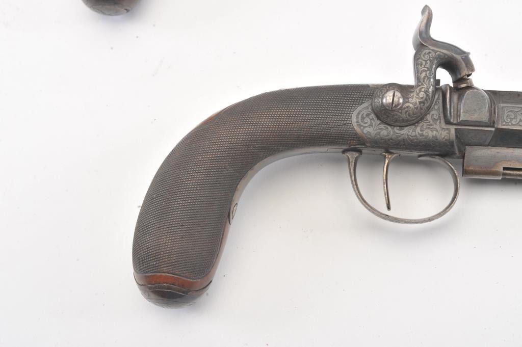 Unusual and fine pair of percussion belt pistols made in English style but French or Belgian origin showing no proofs or markings. Measures 11" overall with a 5 5/8" heavy octagon barrels of .70 caliber smoothbore.Nicely engraved with etching on the barrels and full case colored finish. 75%-85% plus colorful case hardening just dulling and aging slightly. The actions are crisp and the pair show very little use or aging. Thestocks are finely checkered and very good plus except 1 has a large chip and missing wood behind the lock. Our sense is that this pair are French made for a British client. Circa about 1850-60. (Antique) Est.:$1500-$3000