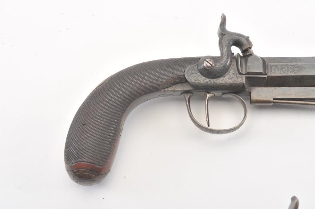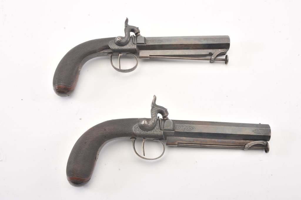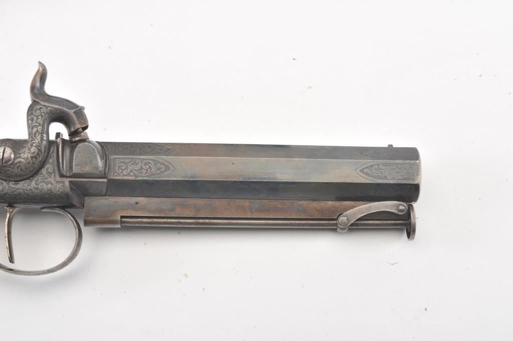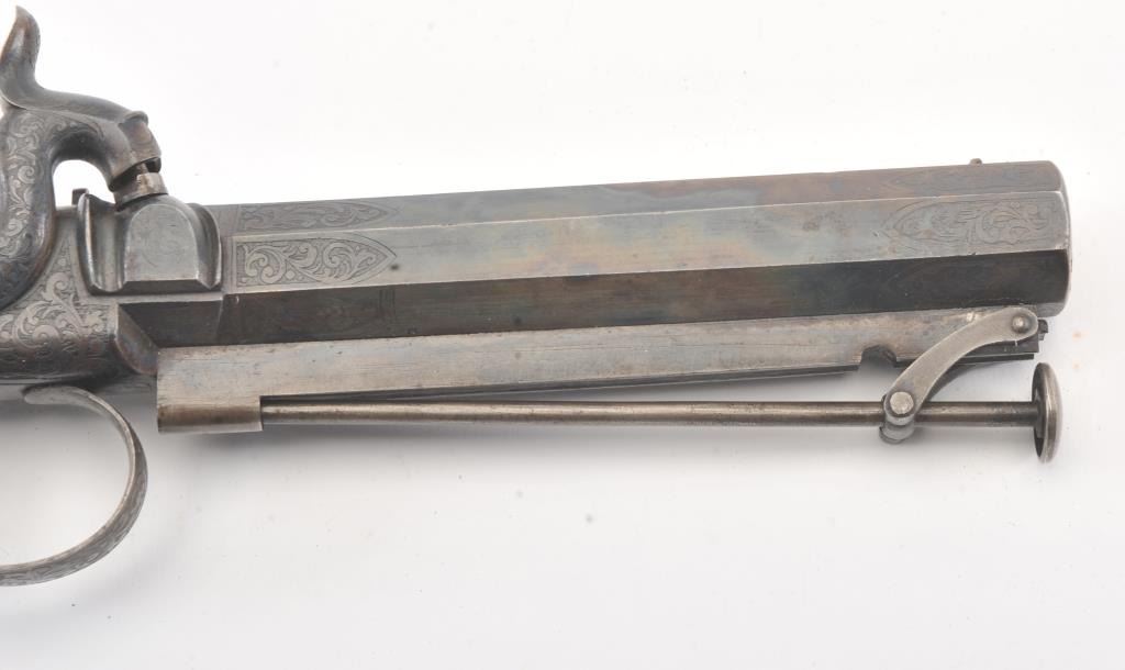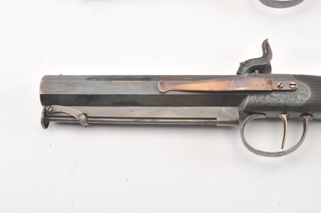 Unusual and fine pair of percussion belt pistols made in English style but French or Belgian origin showing no proofs or markings. Measures 11" overall with a 5 5/8" heavy octagon barrels of .70 caliber smoothbore.Nicely engraved with etching on the barrels and full case colored finish. 75%-85% plus colorful case hardening just dulling and aging slightly. The actions are crisp and the pair show very little use or aging. Thestocks are finely checkered and very good plus except 1 has a large chip and missing wood behind the lock. Our sense is that this pair are French made for a British client. Circa about 1850-60. (Antique) Est.:$1500-$3000