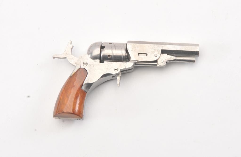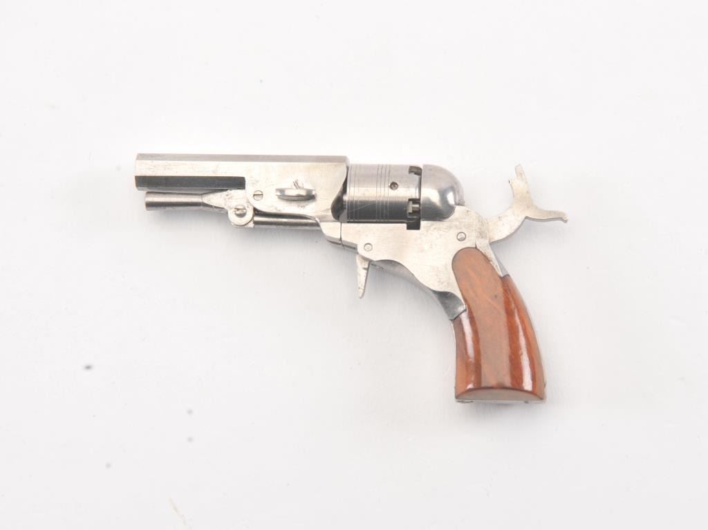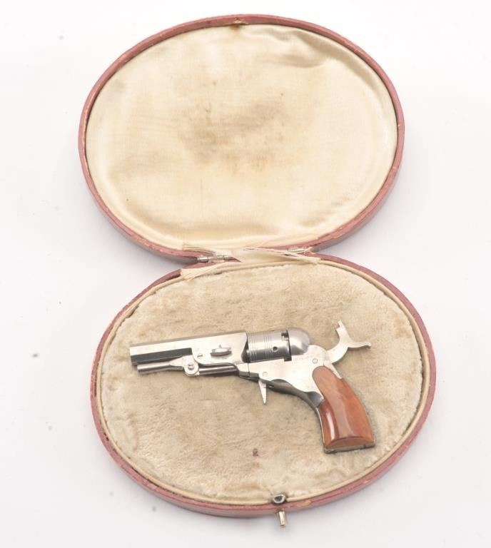 Handmade miniature "Ehlers" style pocket Paterson revolver in 19th century style display case. Measures 3" overall. Bright finish. A working miniature whose action broke recently. Bright finish. Attributed toEmil Ripoli circa 1970s-80s who was a master maker and Colt collector from North West coast and displayed at Portland gun shows. A gem. Est.: $1000-$2000
