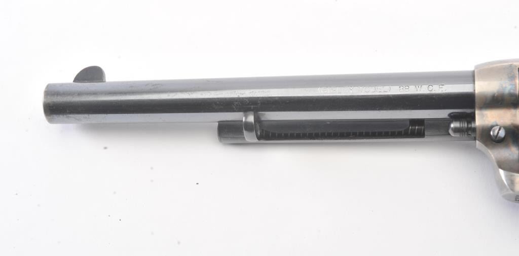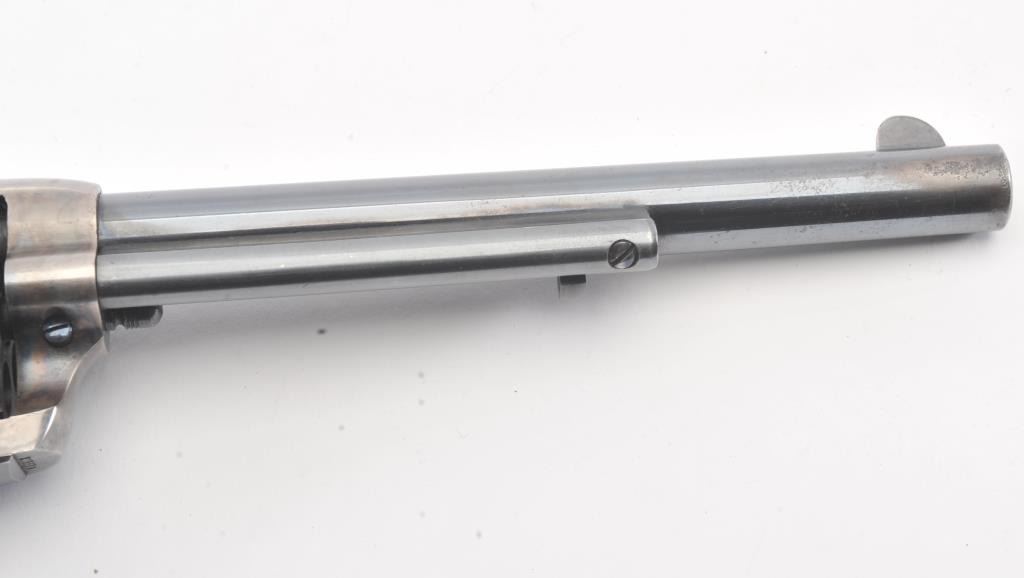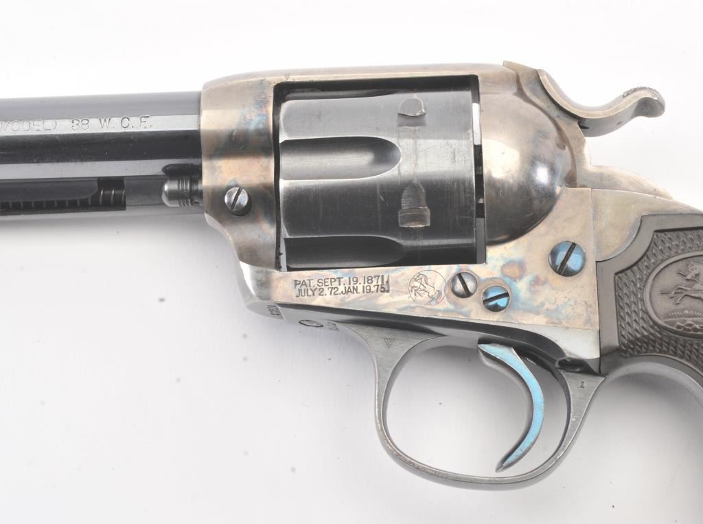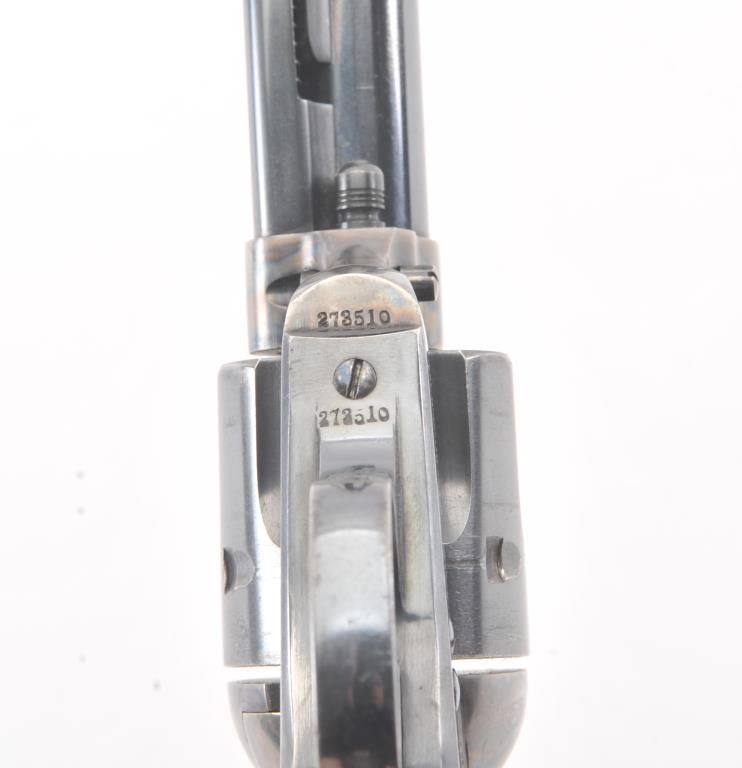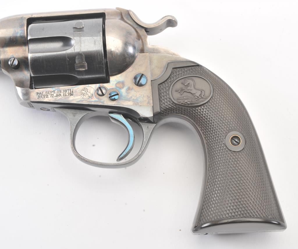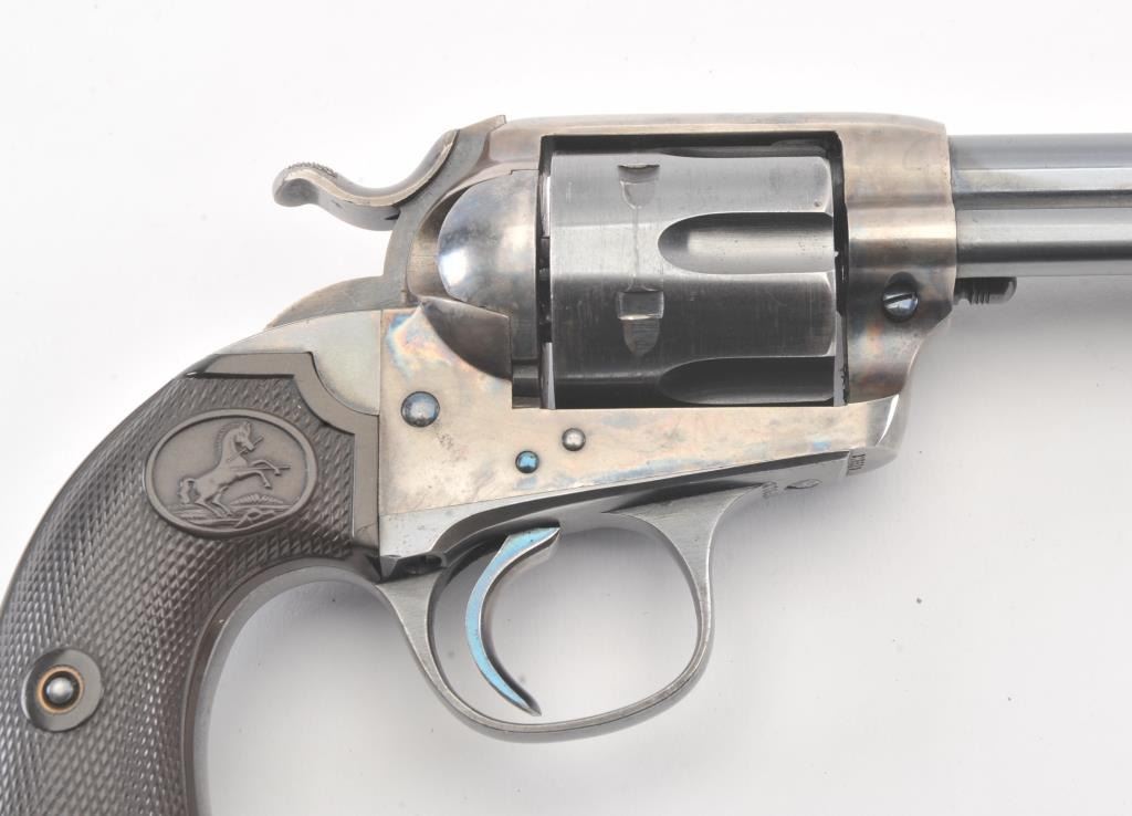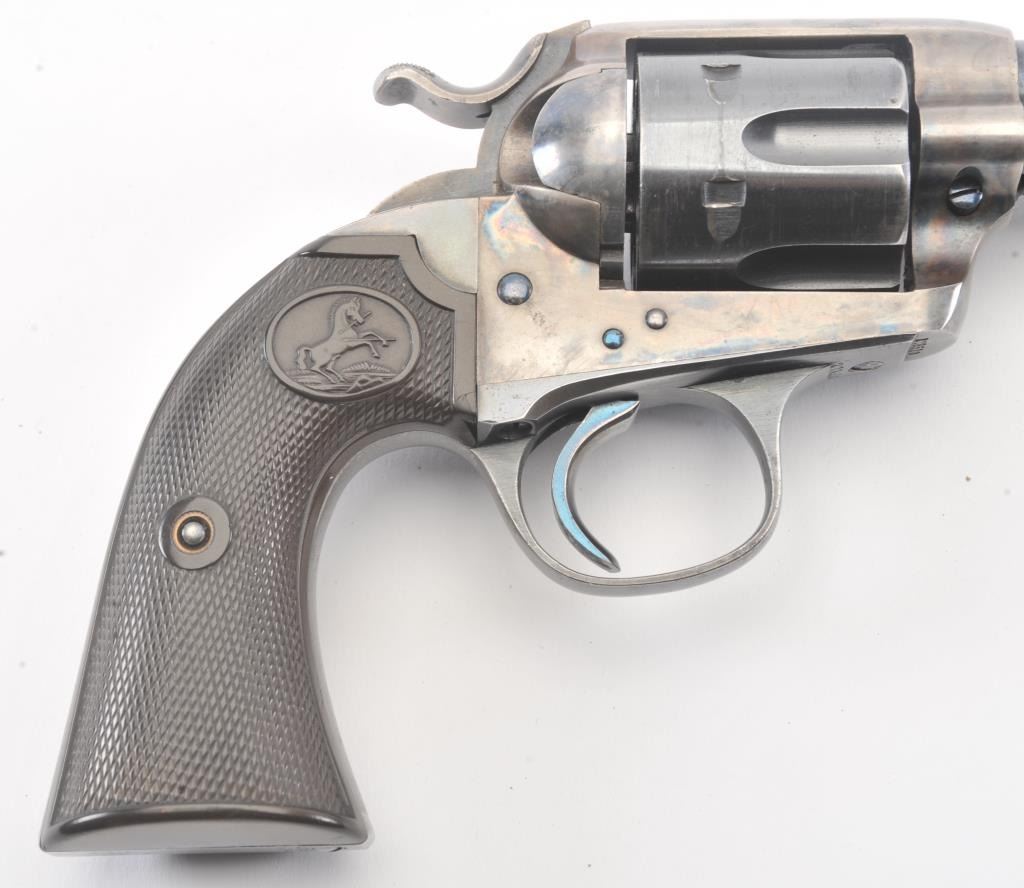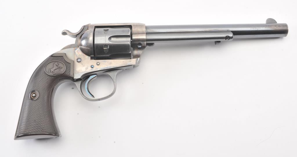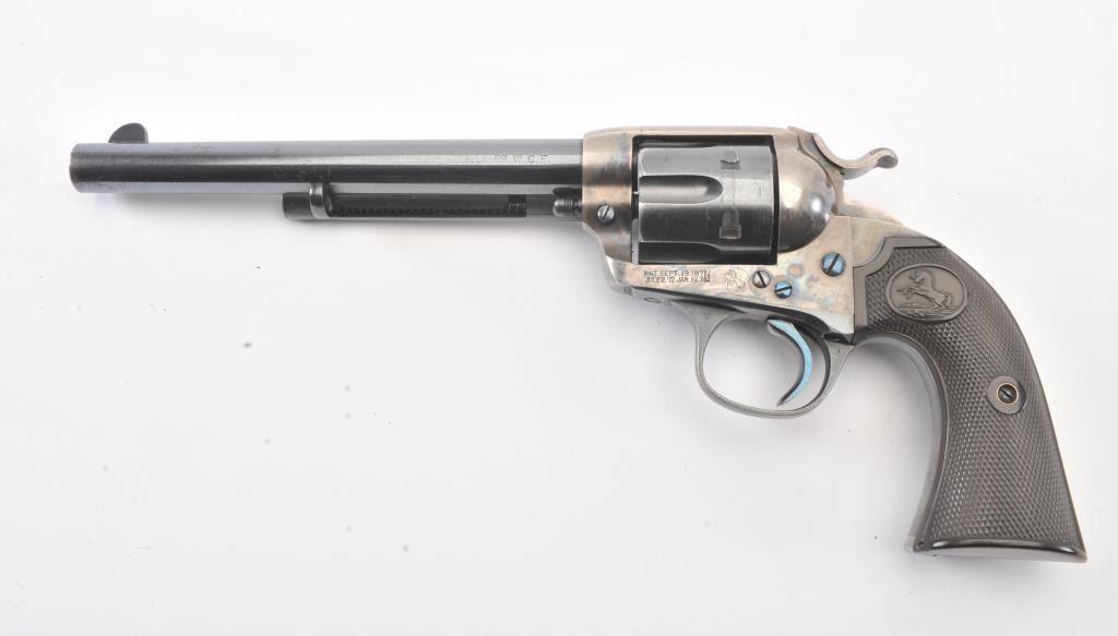 Colt Bisley Single Action revolver, #273510, .38 W.C.F. caliber, 7 ½” barrel, blue and case hardened, checkered hard rubber grips. This revolver remains in near fine original condition showing 75%-85% original blue andcase colors remaining with some pin prick pitting on the barrel towards the muzzle. The markings are sharp and the grips remain in very good condition. The action is crisp and the bore is very good. (C&R/PPT) Est.:$1400-2800