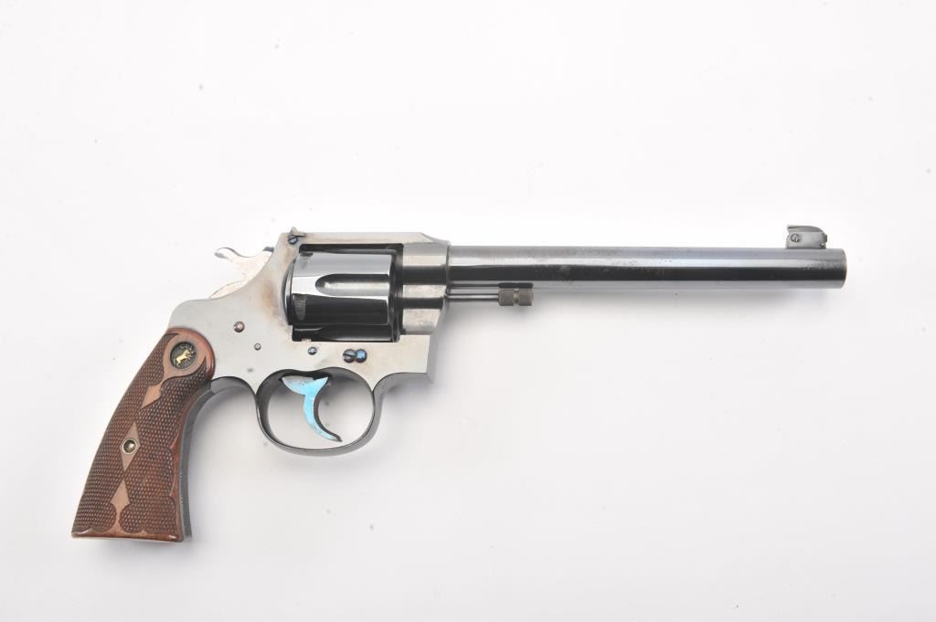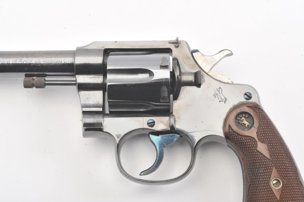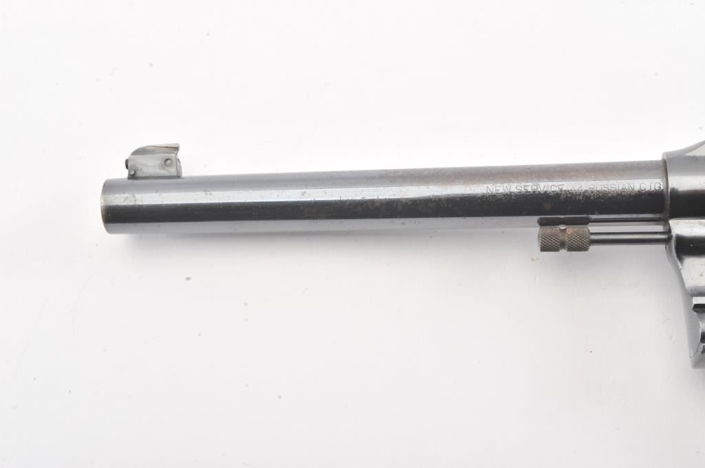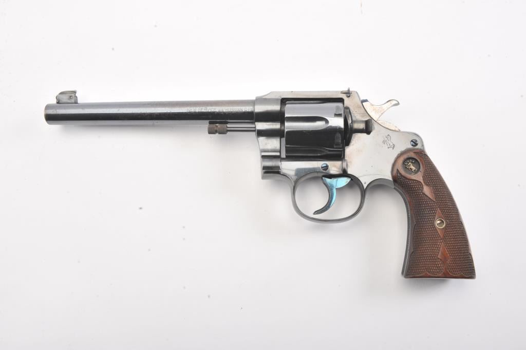 Colt New Service Flat Top Target DA revolver, #58516, .44 Russian caliber, 7.5” barrel, high polish blued finish, adjustable sights, checkered fleur-de-lis medallion wood grips. Revolver is in excellent overall conditionwith some scattered flaking to the finish on the top rear portion of barrel that has gone to a brown patina; crisp action, markings and grips. Colt records confirming features with stocks “Not Listed”; shipped to Abercrombie& Fitch Co., NY, NY on April 8, 1913, one gun in shipment. Letter available through Colt archives. (C&R/PPT) Est. $1400-2800