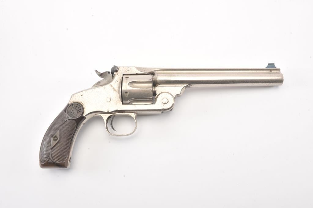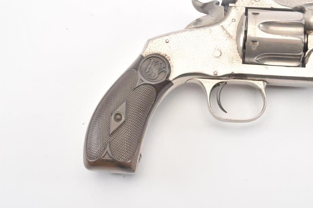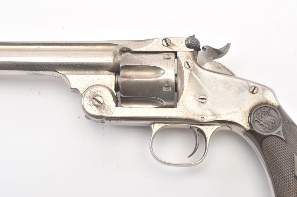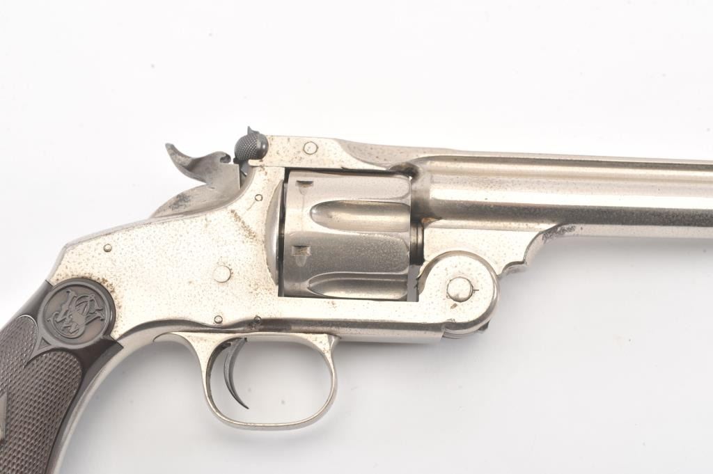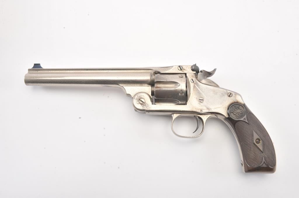 Smith & Wesson New Model No. 3 Target, Single-Action, #295, .32-44 caliber revolver. Nickel plated, hard rubber grips. The pistol remains in very good to near fine original condition with 80-90% original nickel. Someminor drifting and flaking, and areas where flaked gone to grey with some erosion and pinprick pitting throughout. Some minor scratches, good edges, sharp markings, bright original blue on sights andrelease latch.The cylinder shows an index line. The hammer shows some original case hardening. The grips are very good. The action is good, the bore is bright with some corrosion. (Antique) Est: $1400 - $2800
