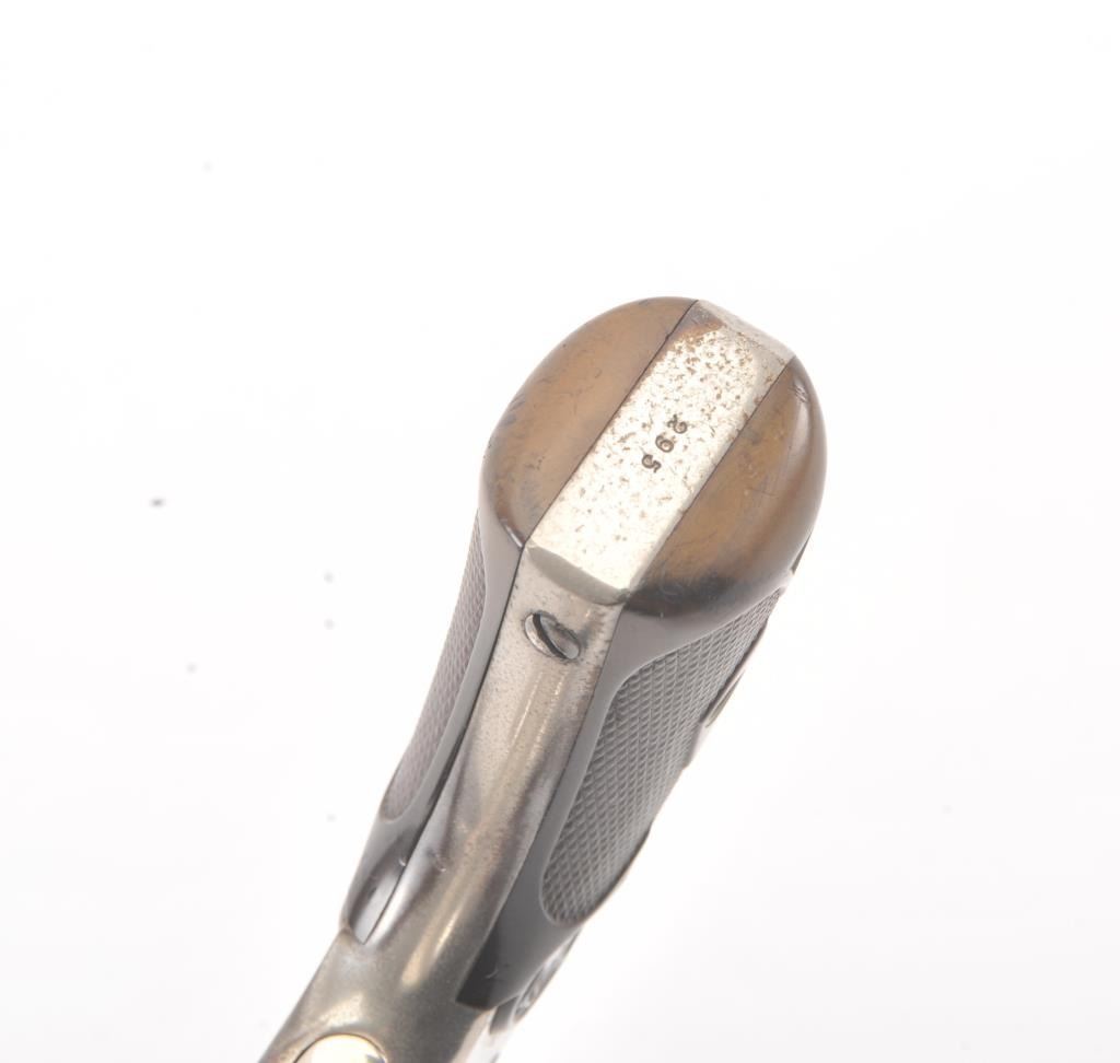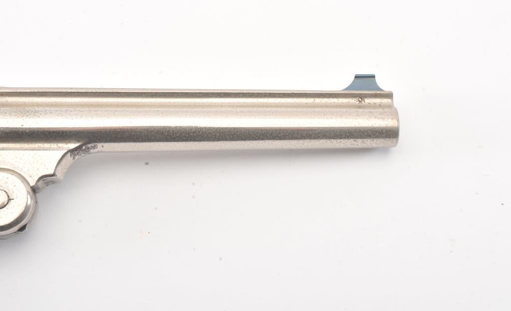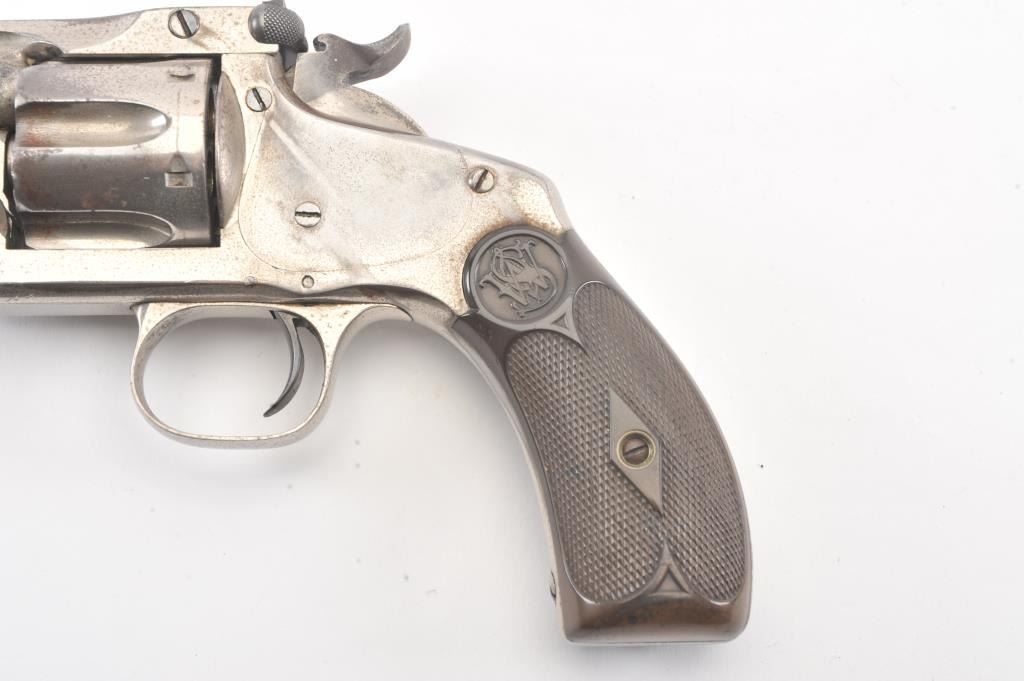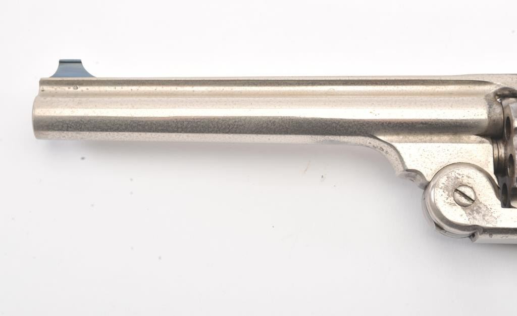 Smith & Wesson New Model No. 3 Target, Single-Action, #295, .32-44 caliber revolver. Nickel plated, hard rubber grips. The pistol remains in very good to near fine original condition with 80-90% original nickel. Someminor drifting and flaking, and areas where flaked gone to grey with some erosion and pinprick pitting throughout. Some minor scratches, good edges, sharp markings, bright original blue on sights andrelease latch.The cylinder shows an index line. The hammer shows some original case hardening. The grips are very good. The action is good, the bore is bright with some corrosion. (Antique) Est: $1400 - $2800