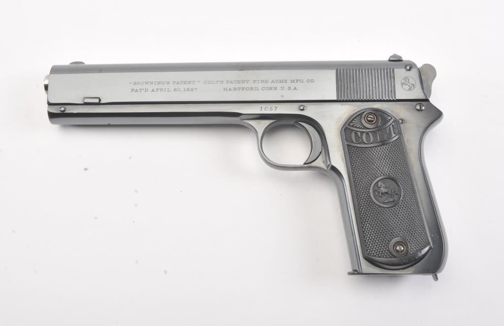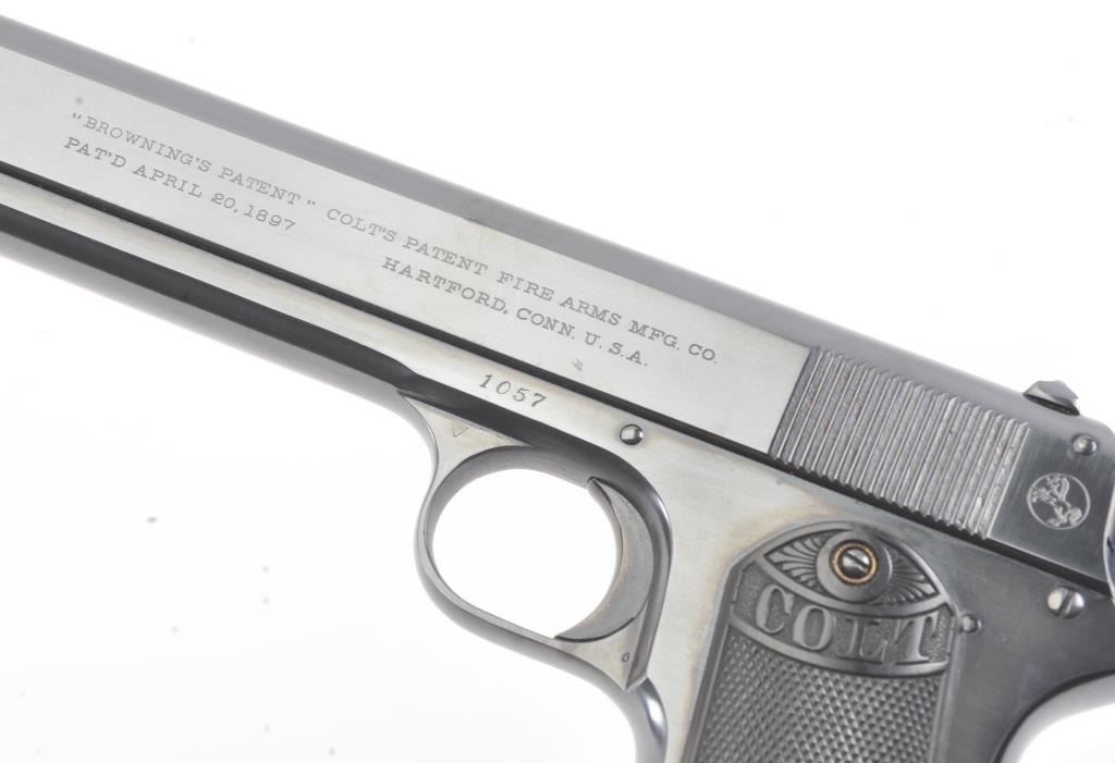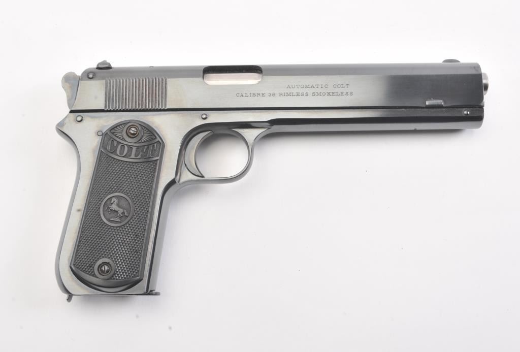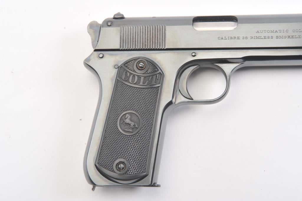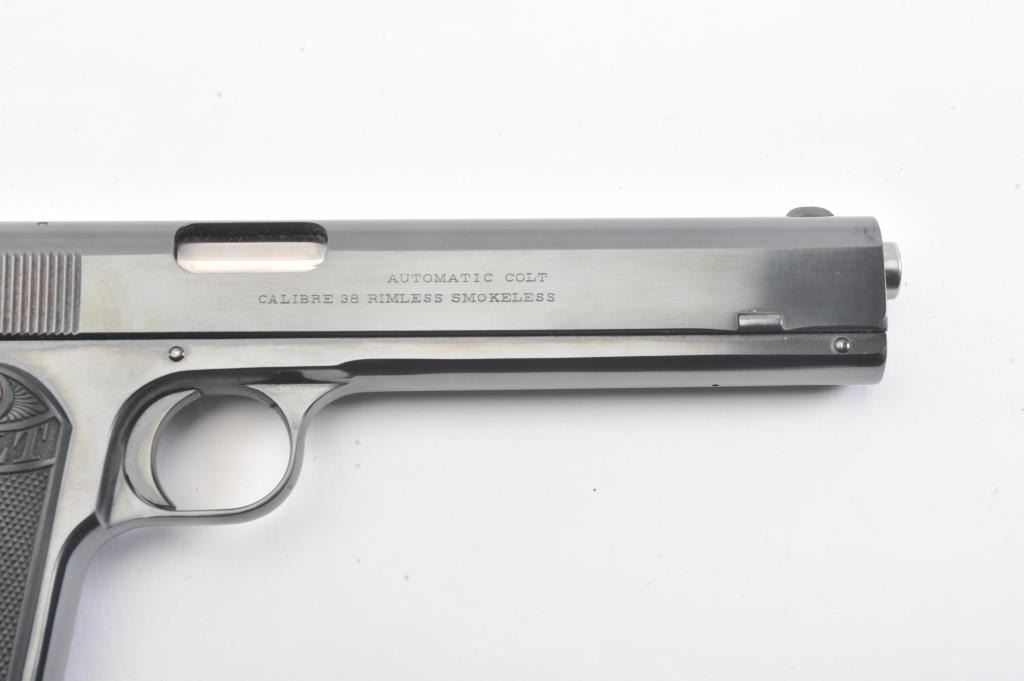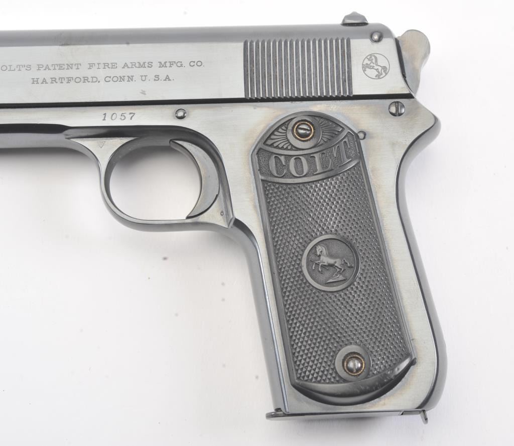 Colt 1902 Sporting semi automatic pistol, #1057, .38 Rimless cal. (.38 ACP), 6" barrel, blued finish, stub hammer, rear serrated slide, with checkered logo grips. The pistol is in near fine condition overall, showing99% excellent refinish, with fair bore, and tight action. The grips are replacement, and in near excellent condition. Less than 7,000 of these early automatics were manufactured between 1902 and 1928. Includes one replacement mag. (C&R/PPT) Est. $1400-2800